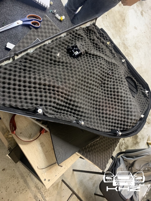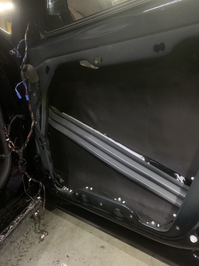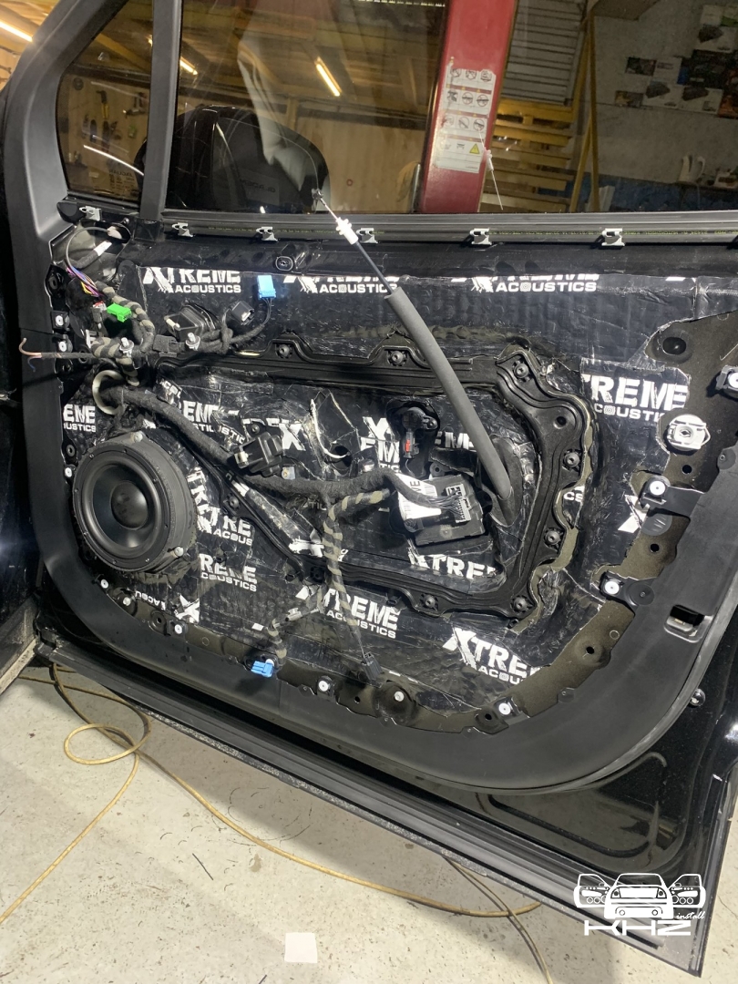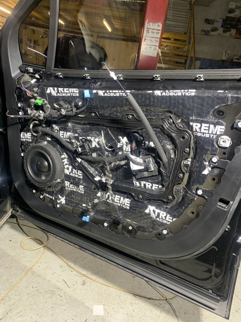 Початок як завжди з шумоізоляції дверей Jaguar I-Pace, розбираємо і наносимо перший шар Xtreme віброізолояція, кладемо в нахльост - і повністю закриваємо поверхню. Другим шаром наносимо тепло-шумоізолятор, у нас виходить сендвіч, який в основі гасить шум. Далі у нас йде частина дверей, де щит і стоїть динамік, його ми так само обробляємо і закочуємо повністю, так само робимо антискрип, того що може принести скрип. Так обробляємо передні двері і задні.. Також нам потрібно ще зробити дверні карти, на карту наносимо віброізоляцію пластами, щоб зміцнити пластик і далі наклеюємо матеріал хвиля, це шупоглатитель, який повністю ущільнить двері і погасить залишковий шум.