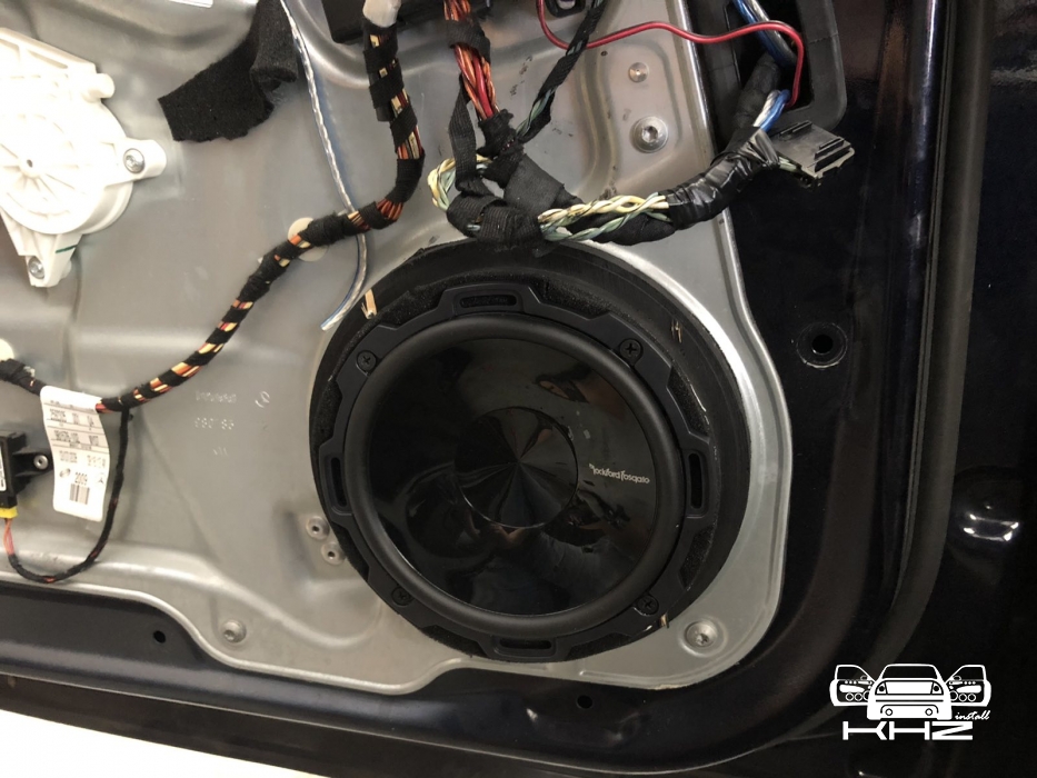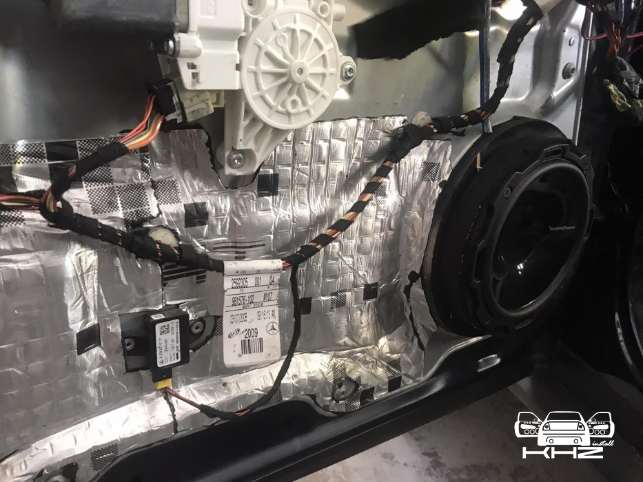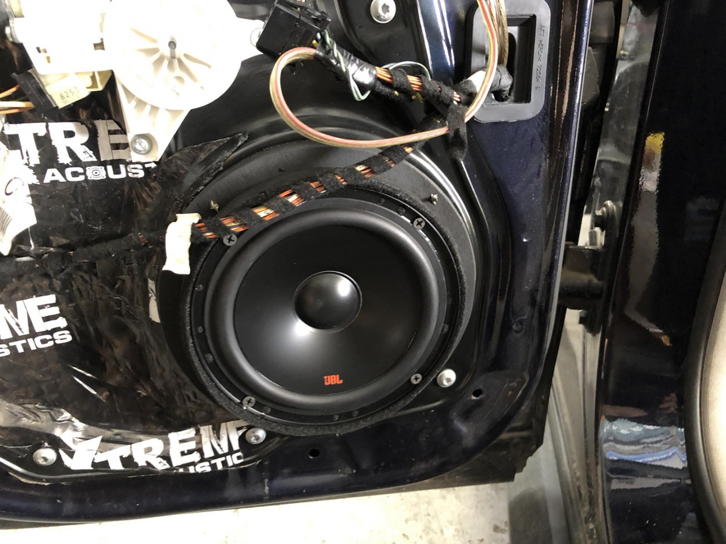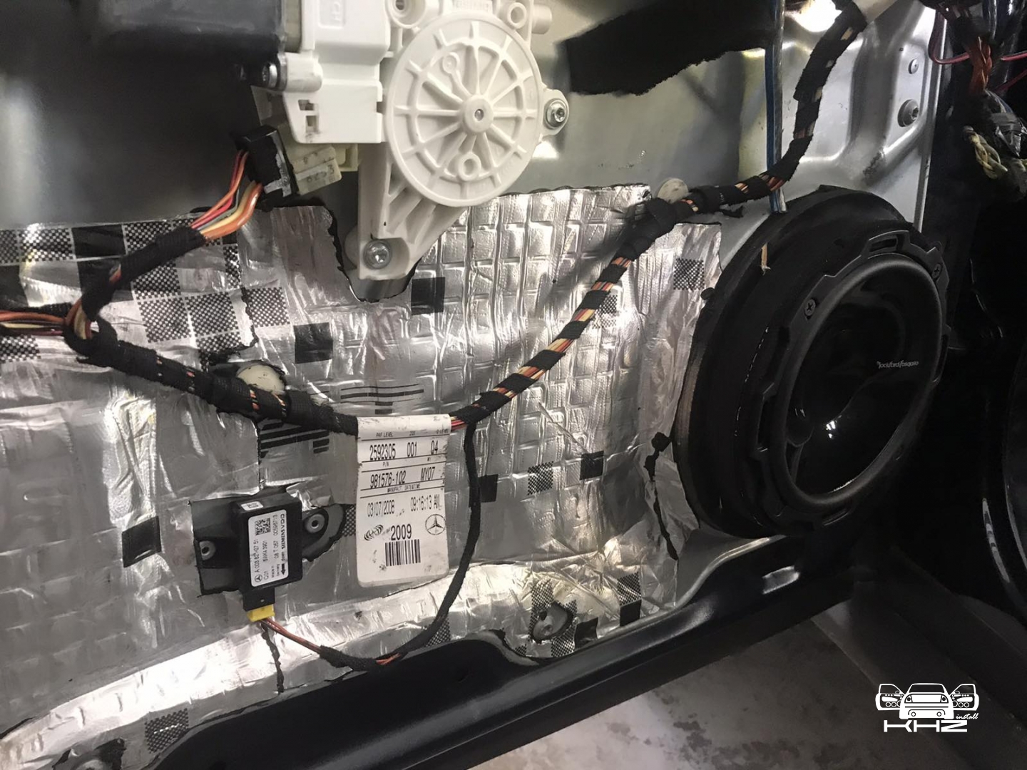 Наступний етап це встановлення нової акустики, задня акустика залишилася та, що була куплена раніше - це комплект бюджетного JBL Stage, її було вирішено залишити ззаду для підзвучки системи. Передній комплект ми запропонували встановити Rockford Fosgate PUNCH, даний комплект має дуже напористий звук з гострими твітерами, які можуть відмінно передати стиль музики рокк, і дуже хороша для електронної музики, вся акустика рамположилась в штатних місцях, і була встановлена через проставочні кільця з фанери, які ми робимо під кожен автомобіль окремо, і були пофарбовані для зовнішнього вигляду, і щоб менше пропускати вологу. До цього ми ще завели нову акустичну проводку з міді в двері, щоб незабаром, коли він заїде на другий етап, просто і швидко підключити до підсилювача звуку. Проставні кільця з фанери були встановлені на свої місця і міцно прикручені, і готові до підключення та встановлення акустики в Mercedes ML W164.