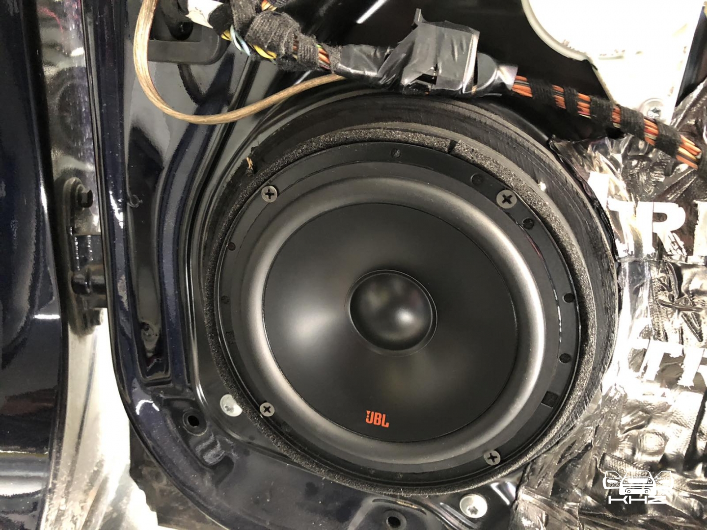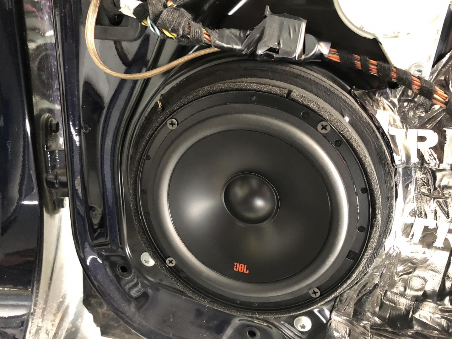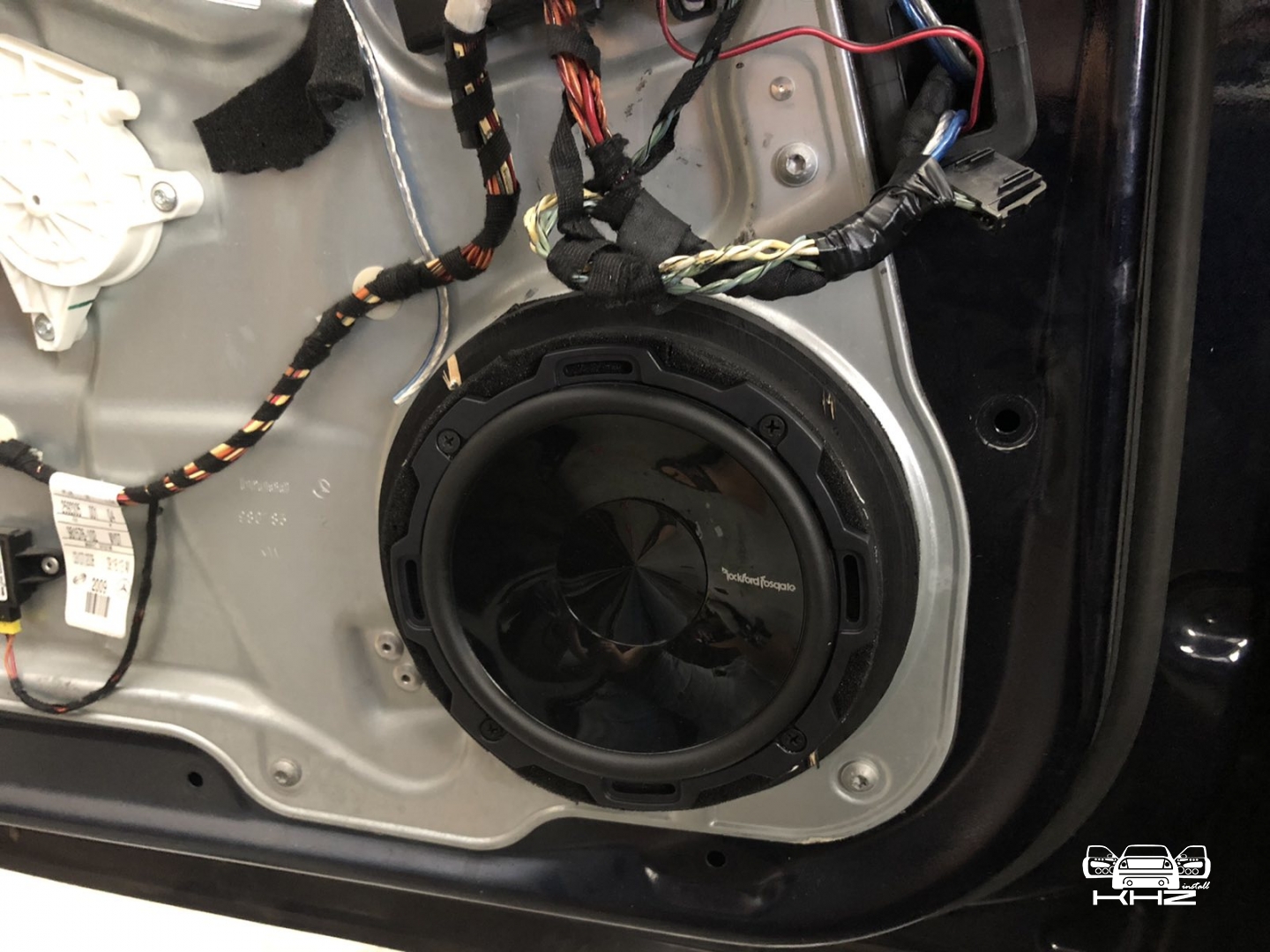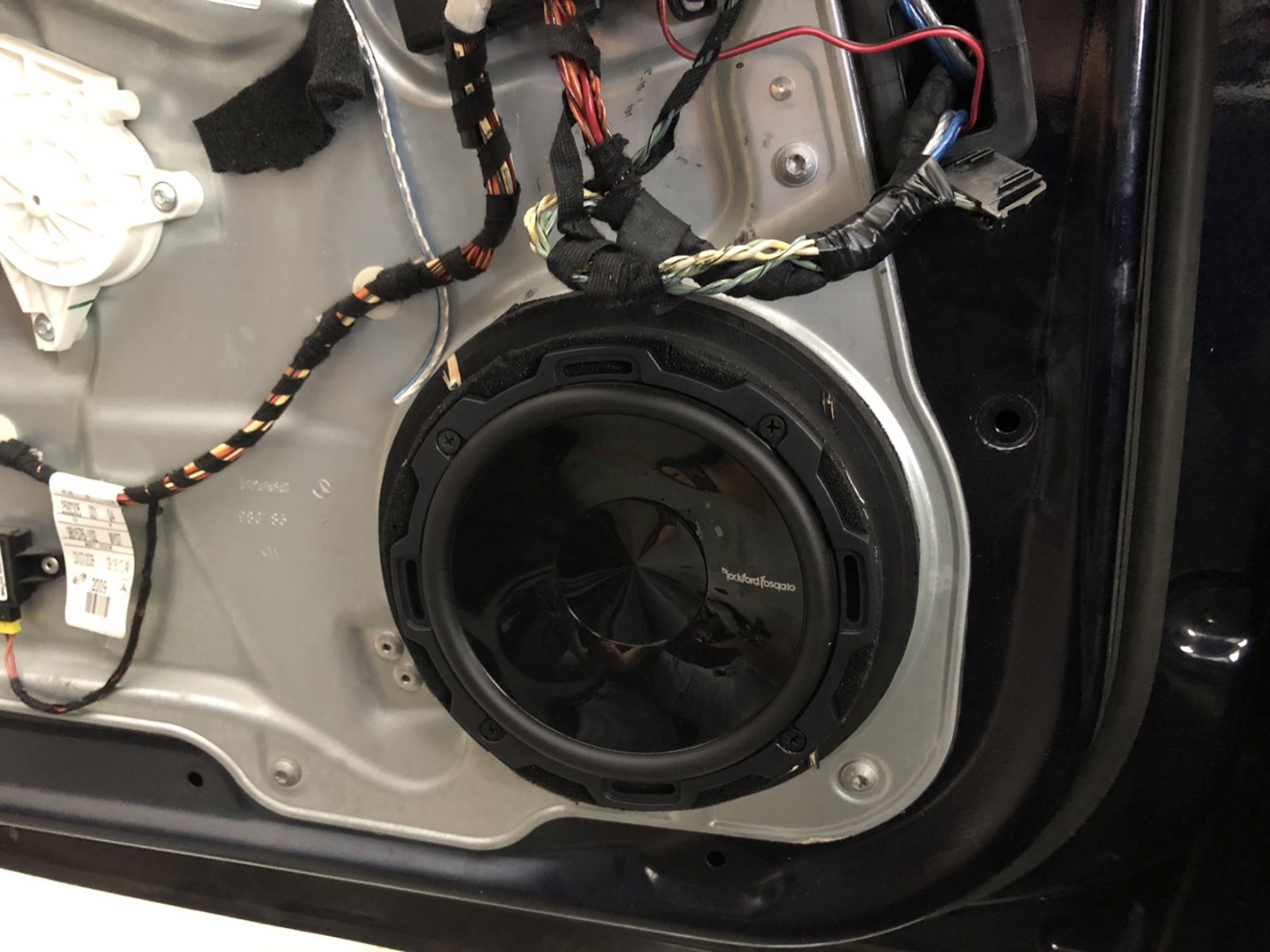 Наступний етап це встановлення нової акустики, задня акустика залишилася та, що була куплена раніше - це комплект бюджетного JBL Stage, її було вирішено залишити ззаду для підзвучки системи. Передній комплект ми запропонували встановити Rockford Fosgate PUNCH, даний комплект має дуже напористий звук з гострими твітерами, які можуть відмінно передати стиль музики рокк, і дуже хороша для електронної музики, вся акустика рамположилась в штатних місцях, і була встановлена через проставочні кільця з фанери, які ми робимо під кожен автомобіль окремо, і були пофарбовані для зовнішнього вигляду, і щоб менше пропускати вологу. До цього ми ще завели нову акустичну проводку з міді в двері, щоб незабаром, коли він заїде на другий етап, просто і швидко підключити до підсилювача звуку. Проставні кільця з фанери були встановлені на свої місця і міцно прикручені, і готові до підключення та встановлення акустики в Mercedes ML W164.