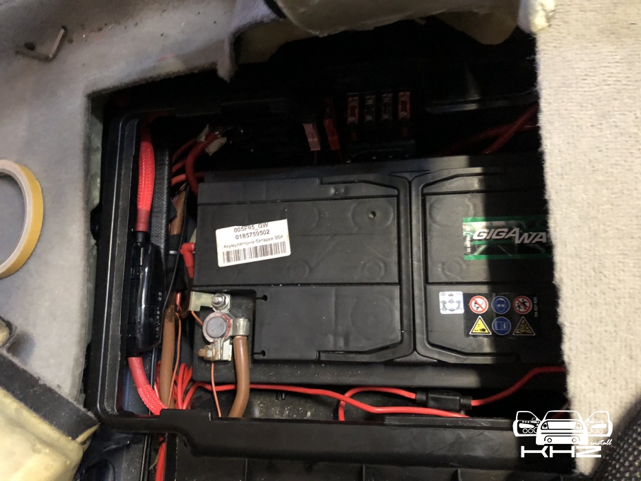 Акустика стоїть у своїх місцях, і тепер нам залишилося довести всю проводку для підсилювача звуку, його ми будемо розміщувати під задніми сидіннями, там місця дуже багато! Тим часом ми так само провели всю проводку для під'єднання активного сабвуфера, який призначений для встановлення під сидіння - але туди, нагадаю, він не вліз, тому ми його розміщуватимемо в багажнику, всю проводку проведено, запобіжник стоїть, проводку всю силову ми захищаємо обплетенням зміїна шкіра, щоб не допустити протирання проводів і пошкодження! Сабвуфер закріпили до сидінь за допомогою кріпильних гумок, так як до підлоги не можна нормально закріпити, там лежить гумовий килим. Сабвуфер бренду Ground Zero з 25 см дінаміком в плоскому коробі з плоским сабвуфером, рішення, звісно, не найліпше, але що поробиш, в будь-якому разі результат буде по низьких частотах!