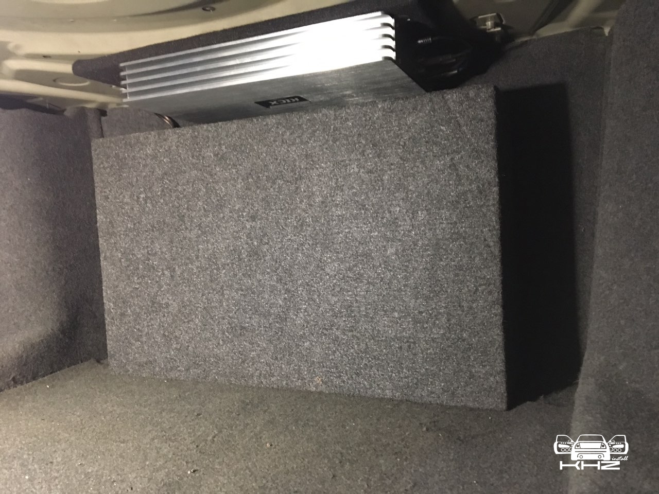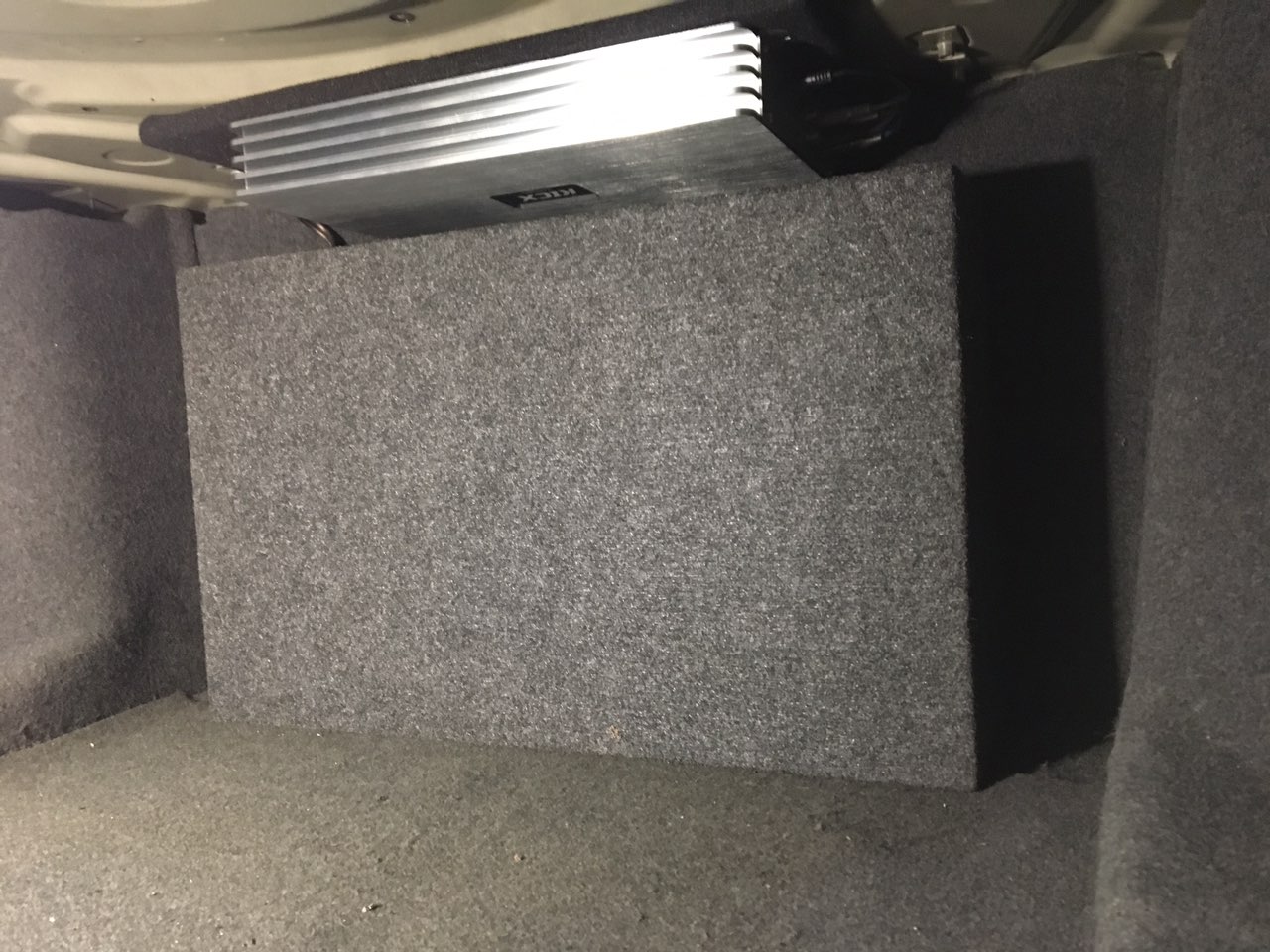 Короб ми встановили в багажнику сабвуфером у салон, і максимально добре закріпили його до металу, щоб він був не рухливий. І вийшла така ось картина: