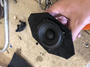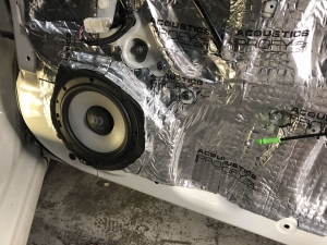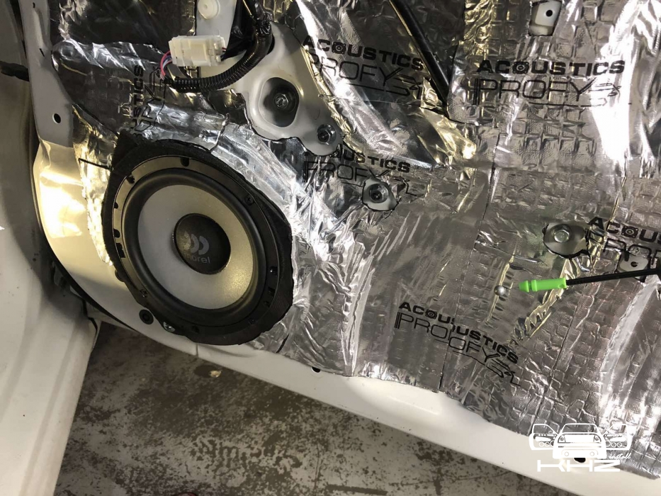 Далі у нас є ще мідбас і кросовер, який розділяє частоти між усіма динаміками, його ми розміщуємо під торпедою з двох сторін і готово. Мідбас, щоб встановити, потрібно зробити проставочні кільця з фанери, оскільки мідбаси мають стояти в дереві, фарбуємо і закріплюємо в штатне місце. Так само ми рекомендували зробити шумоізоляцію дверей, але замовник вважав за краще не робити повну, але ми порекомендували зробити тільки акустичне оформлення дверей. Ми викотили фільонку дверей віброізоляцією, тим самим закривши всі отвори в дверях, зробивши її типу закритим об'ємом для акустики, і так мідбас грає більш зібрано і виражено. Так само зробили антискрип карти щоб прибрати деренчання.