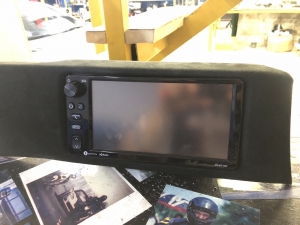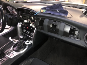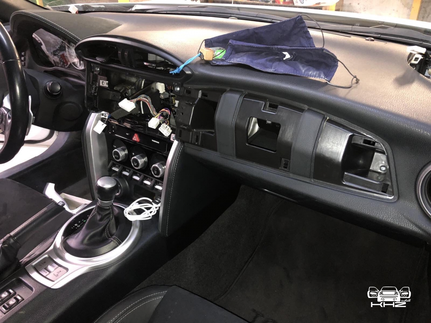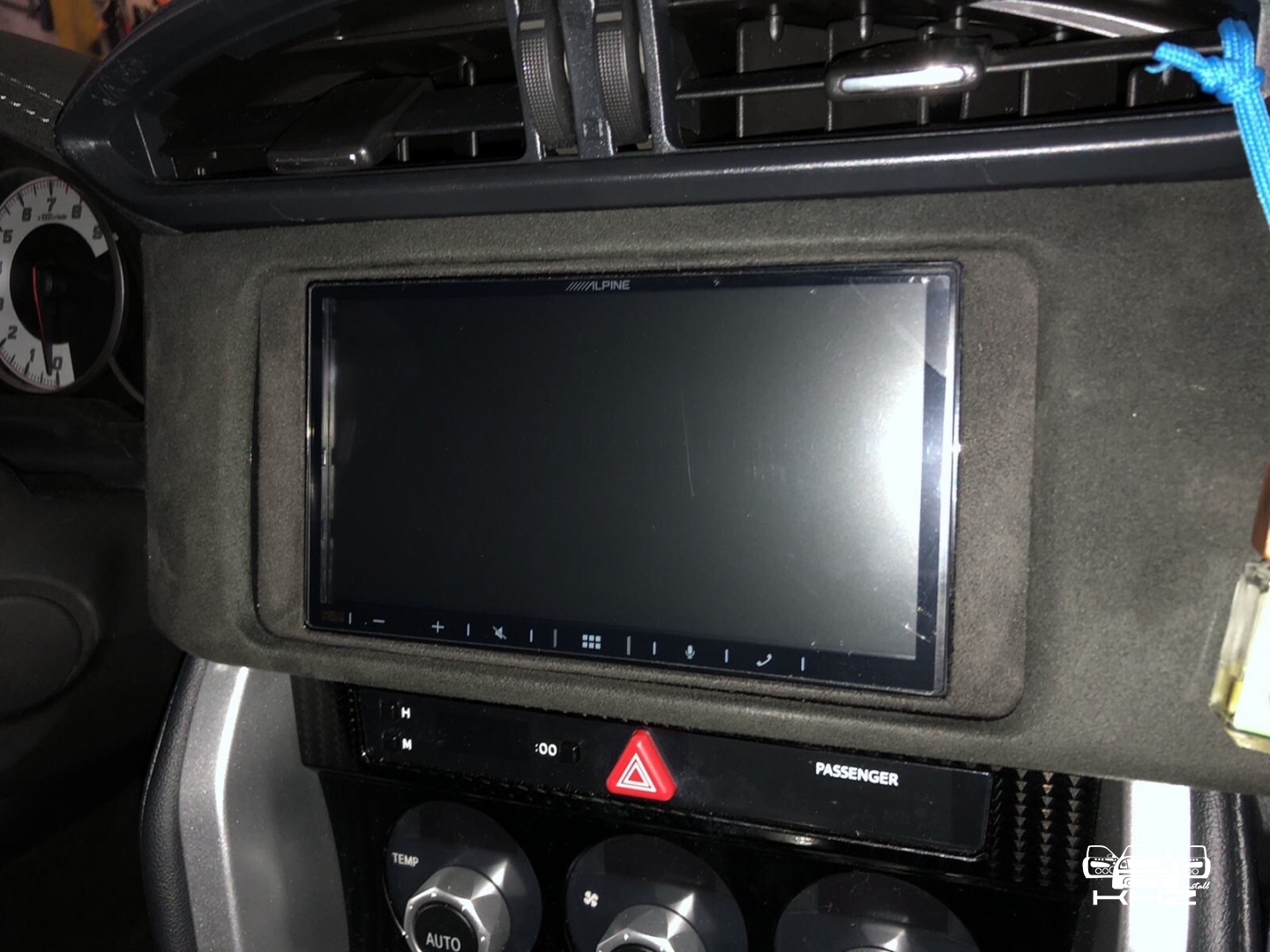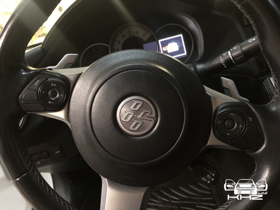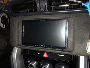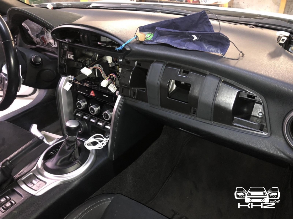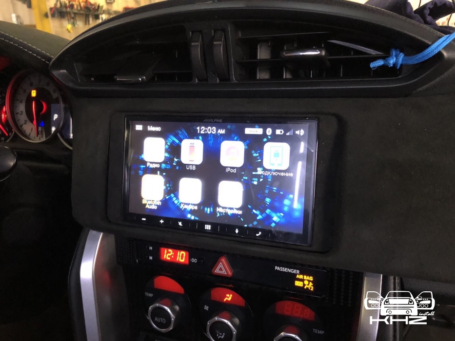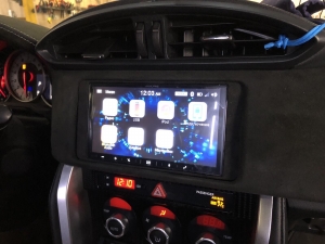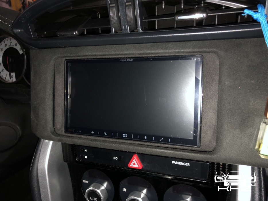 Для заміни ми підібрали фірмову магнітолу іменитого бренду Alpine, який без сумніву займає лідерство на ринку з виробництва якісних головних пристроїв в універсальному виконанні. І на нашу думку, це найякісніші як за складанням, так і за якістю звуку магнітоли. Для цього завдання ми вибрали магнітолу ALPINE ILX-W650BT - це одна з новітніх магнітол цього бренду і хорошим комплексом якісних функцій, це і блютуз аудіо з гучним зв'язком, якісний звук на виході, вбудована функція CarPlay, що дасть змогу дублювати екран смартфона й запускати додатки з телефона. Для установки даної магнітоли нам знадобиться перехідна рамка, ісо адаптер для того, щоб не різати штатну проводку, і адаптер кнопок на кермі, щоб подружити кнопки на кермі з новою магнітолою і сама магнітола. Ми знімаємо заводську магнітолу і приступаємо до встановлення нової, так як накладка на торпедо навколо магнітоли була затягнута алькантарою - ми прийняли рішення перетягнути і рамку в алькантару - щоб не було колгоспу повного. Усі адаптери для встановлення магнітоли в Toyota GT86 під'єднано, і приступаємо до встановлення рамки і закріплення магнітоли, виглядає це так: