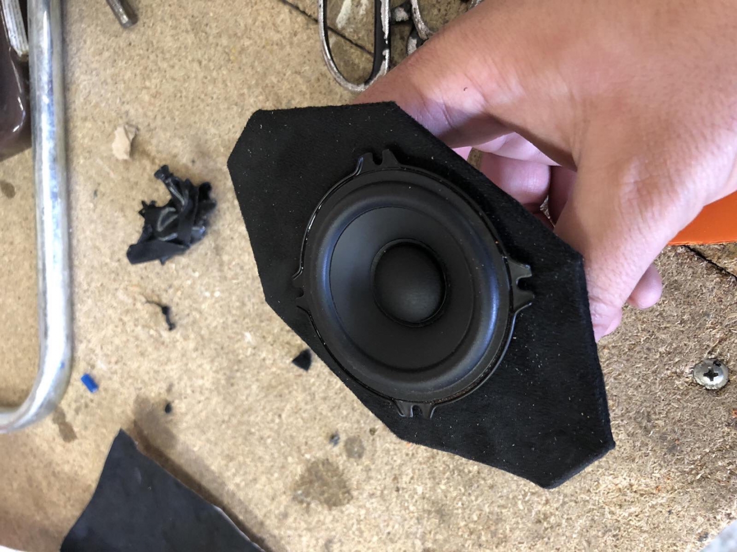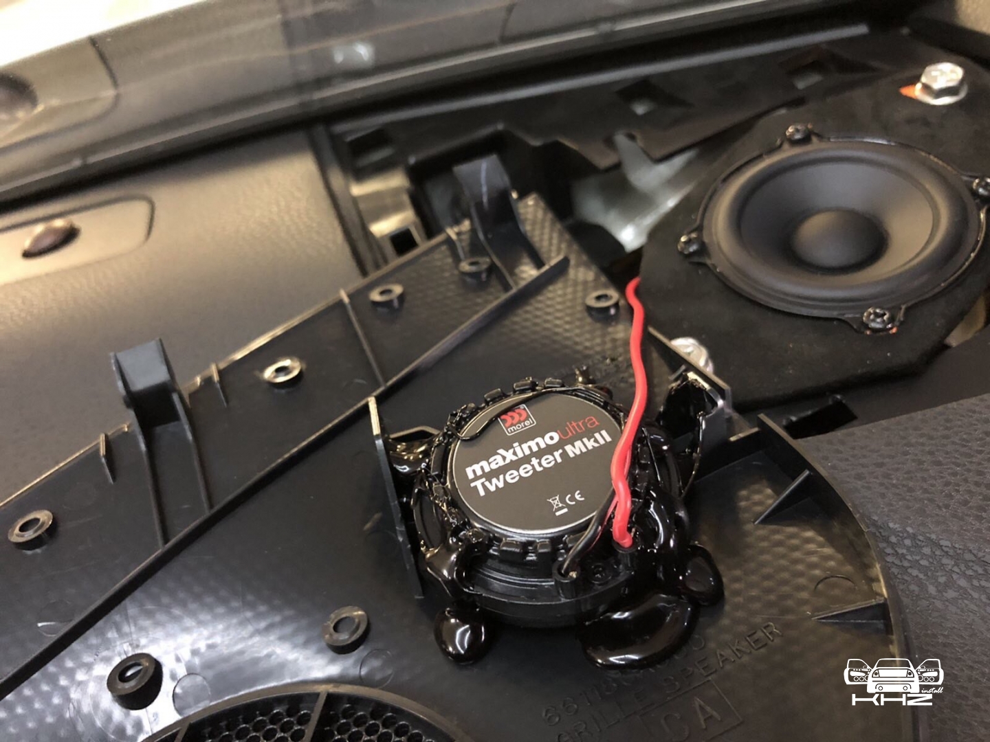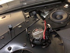Далі замовник просив без особливих доопрацювань поліпшити звук чисто заміною акустики, так як в двнннному автомобілі стоїть 3-х смугова система на фронті, будемо міняти так само на 3-х компонентну, для даного завдання ми підібрали акустику бренду Morel Maximo Ultra, яка шикарно грає без підсилювача від магнітоли, і має мега компактний СЧ динамік, який стане в штатне місце. Ми поміняли всю акустичну проводку для нової акустики на мідну, щоб отримати хорошу передачу сигналу. Штатне місце для встановлення твітера і НЧ динаміка в торпедо під лобовим склом, це, впринципі, хороше місце, бо лобове скло збільшить сцену, те, що потрібно. Твітер і СЧ динамік Morel встановлюємо в штатне місце, і виглядає це так: