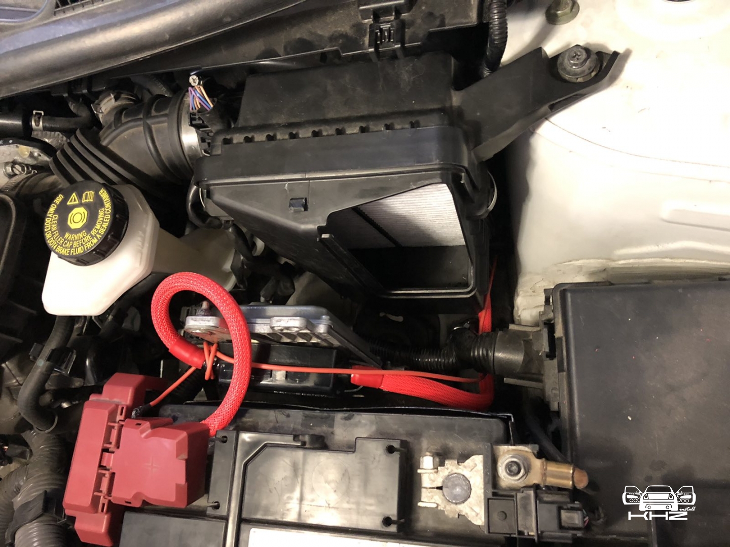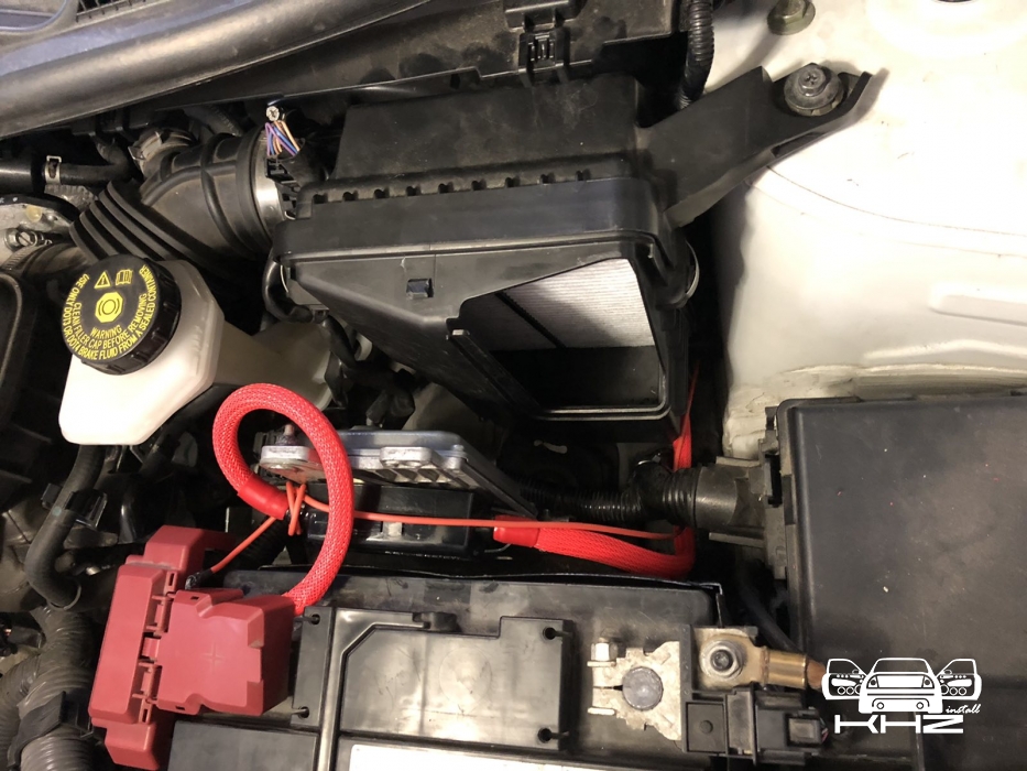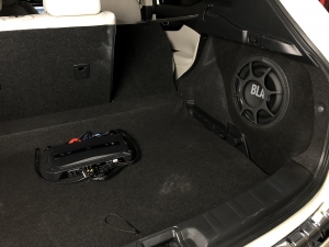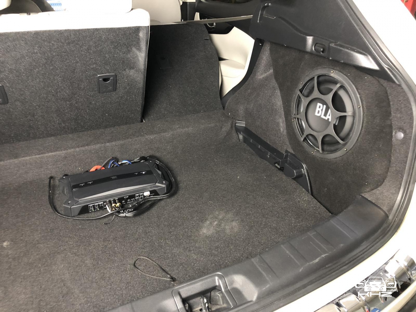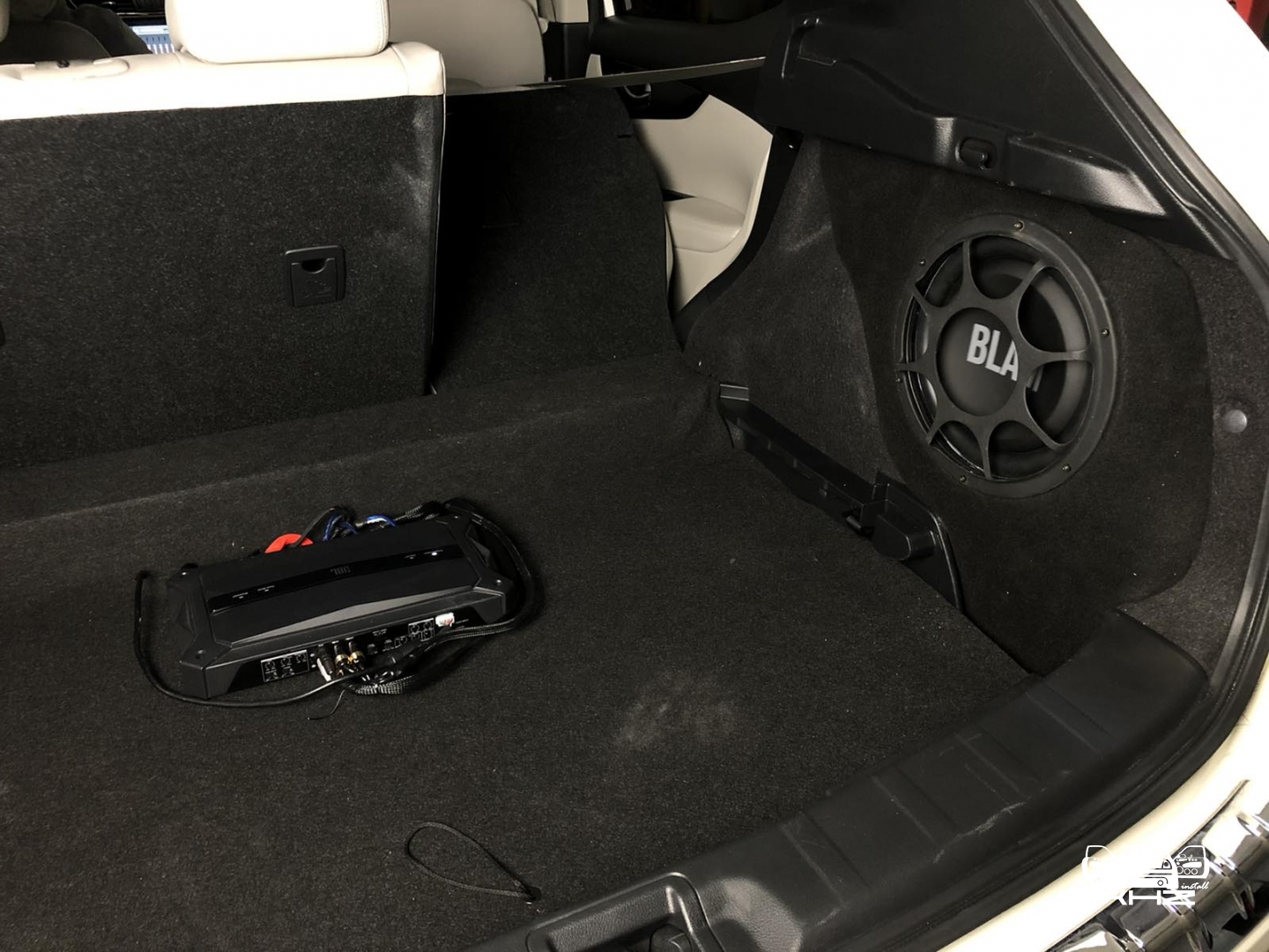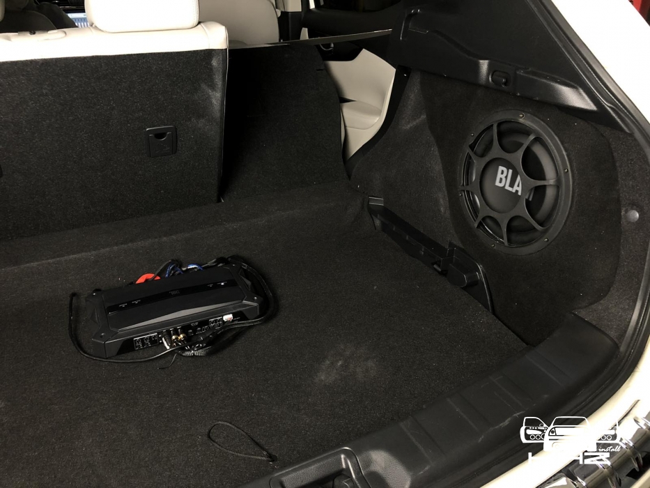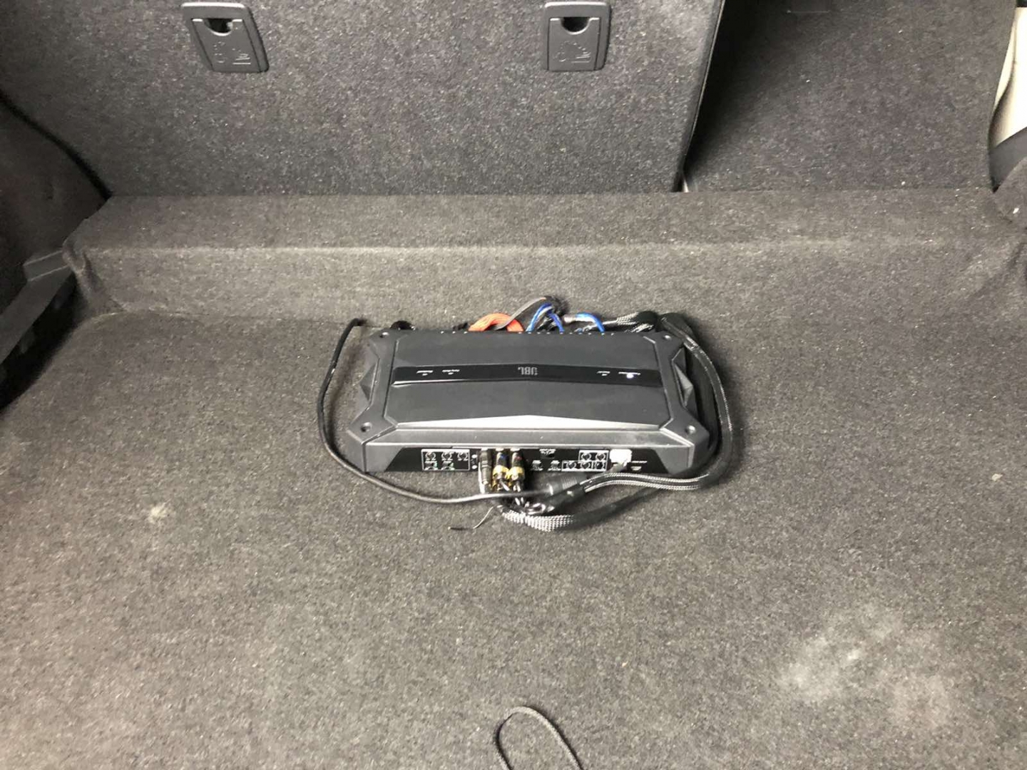 Переходимо до вибору і встановлення підсилювача звуку в Nissan Rogue, підсилювач нам потрібен був 5-ти канальний для того щоб зазвучати фронтальну акустику, тил акустику і сабвуфер. І одним з важливих факторів - потрібен підсилювач якісний і не дешевий, для того щоб максимально поліпшити сигнал з магнітоли і якісно його обробити, щоб видати хороший і чистий звук. Для цього завдання ми вибрали топовий підсилювач звуку від JBL серії GTR, це інноваційні підсилювачі звуку з вбудованим Bluetooth приймачем і модним виносним пультом. Так само до цього ми випробували його в інсталяціях у своїх автомобілях, і результатом його роботи ми були задоволені, тим паче, що ціна на нього була переглянута дистриб'юторами на кілька десятків відсотків! Розташування підсилювача звуку в Nissan Rogue було обрано під підлогою в багажнику, там є ніша, яка закривається підлогою, там йому буде комфортно як по охолодженню, так і по розміщенню далеко від агресивного середовища. Цей підсилювач має заявлену потужність, яка відповідає номіналам запобіжників, 4 канали по 75 Вт і 200 Вт на сабвуфер, для хетчбека це достатньо. Для під'єднання підсилювача звуку нам знадобиться проводка силова, акустична, і міжблочна. Все це ми підібрали за бюджетом і протягнули проводку салоном автомобіля, силову проводку ми захистили зміїною шкірою обплетення, щоб не допустити перетирань і пошкоджень проводки. Міжблочні кабелі провели від магнітоли до підсилювача. Підсилювач звуку ми закріпили в ніші за допомогою липучок, на випадок якщо його потрібно екстрено підняти, для безпечного зняття запаски.