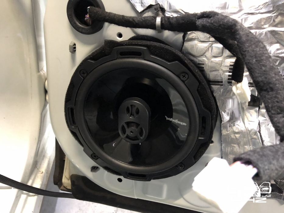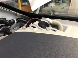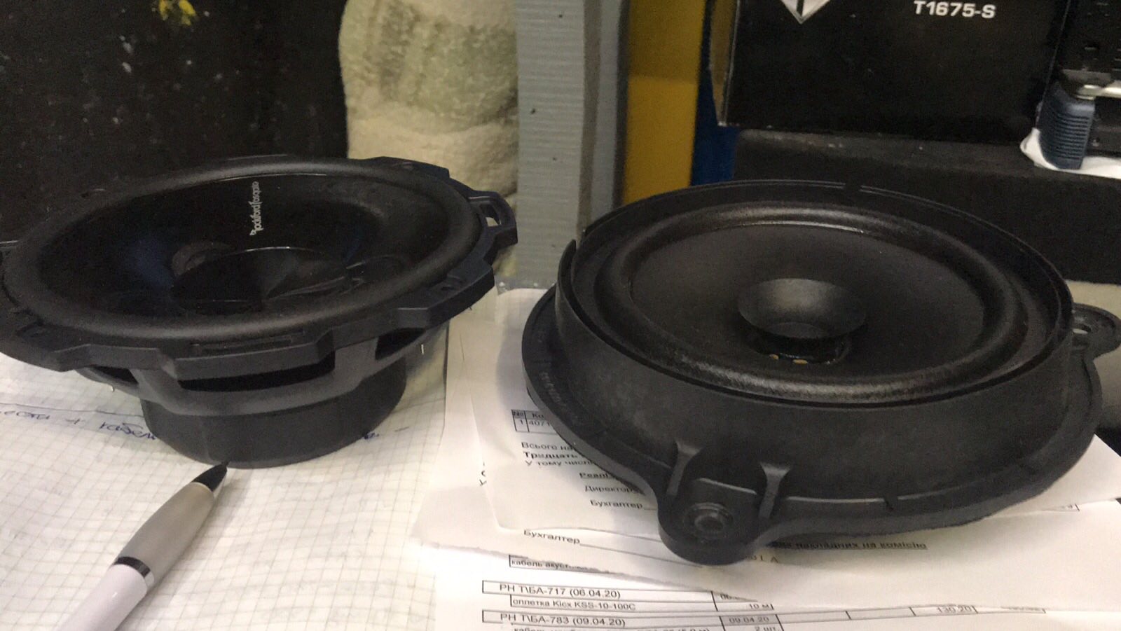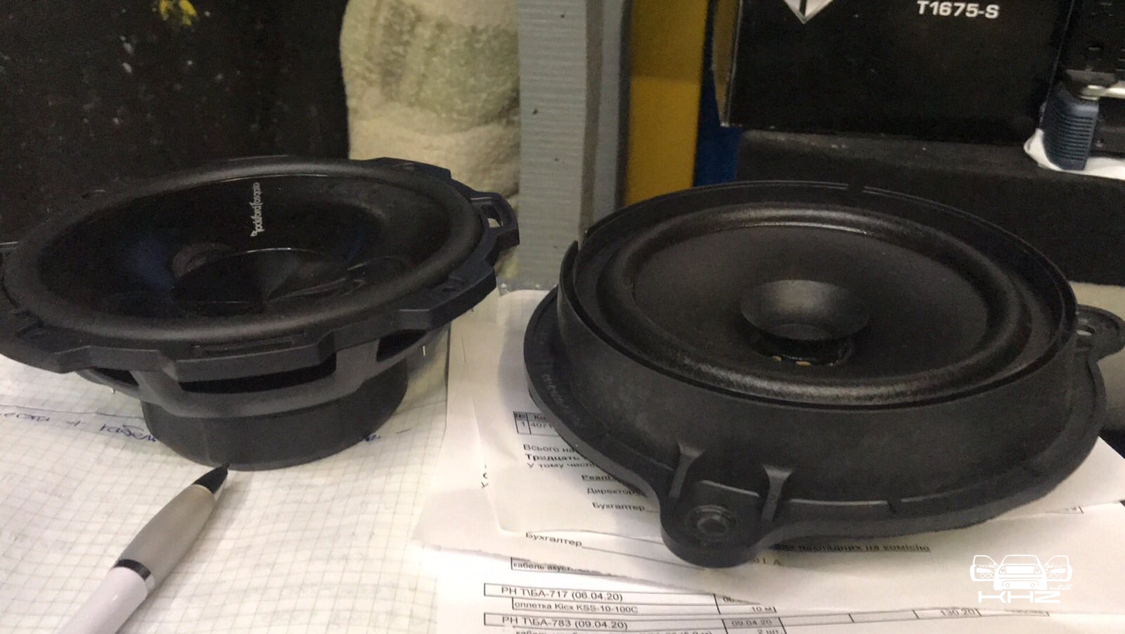 Далі ми вирізаємо проставочні кільця з фанери, так звані подіуми з фанери, вони потрібні, щоб висунути динамік уперед, і за правилами побудови хорошого звуку, кожен динамік має стояти в дереві! Ми їх пофарбували, для естетики і для того щоб менше впливала волога на дерево. Наступний етап - це встановлення акустики, щоправда, перед цим ми затягнули нову якісну мідну проводку в дверях, щоб не втратити потужність і поліпшити якість сигналу, що передається. І так перед побудовою системи ми дізналися, що замовник слухає електронну музику, тому обов'язково підбирати компоненти під стиль музики, яку слухає замовник, а не пропонувати те, що подобається саме вам без консультації із замовником. Для цього завдання за нашим досвідом і позитивними відгуками від попередніх замовників, ми запропонували встановити акустику Rockford Fosgate серії PUNCH, дана акустика заточена під напористий звук і витримує будь-які навали електронних інструментів, а також має більш різкий твітер, який видає соковиті і різкі звуки. Мідбаси були встановлені на подіуми, і твітера ми встановили в штатні місця, які розташовані під лобовим склом, що впринципі є правильним розміщенням. Виглядає це так: