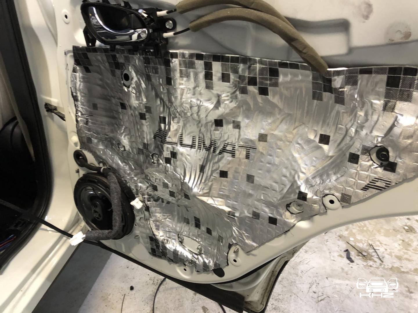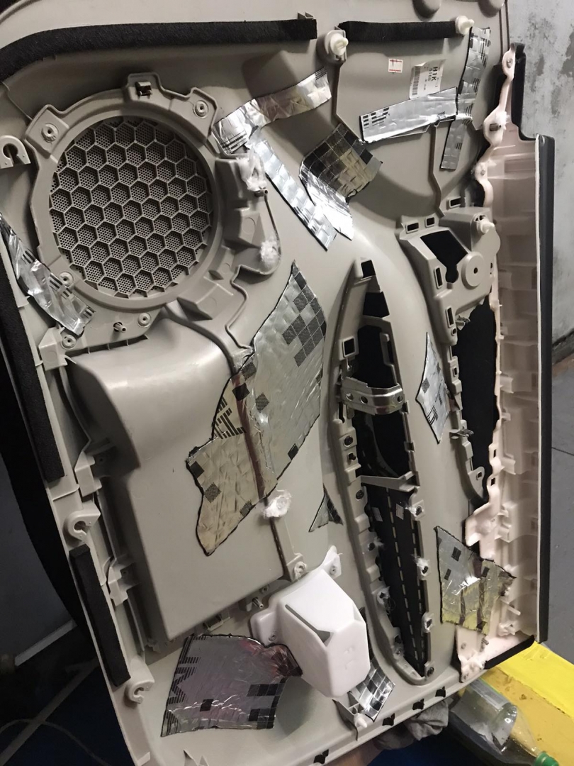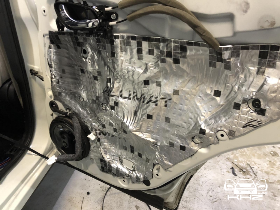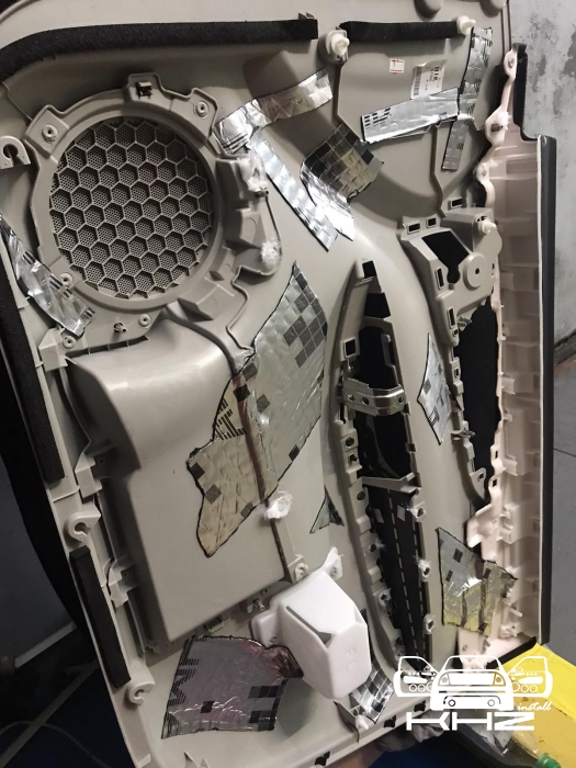 ШВІ робимо як завжди в 4 шари, перший шар віброізоляція всередину, на неї наносимо Тепло-шумоізолятор. Далі оформляємо фільонку дверей, там де стоїть динамік, закочуємо всі анатомічні отвори, тим самим зміцнюючи каркас дверей. І найостанніший етап - це підготовка пластикової карти, ми її обклеюємо шматками віброізоляції для того, щоб зробити її не такою кволою, а потім повністю затягуємо м'яким матеріалом, щоб прибрати всі скрипи і тертя пластику з металевими частинами дверцят.