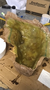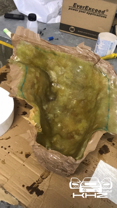 Далі виставляємо посадкове кільце з дерева, яке ми вирізали за допомогою фрезера з утопленням для сабвуфера і гриля захисного. Натягуємо спеціальну тканину, для формування лицьової стінки короба, і знову наносимо смолу, ЩОБ СФОРМУВАТИ ЛИЦО КОРОБА. Наступний етап, щоб не зіпсувати цю стінку і добре проклеїти посадкове кільце, ми зсередини наносимо скломат і смолу, шар за шаром, доти, доки не буде потрібної товщини, щоб стінка з кільцем не прогиналася і тримала вібрації сабвуфера.
