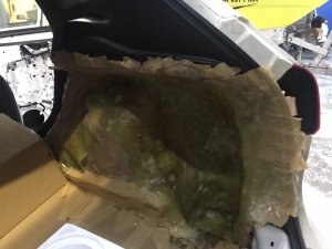 Фінальна стадія це виготовлення анатомічного сабвуфера стелс в крило автомобіля Nissan Rogue Кашкай. Для цього завдання ми будемо використовувати праве крило автомобіля, воно глибше, і нам підходить. Правда сабвуфер туди підійде тільки FLAT плоский, щоб не різати заводську обшивку, ми запропонували таке рішення, у вигляді одного з найбільш плоских сабвуферів, це новинка цього року BLAM RELAX RS 10. Це 25ти сантиметровий сабвуфер, з мінімальною посадкою і непоганою заявленою потужністю, те що потрібно для невеликого короба в крилі, і для хорошої басової ланки. Виклеюємо двома скотчами крило і робимо матрицю зі склотканини і смоли, далі зміцнюємо виріб і обрізаємо за контурами, позначеними нами.
