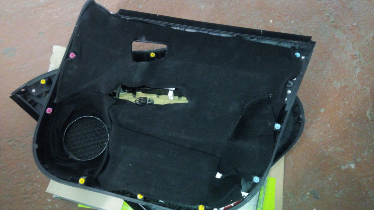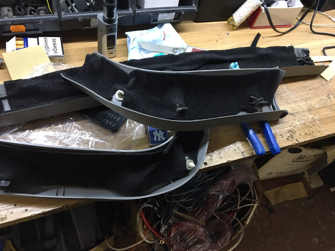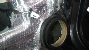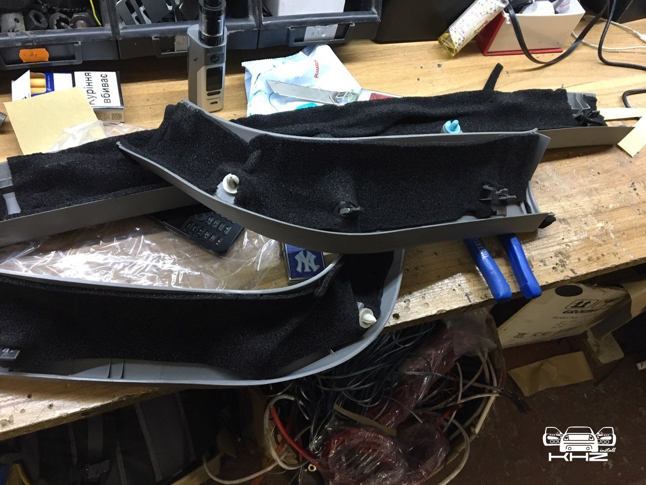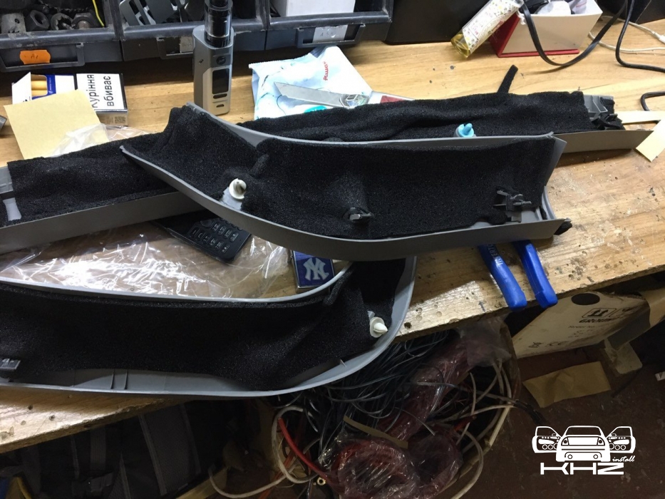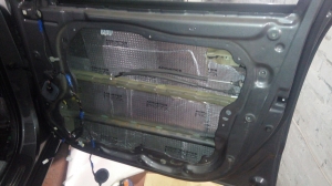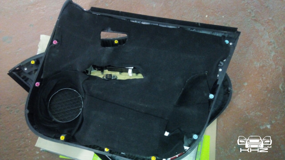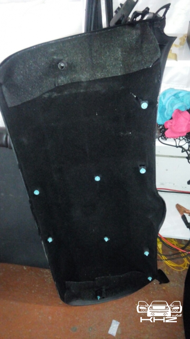 Два шари готові, переходимо до фільонки, тут вона виконана як щит, обробляємо його повністю - це третій шар, який гасить шум і додає щільності місцю, де стоять динаміки. Так само обробили карти, за допомогою армування карти і обклеюванням м'яким матеріалом, щоб прибрати всі тертя і зменшити шуми в салоні.
