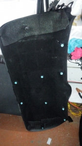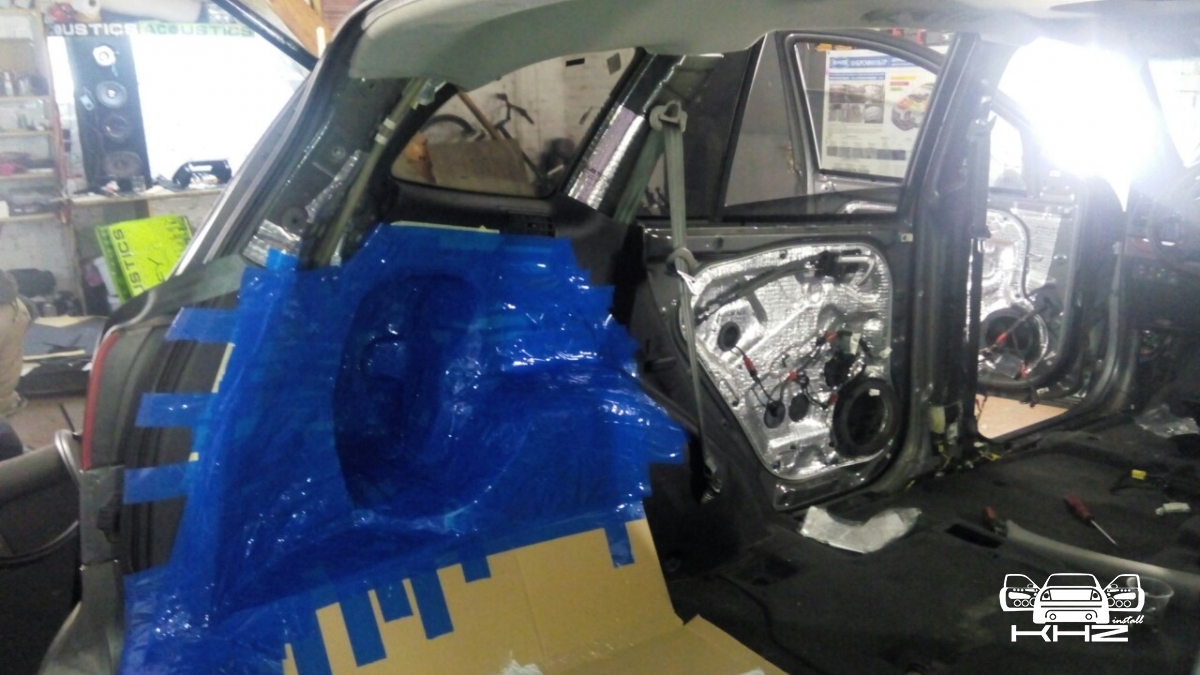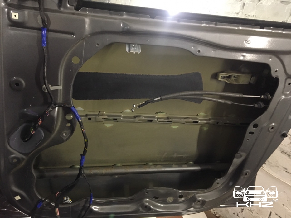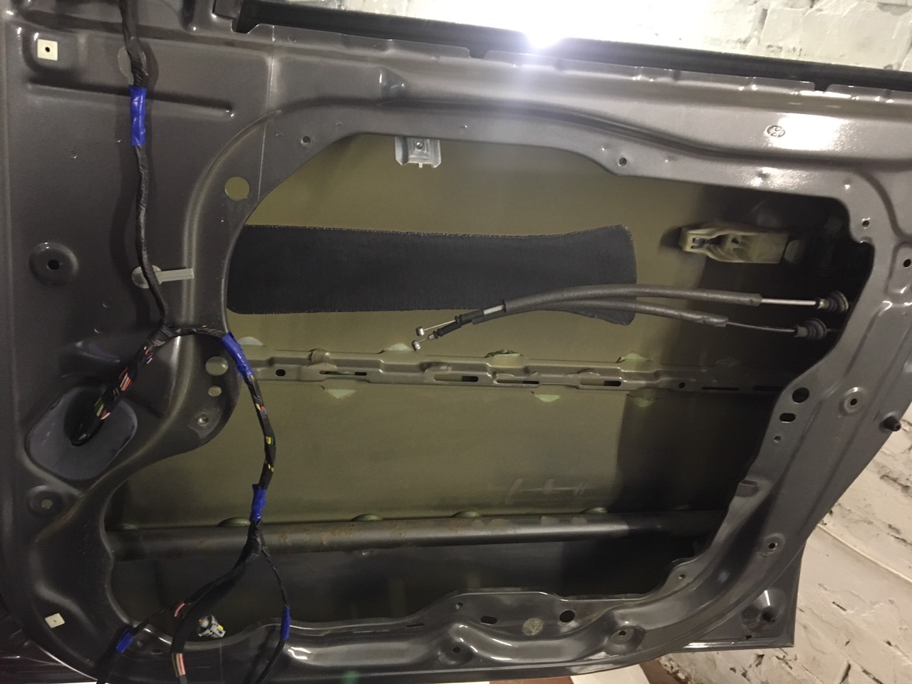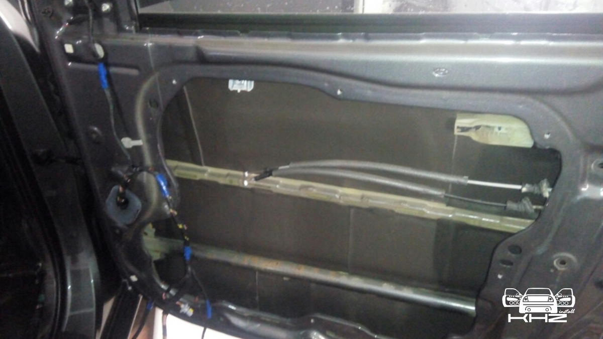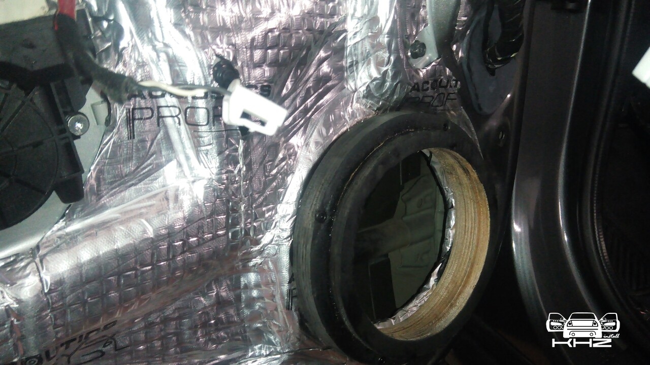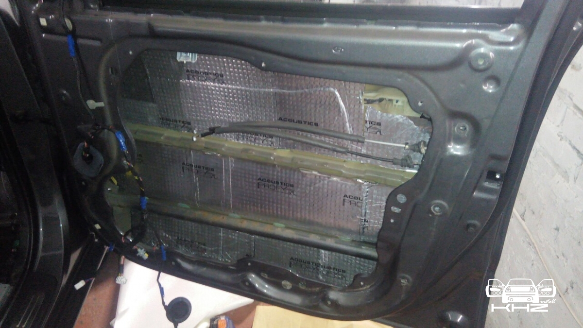 Два шари готові, переходимо до фільонки, тут вона виконана як щит, обробляємо його повністю - це третій шар, який гасить шум і додає щільності місцю, де стоять динаміки. Так само обробили карти, за допомогою армування карти і обклеюванням м'яким матеріалом, щоб прибрати всі тертя і зменшити шуми в салоні.