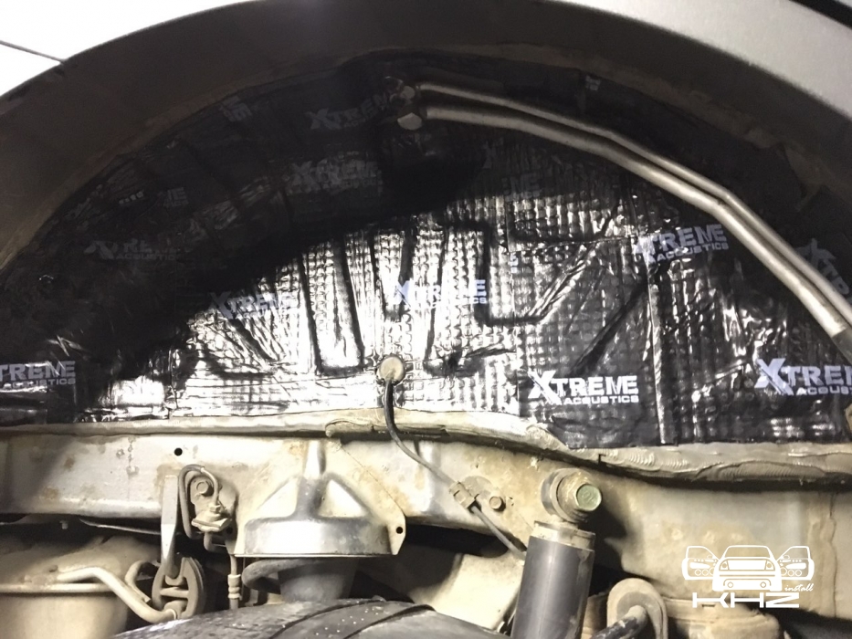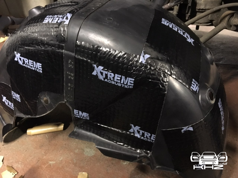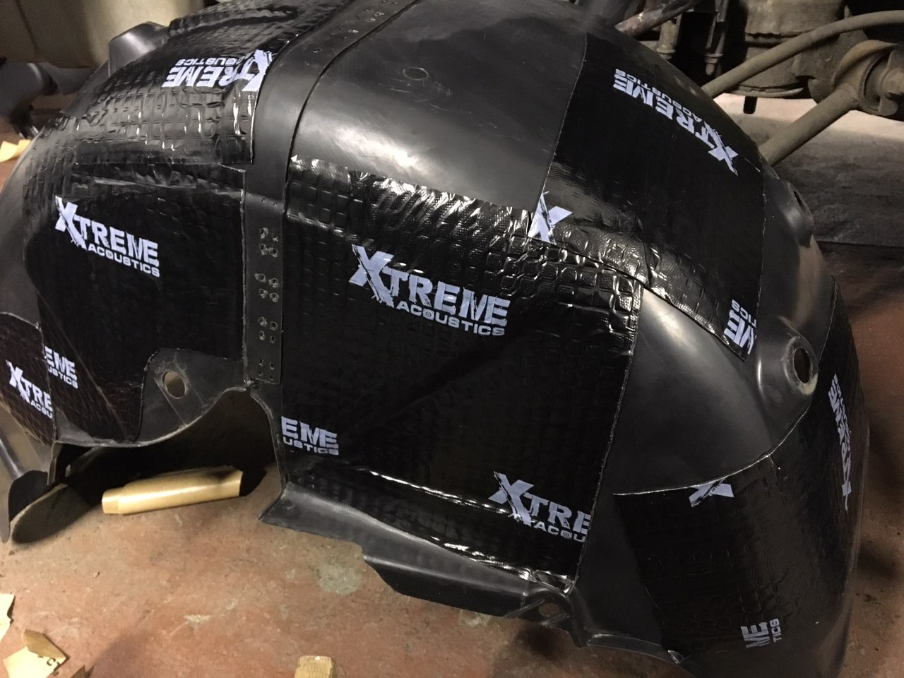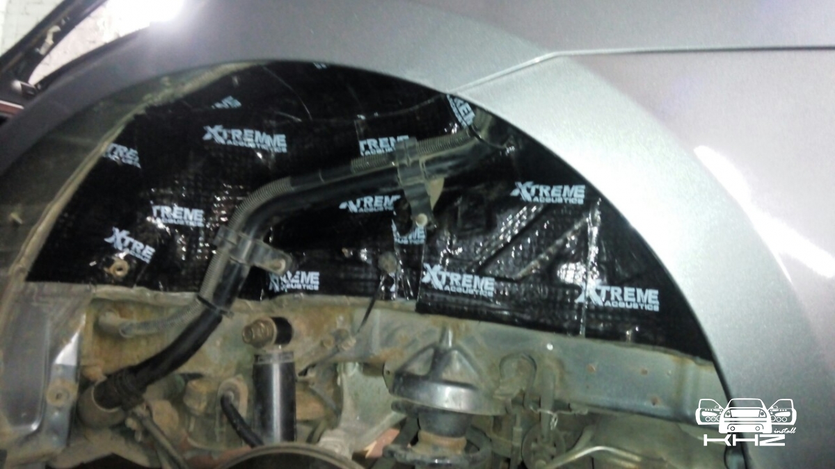 Далі колісні арки, ми знімаємо колеса, знежирюємо все і обклеюємо як метал за підкрилком, так і сам підкрилок частково, щоб прибрати з нього резонанс і шум від піску, води і дороги.