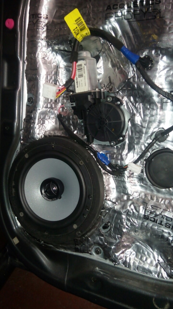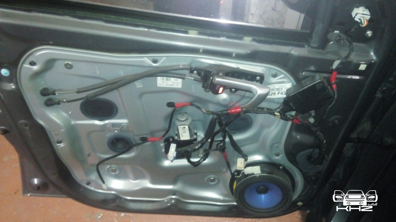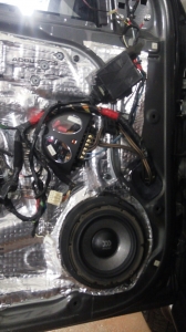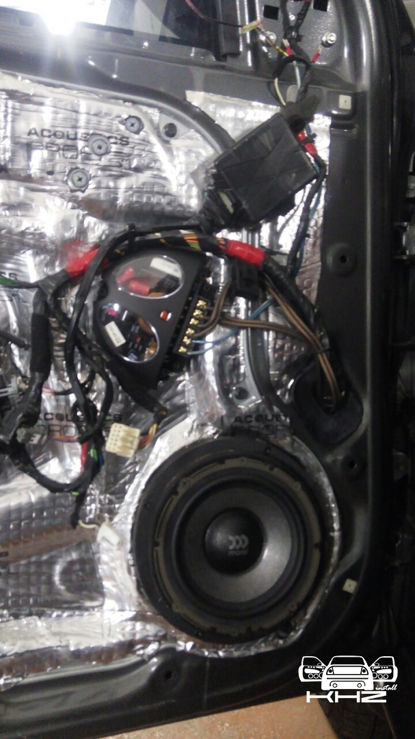 Тепер коли автомобіль обезшумлений і шумоізоляція Hyundai SantaFe вийшла на новий рівень, перейдемо до побудови нової акустичної системи з усіма новими елементами. І так що ж було заплановано зробити: - встановити нове гу з широкими можливостями налаштувань і високим рівнем сигналу - встановити два підсилювачі звуку, один для акустики, другий для сабової ланки - на фронт поставити акустику високого класу в компонентному виконанні - на тил акустику простіше, так би мовити для подзвучки - виготовити анатомічний сабвуфер в крило з цікавим сабвуфером, який би доповнив систему. Ось якось так, процес нижче: Було виготовлено проставочні кільця з фанери, для встановлення акустики, і закріплено до щитів, також усю акустичну проводку ми завели в двері від підсилювачів безпосередньо до динаміків.