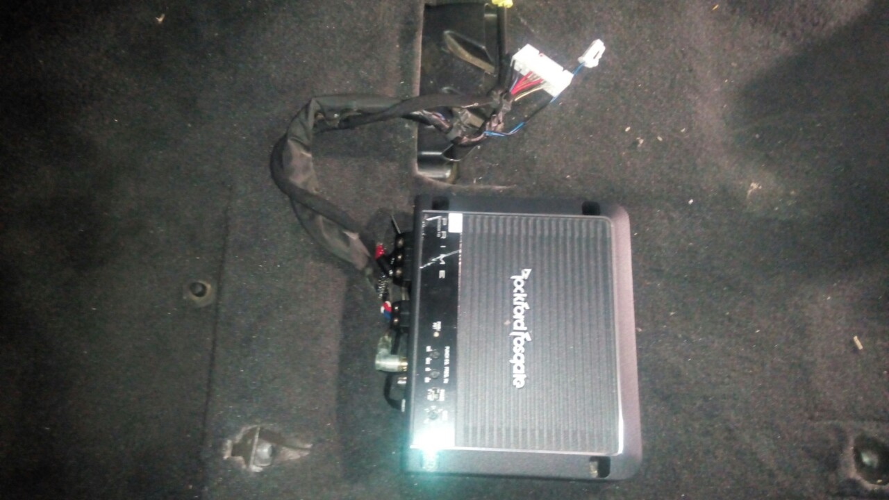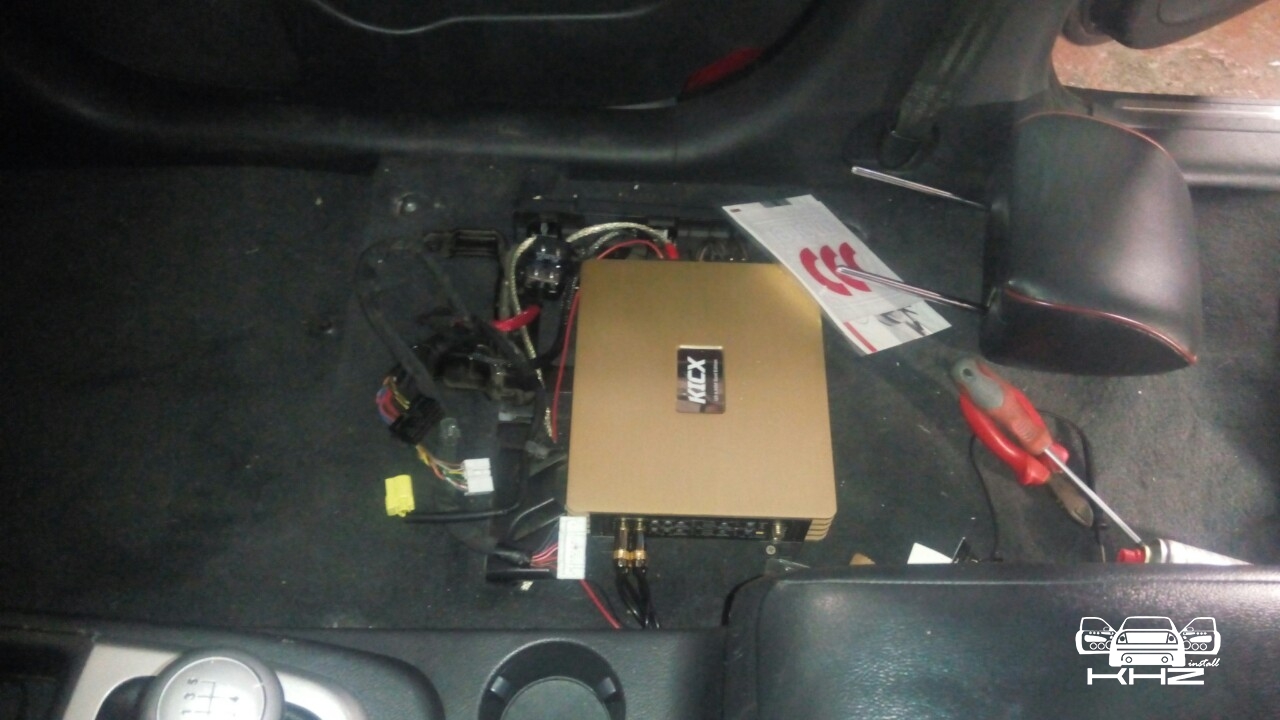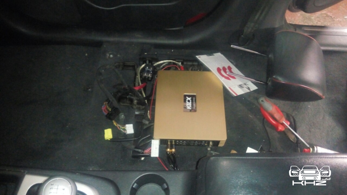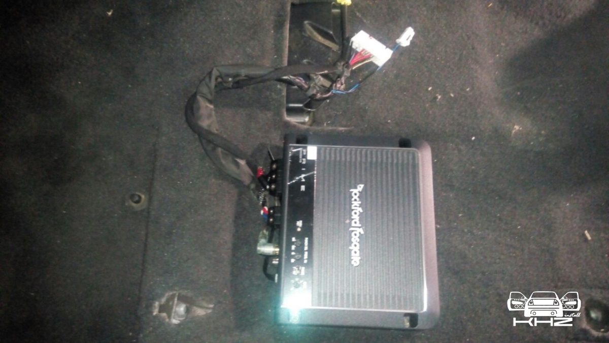 Акустика встановлена, далі підсилювачі звуку, єдине місце в Хюндай Санта Фе для встановлення підсилювачів - це під сидіннями. З одного боку було розміщено 4-х канальний Kicx QS 4.95 Gold і розподільник живлення для другого підсилювача Rockford R500 x1, який є моноблоком з потужністю в 500Вт в підключенні в 2 Ом. І має компактні розміри. Силова проводка була прокладена вся мідна і хорошого перетину, так само була захищена зміїною шкірою.
