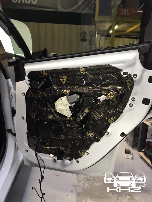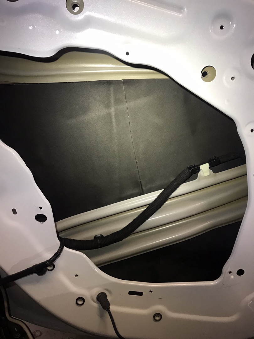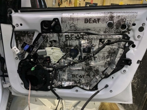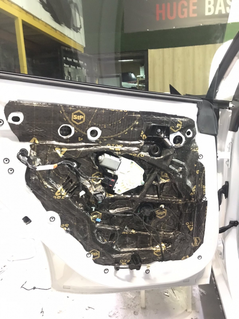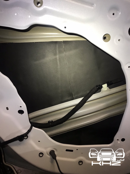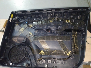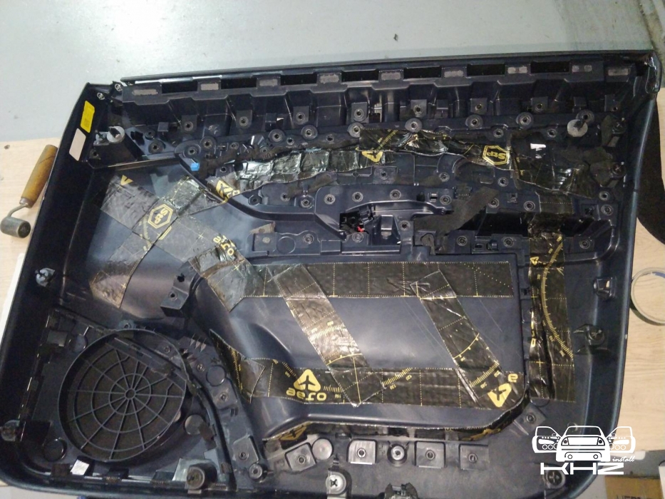 Далі у нас та частина дверей, де стоятиме динамік, це пластиковий щит, і тут ми вирішили його зміцнити для більшої жорсткості, за допомогою спеціальної віброізоляції з жорсткою основою, яку наносять за допомогою фену, - це STP Beat-ON, під час охолодження він дубенеет і дає високу жорсткість будь-якому матеріалу під ним.
