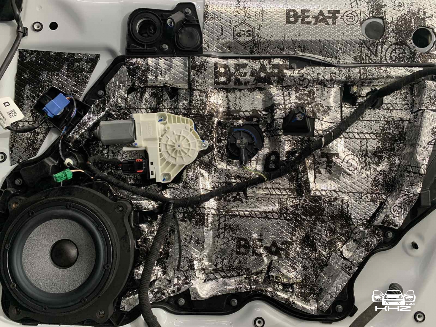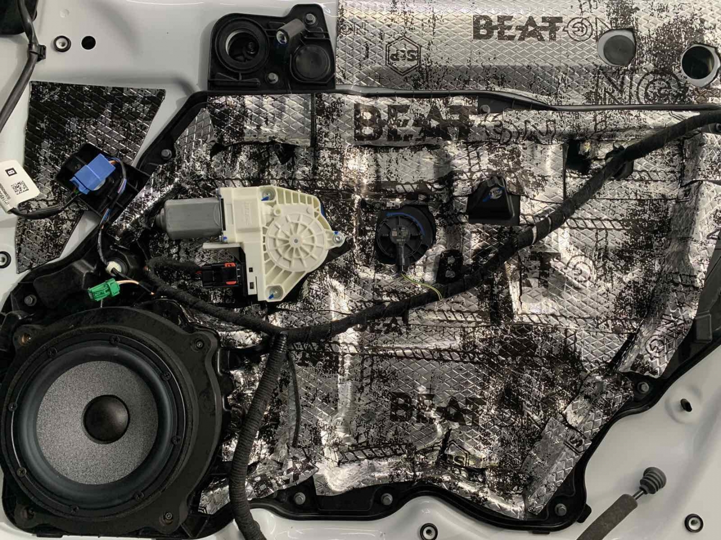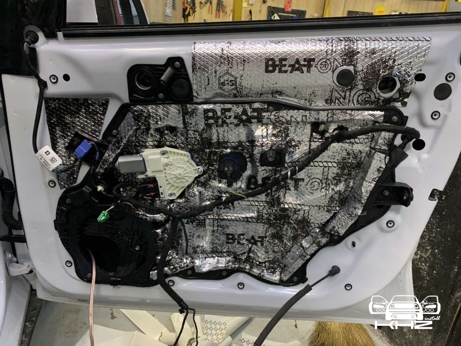 Далі у нас та частина дверей, де стоятиме динамік, це пластиковий щит, і тут ми вирішили його зміцнити для більшої жорсткості, за допомогою спеціальної віброізоляції з жорсткою основою, яку наносять за допомогою фену, - це STP Beat-ON, під час охолодження він дубенеет і дає високу жорсткість будь-якому матеріалу під ним.