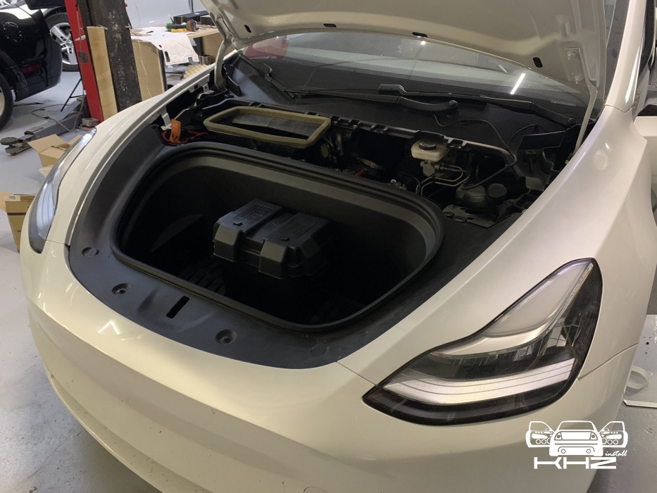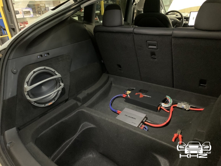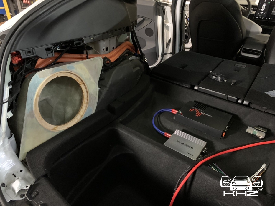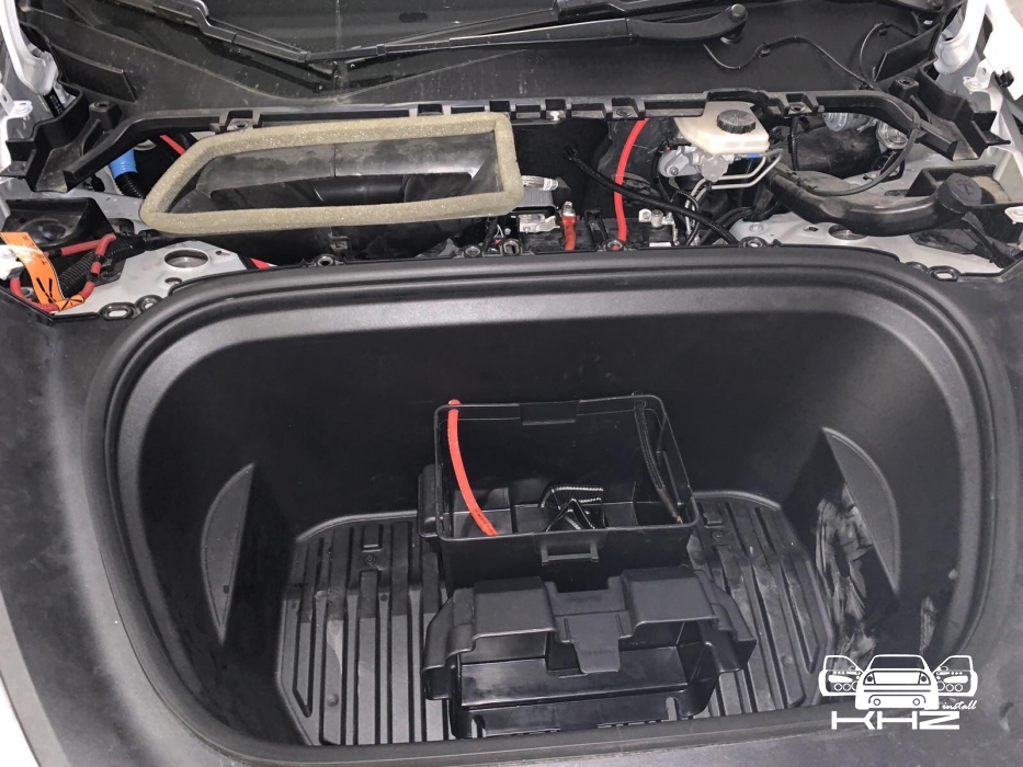 Фронт акустика в TESLA model Y стоїть, задню систему не міняємо і вона буде служити просто підзвучкою. Далі у нас встановлення підсилювачів і так само для перестраховки ми встановимо додатковий гелевий акумулятор, як робили в попередньому авто. Ми тягнемо нову силову проводку, захищаємо її обплетенням, від перетирань і пошкоджень, в багажнику ставимо розподільник живлення, щоб зробити додатковий пункт захисту, і підсилювачі звуку в TESLA model Y, будуть розташовані в багажнику під підлогою, виглядає це так: