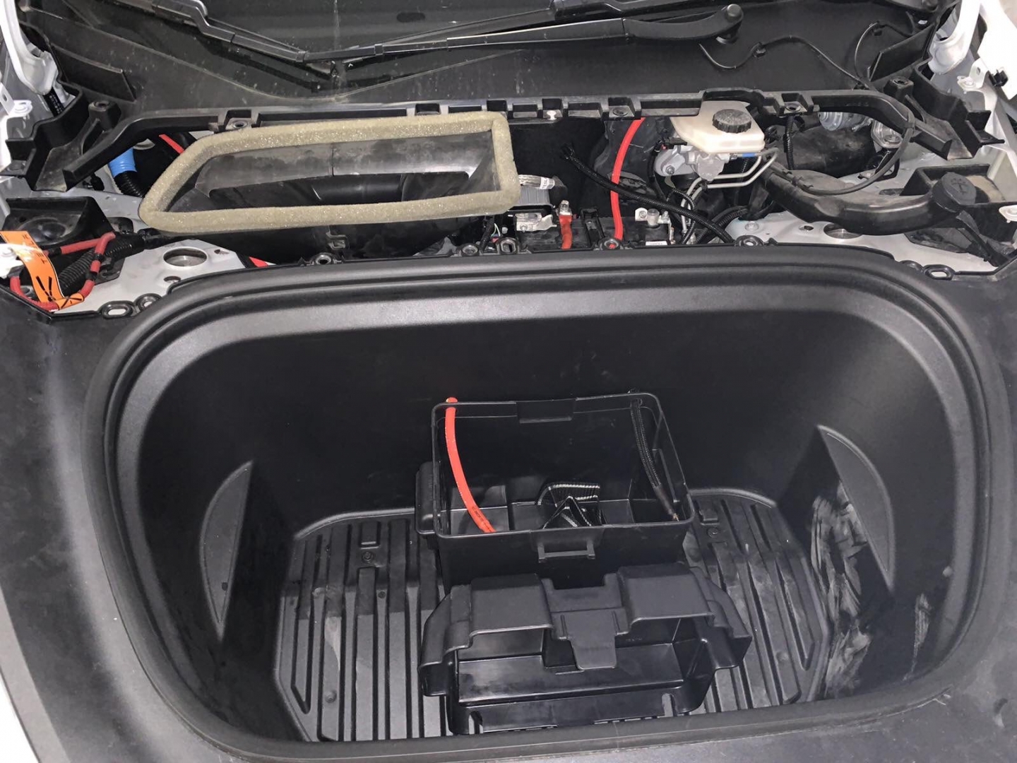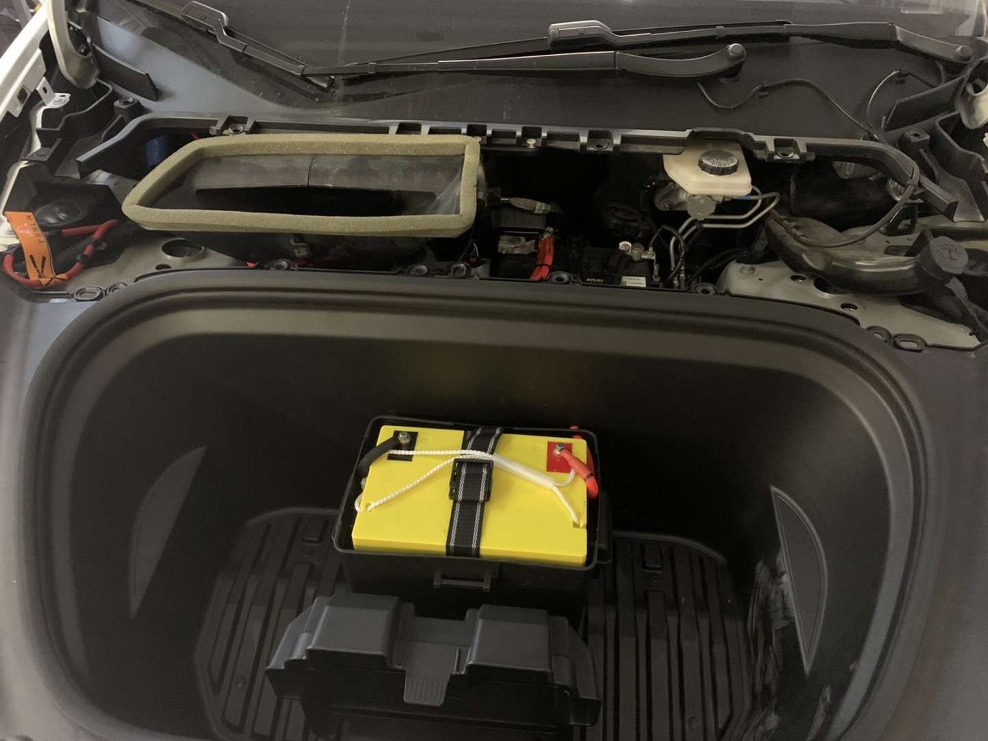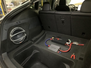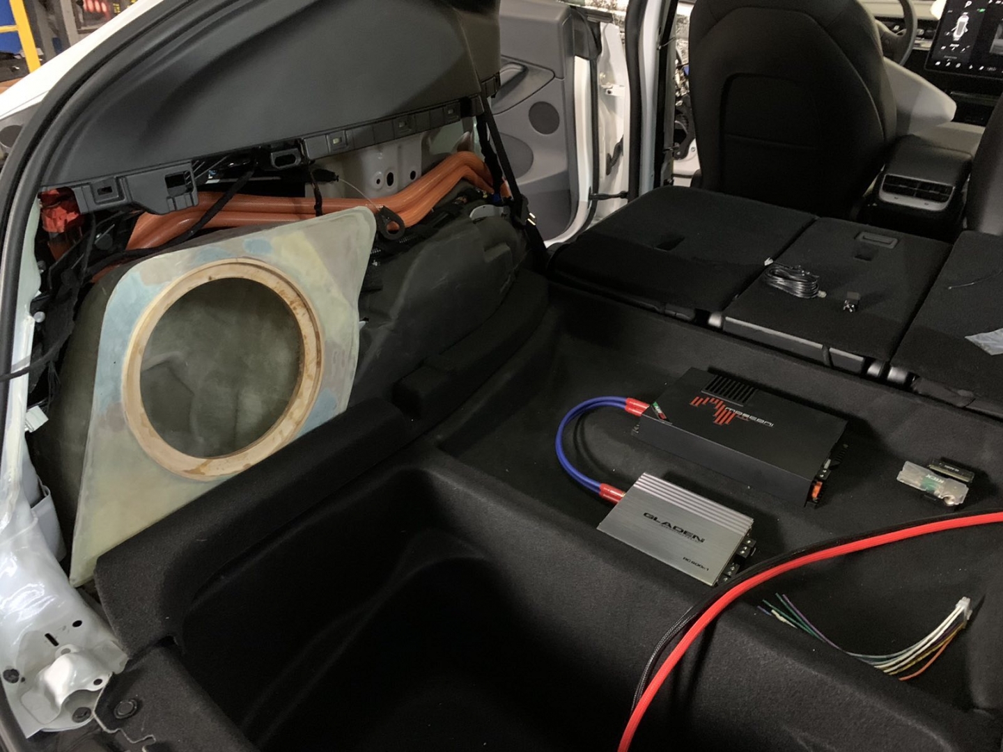 Фронт акустика в TESLA model Y стоїть, задню систему не міняємо і вона буде служити просто підзвучкою. Далі у нас встановлення підсилювачів і так само для перестраховки ми встановимо додатковий гелевий акумулятор, як робили в попередньому авто. Ми тягнемо нову силову проводку, захищаємо її обплетенням, від перетирань і пошкоджень, в багажнику ставимо розподільник живлення, щоб зробити додатковий пункт захисту, і підсилювачі звуку в TESLA model Y, будуть розташовані в багажнику під підлогою, виглядає це так: