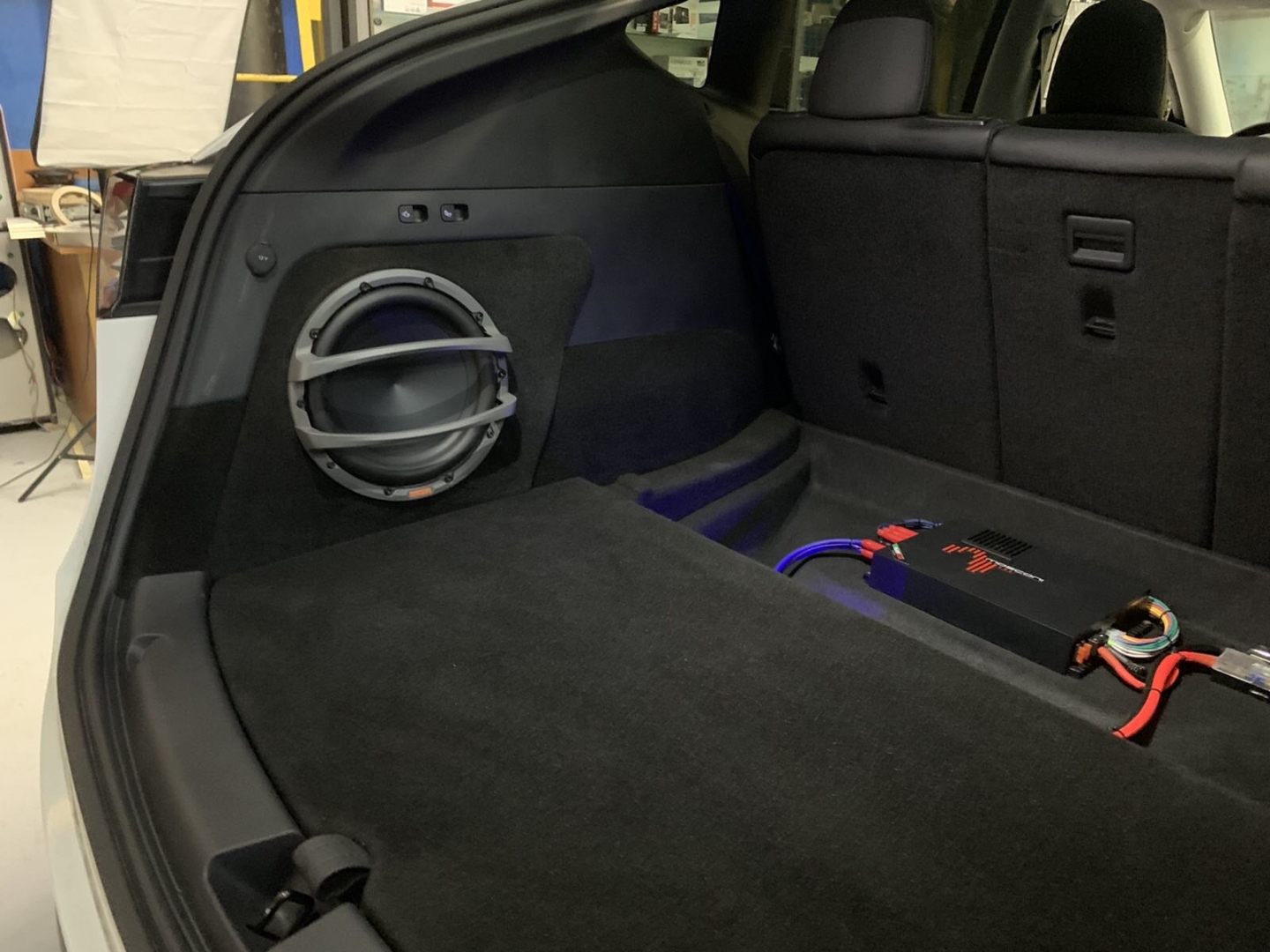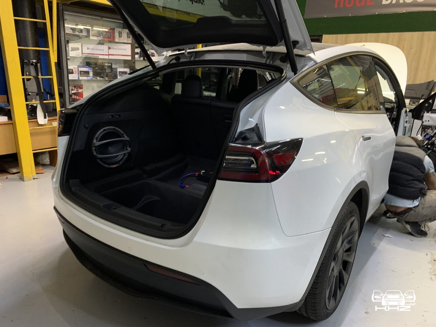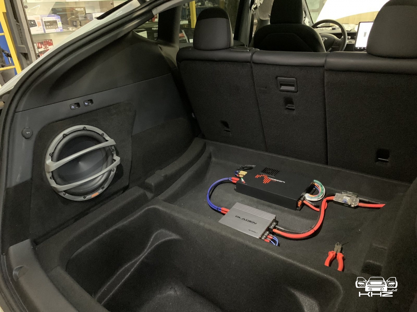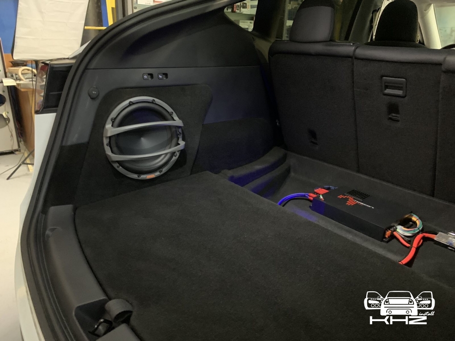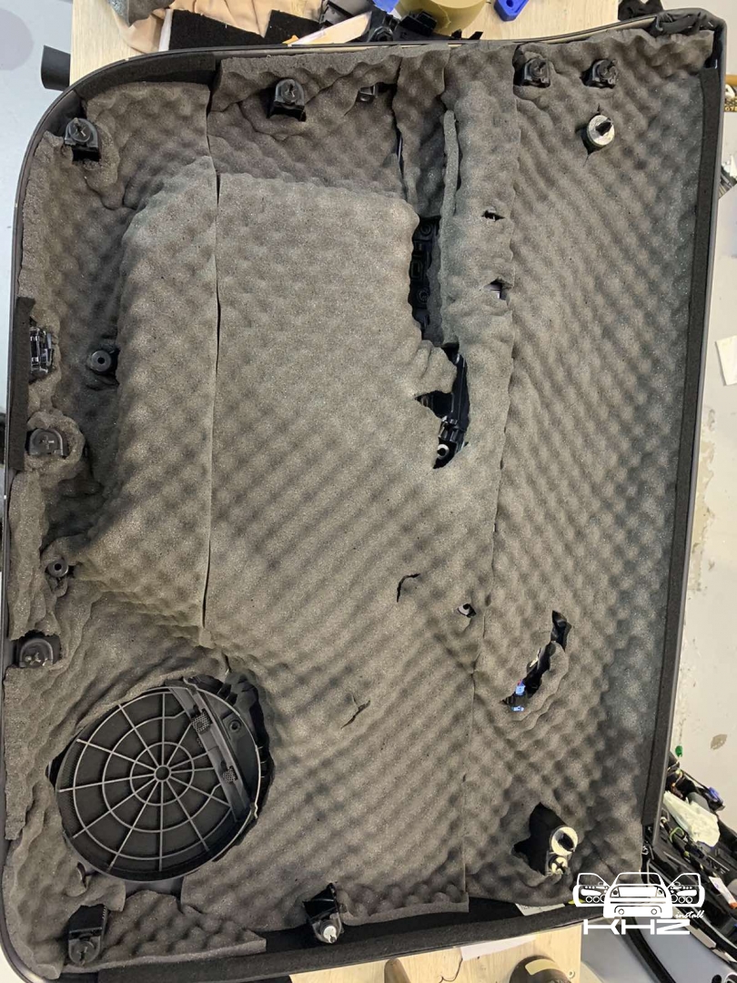 І за допомогою шпаклівки починаємо вирівнювати як лицьову частину, так і зазори по контуру, оскільки під час висихання смоли виріб трохи деформується, і плюс ми хочемо отримати ідеальний результат. Після підгонки ми перетягуємо короб стелс під сабвуфер в TESLA Y, в чорний якісний карпет і робимо основу за обшивкою в яку будемо кріпити короб. Закріпили наш виріб - завели мідний товстий кабель і встановлюємо наш красень-сабвуфер, до речі, об'єм ящика ми заміряли і він був 24 літри, це добре і підходить параметрам сабвуфера. Так само ми встановили фірмовий захисний гриль для сабвуфера Hertz, він зроблений з металу, і захистить сабвуфер від потрапляння сумки або чогось габаритного.