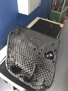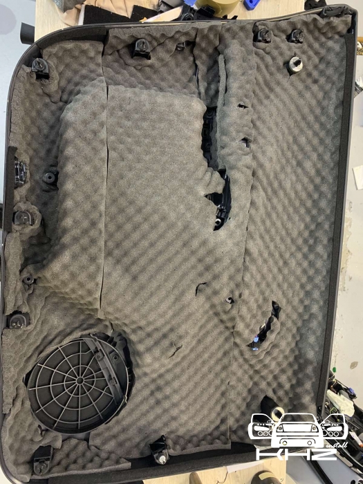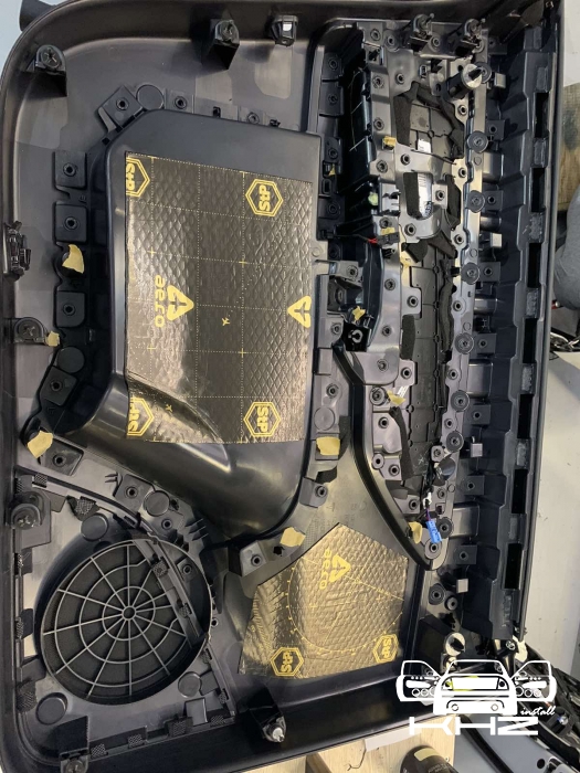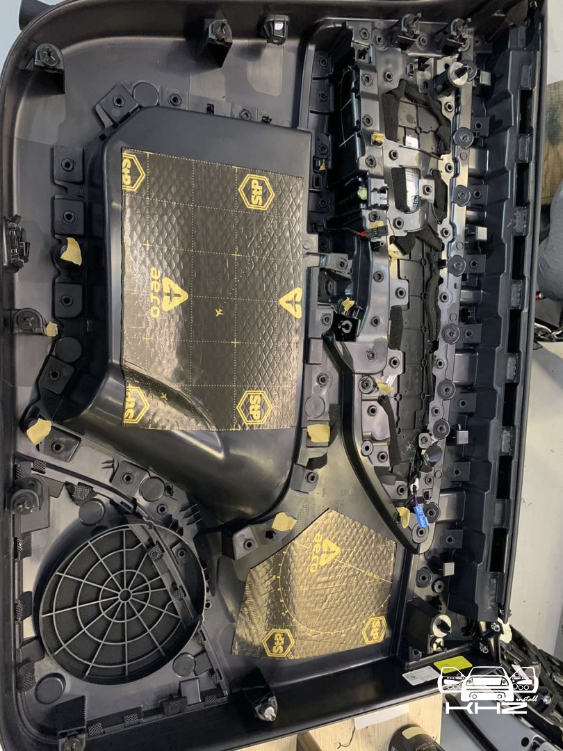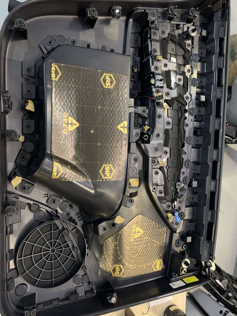Наступний етап - це шумоізоляція карти дверей, карта армується віброізоляцією для того, щоб скріпити кволий пластик і трохи зміцнити, а потім затягуємо повністю пірамідкою, це звукопоглинач найвищої якості, який прибере всі тертя карти та доб'є залишки шуму, що проникає. Ось так пройшла шумоізоляція дверей TESLA model Y.