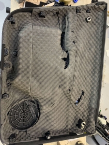 Далі ми знімаємо зліпок і вже поза автомобілем, наносимо все нові шари смоли і скломату, для того щоб зміцнити короб сабвуфера, коли ми домоглися потрібної товщини задньої стінки, ми акуратно відрізаємо по лініях краї нашого виробу. І повертаємо матрицю в крило для того щоб встановити посадкове кільце для сабвуфера в TESLA model Y, ставимо кільце і закріплюємо його в потрібному положенні. Далі слідує формування передньої стінки короба сабвуфера, для цього ми натягуємо спеціальну тканину - і закріплюємо її, обробляємо скловолокном, надалі зміцнюємо лицьову стінку зсередини скловолокном, доти, доки вона не буде жорсткою.