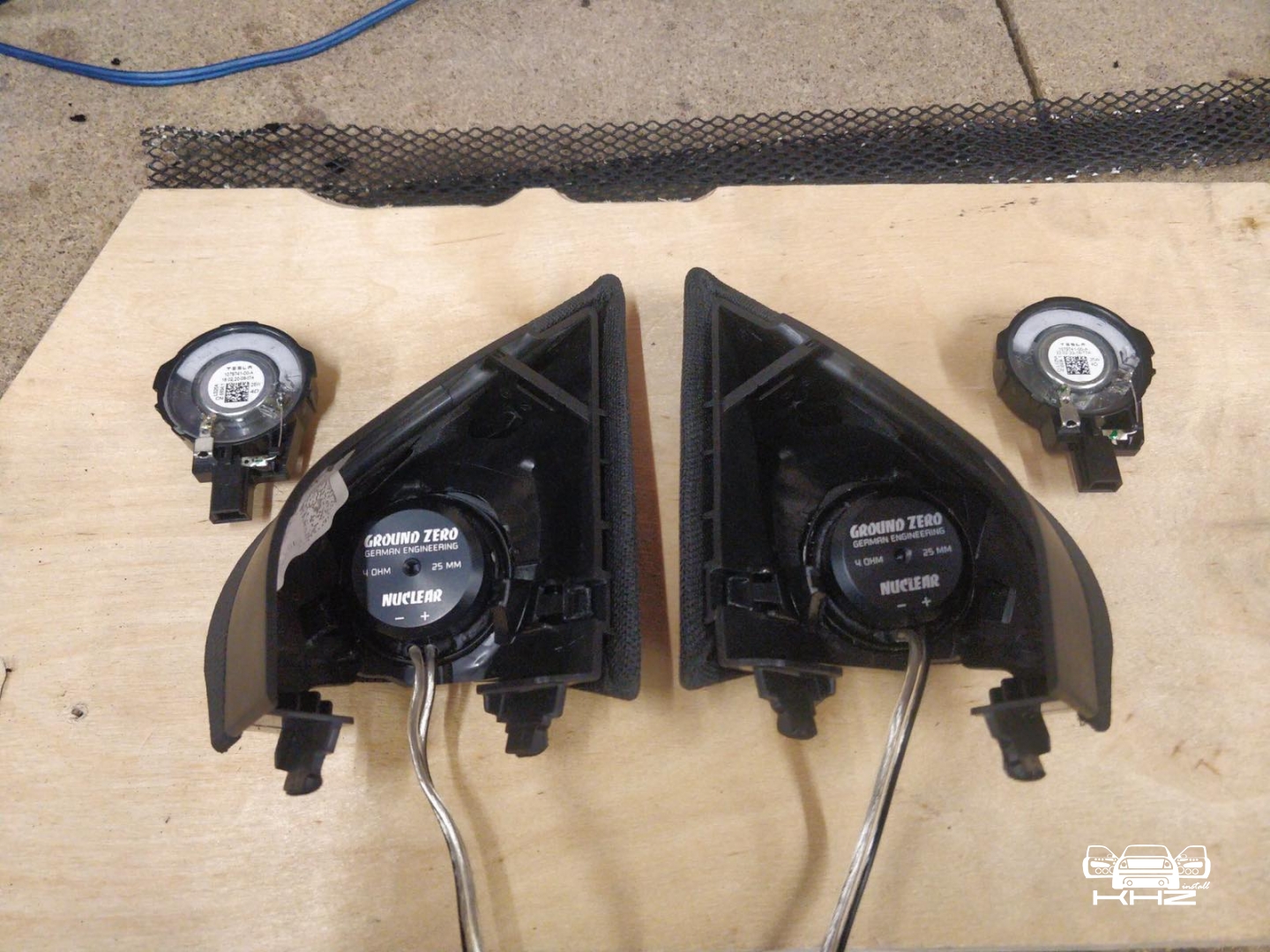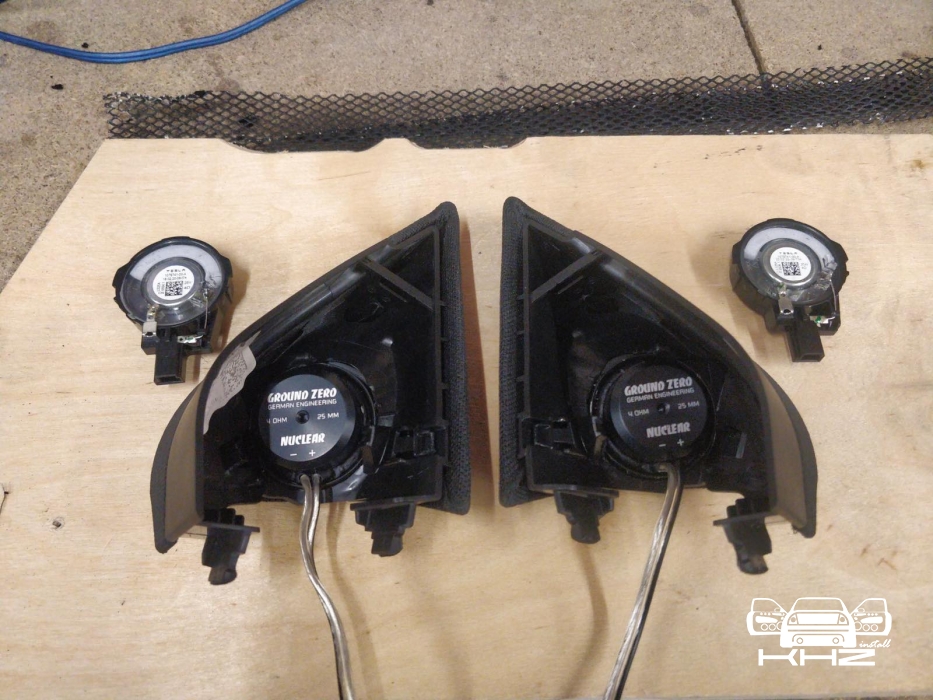 Переходимо до твітерів, вони не BRAX, а Ground Zero Nuclear - так через те що, в минулому автомобілі замовника - ми будували систему на них і вони дуже запам'яталися замовнику, і це круто, коли людина просить схожий звук - і знає, що буде саме так. Твітера були встановлені в куточках - оскільки все повинно виглядати за штатним, ми не багато розточили посадочні місця - і в штатних куточках розташували твітера від іменитого бренду.