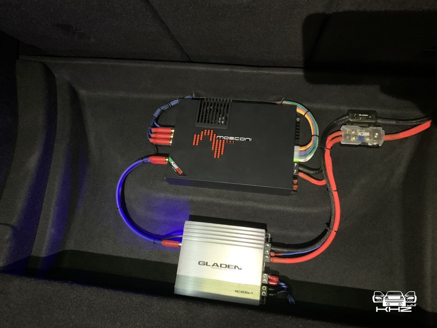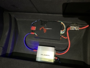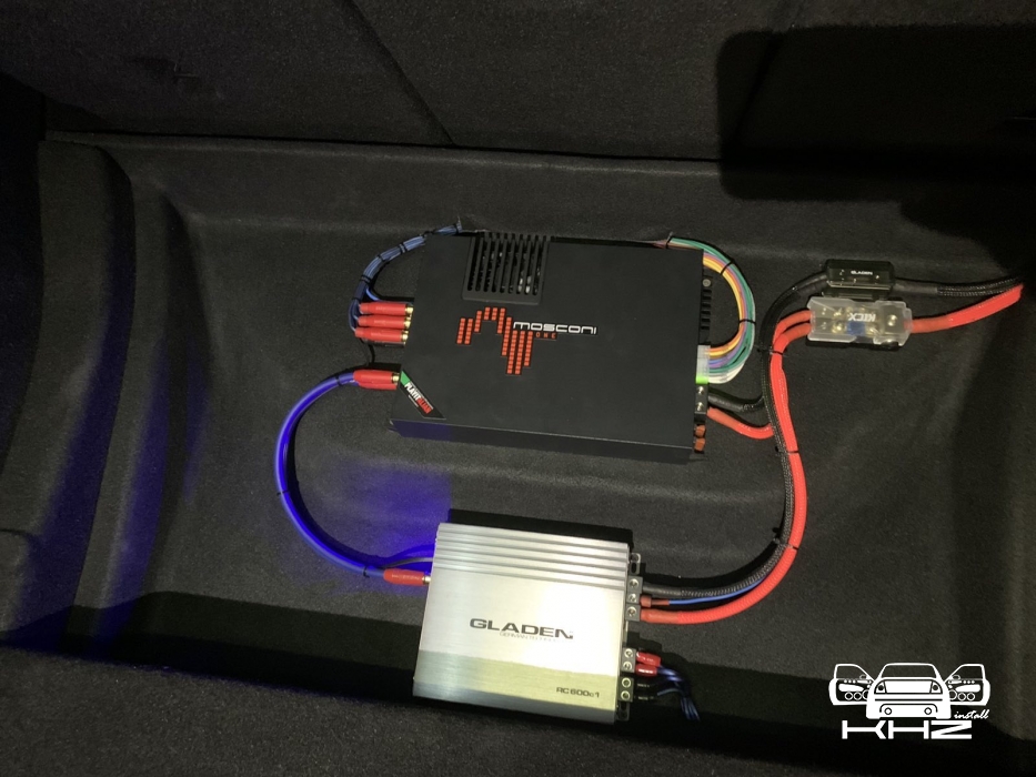 Другий підсилювач - це компактний GLADEN RC600.1 - це моноблок, а саме підсилювач тільки для сабвуфера, з гарною потужністю і малим споживанням живлення, що дає вищий ккд на виході. Так само нами були спаяні міжблочні кабелі ручної роботи, які для якісних систем ми робимо завжди вручну. Исю проводку ми красиво поклали, хоч вона і під підлогою, це наше ім'я - яке ми тримаємо вже понад 6 років!