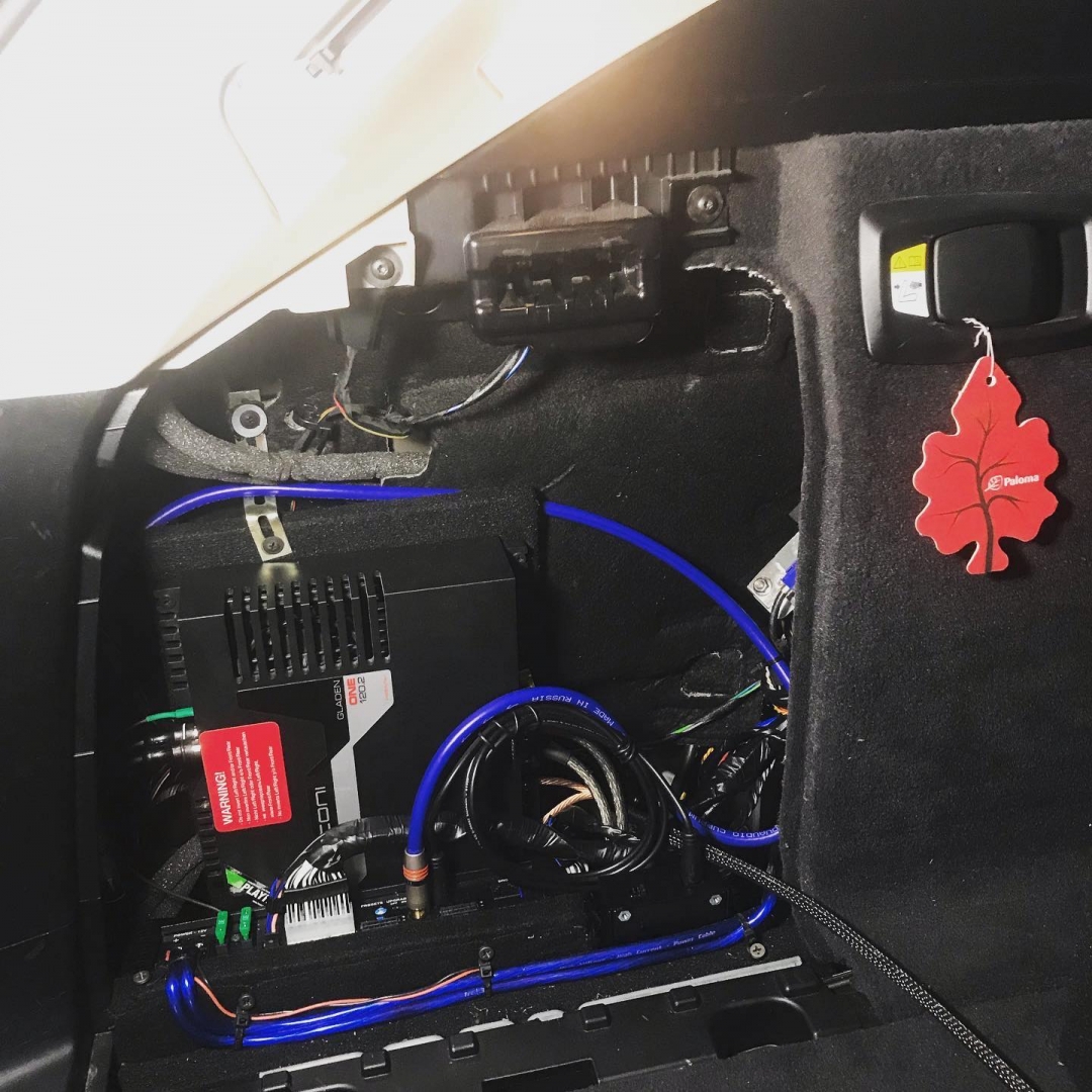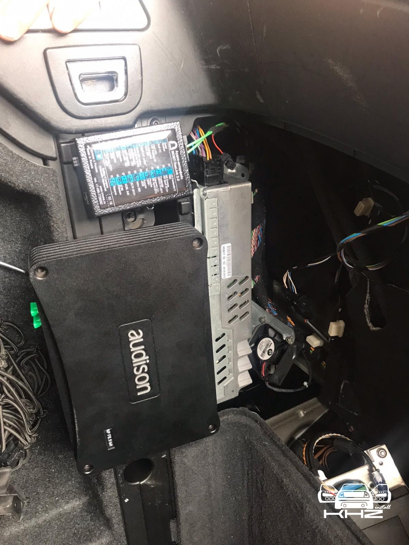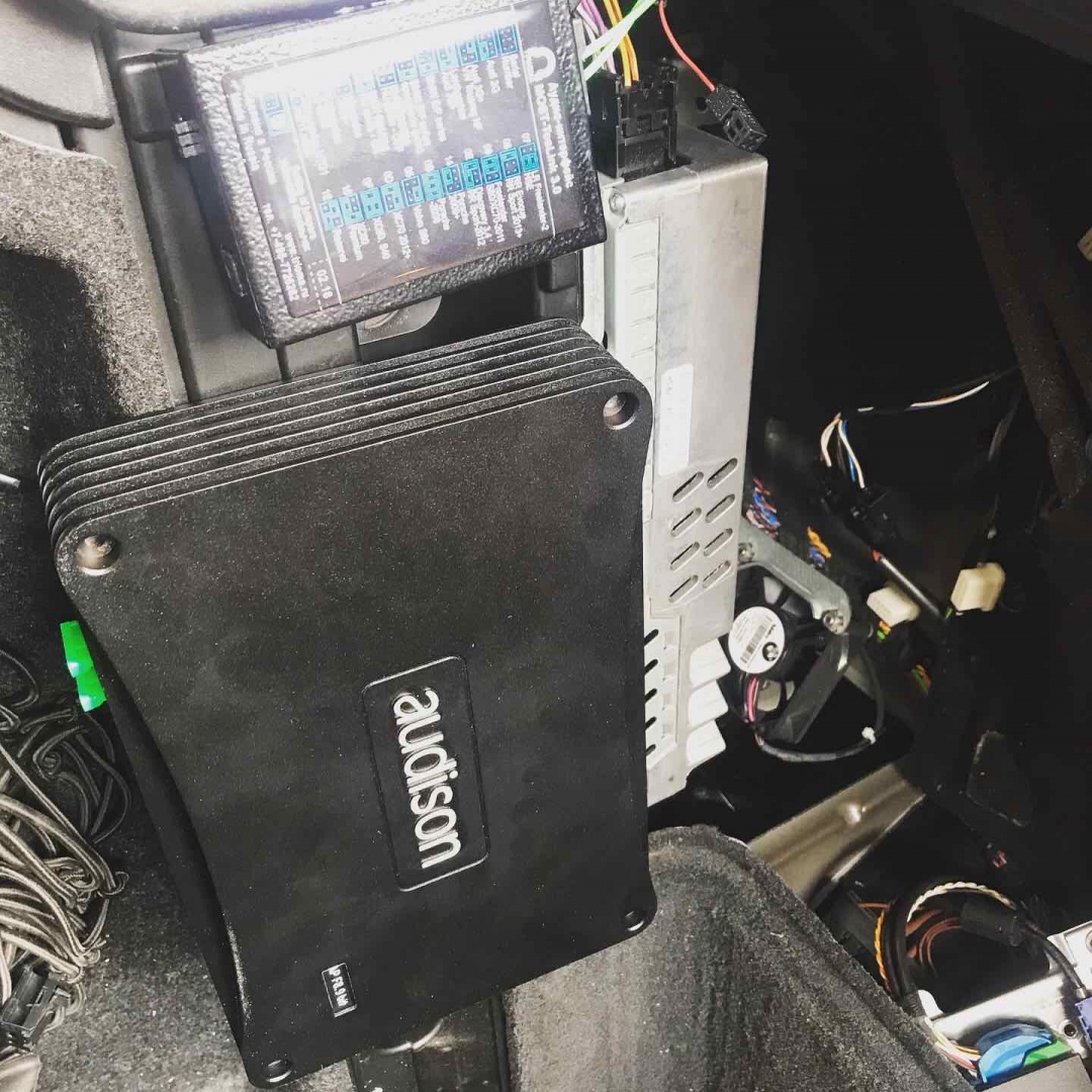 Далі у нас почалася робота в багажнику BMW 5 F10, даний автомобіль був універсал і після огляду, і перед підбором обладнання ми вибрали ліву нішу для розміщення всього обладнання. І так в таких автомобілях сигнал вже з магнітоли на підсилювач передається за допомогою Оптичного волокна, і це звісно ускладнює та збільшує кошторис замовника, лише через те, що для зняття якісного сигналу потрібно встановлювати спеціальний адаптер, в нашому випадку це був TOS LINK адаптер Тріома, але є і плюс - коли сигнал береться з оптики, він вважається максимально якісним! Оптику під'єднали в адаптер, а з адаптера пустили сигнал далі в процесорний підсилювач Audison. Кілька слів про нього, це топовий підсилювач звуку на 8 каналів з потужністю 80Вт на канал і так само вмонтований у нього звуковий процесор з 9-ма виходами для налаштування. Модель називається Audison AP F8.9 Bit, ну і великий плюс, що, скажімо, два підсилювачі об'єднані в один невеликий, який розмістити буде не складно.