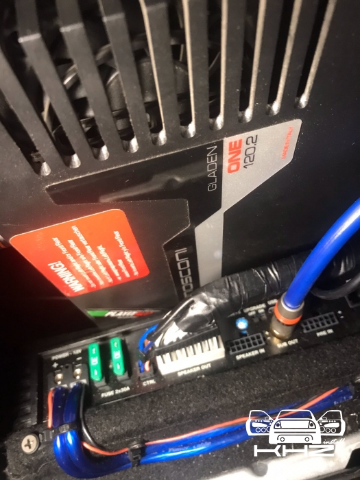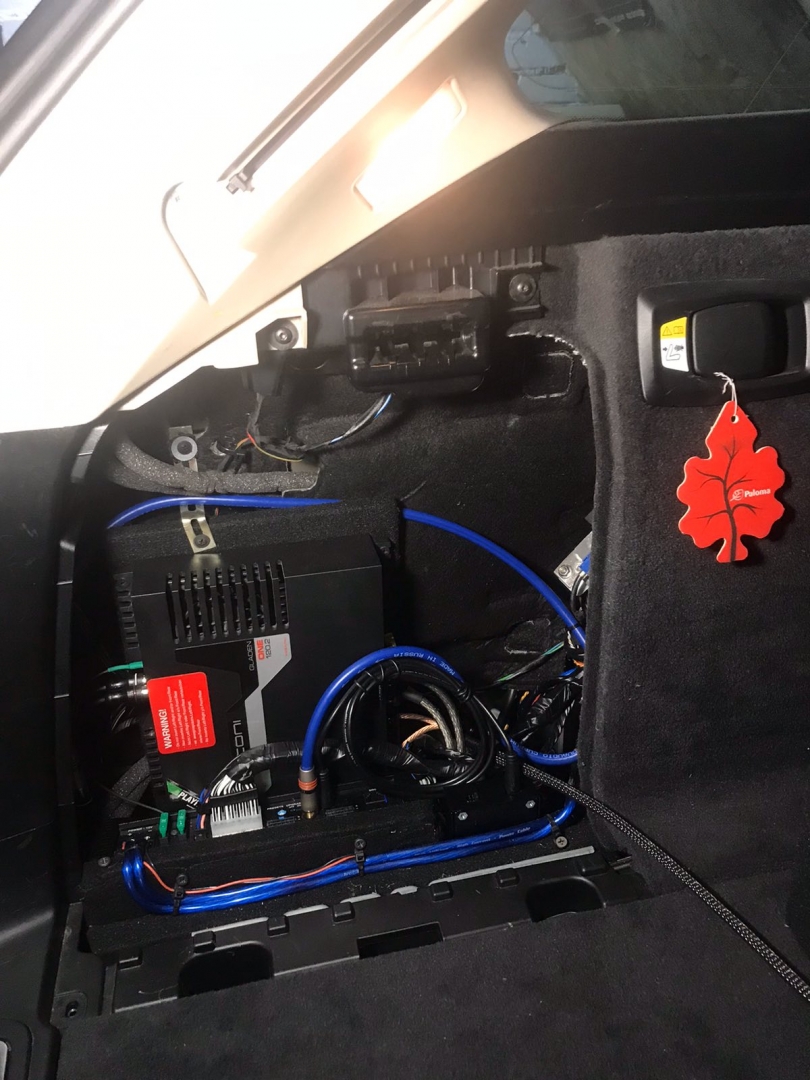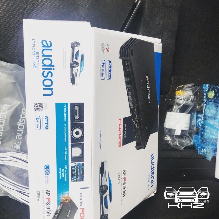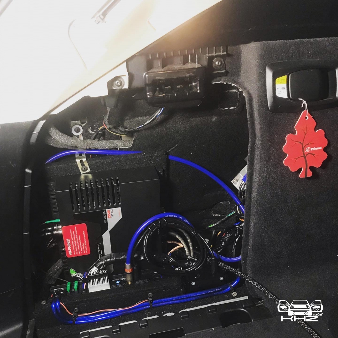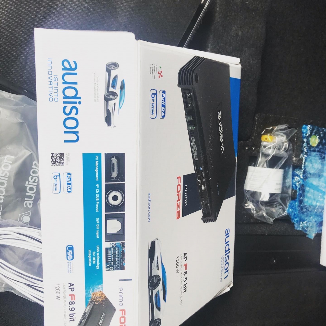 Далі у нас почалася робота в багажнику BMW 5 F10, даний автомобіль був універсал і після огляду, і перед підбором обладнання ми вибрали ліву нішу для розміщення всього обладнання. І так в таких автомобілях сигнал вже з магнітоли на підсилювач передається за допомогою Оптичного волокна, і це звісно ускладнює та збільшує кошторис замовника, лише через те, що для зняття якісного сигналу потрібно встановлювати спеціальний адаптер, в нашому випадку це був TOS LINK адаптер Тріома, але є і плюс - коли сигнал береться з оптики, він вважається максимально якісним! Оптику під'єднали в адаптер, а з адаптера пустили сигнал далі в процесорний підсилювач Audison. Кілька слів про нього, це топовий підсилювач звуку на 8 каналів з потужністю 80Вт на канал і так само вмонтований у нього звуковий процесор з 9-ма виходами для налаштування. Модель називається Audison AP F8.9 Bit, ну і великий плюс, що, скажімо, два підсилювачі об'єднані в один невеликий, який розмістити буде не складно.