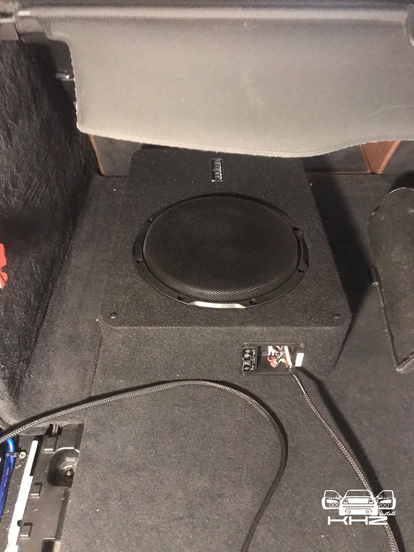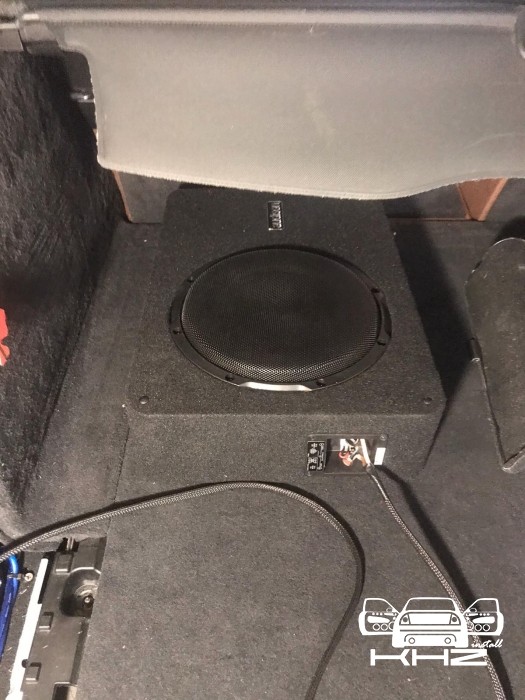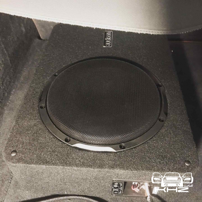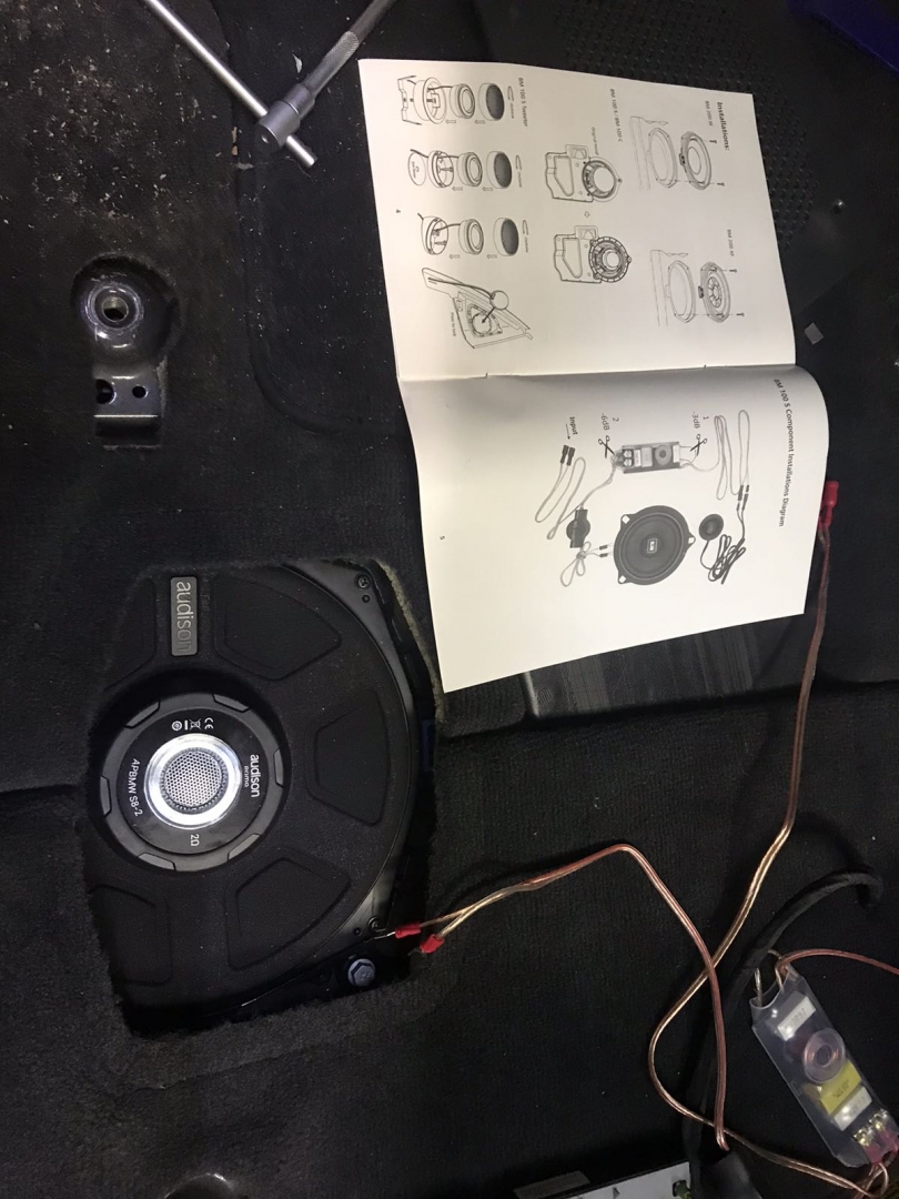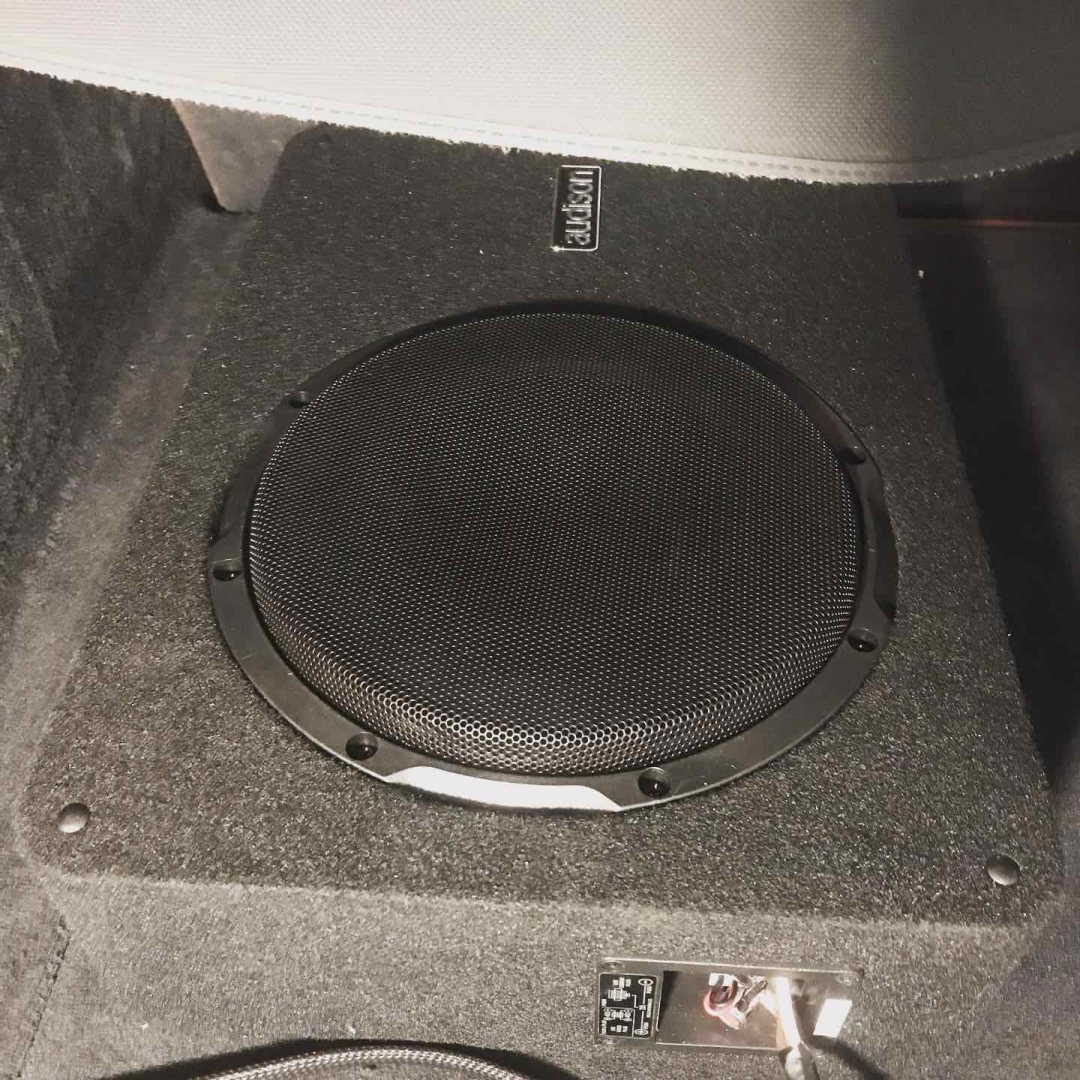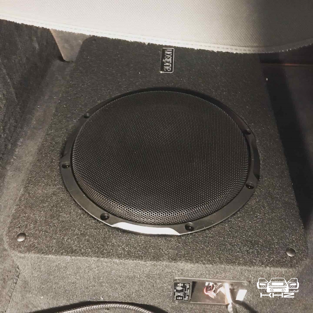 Так само в нашій системі був сабвуфер, сабвуфер замовник просив підібрати такий, щоб його практично не можна було пошкодити, і він був компактним, для цього завдання підійшов новий сабвуфер в корпусі фірми Audison, дуже велика його привілея в тому, що він плоский і прямокутний, і може ставати на невеликі ніжки та перевертатися динаміком вниз, і тоді на нього можна ставити що завгодно, ось такого красеня ми під'єднали: