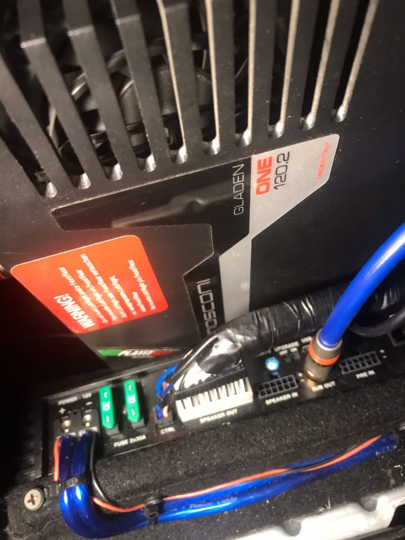 Так само у замовника був свій підсилювач бренду Mosconi, який було вирішено встановити для посилення сабвуфера, це 2-х канальний потужний підсилювач звуку, який ми під'єднали мостом, і сигнал на нього дали через звуковий процесор. Щоб встановити два підсилювачі звуку в BMW 5 F10 і адаптер Тріома, ми зробили подіум з кріпленнями під штатні болти, перетягнули його карпетом і на нього з двох боків закріпили два підсилювачі та адаптер, має такий вигляд: