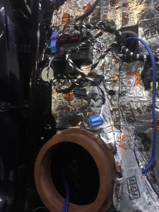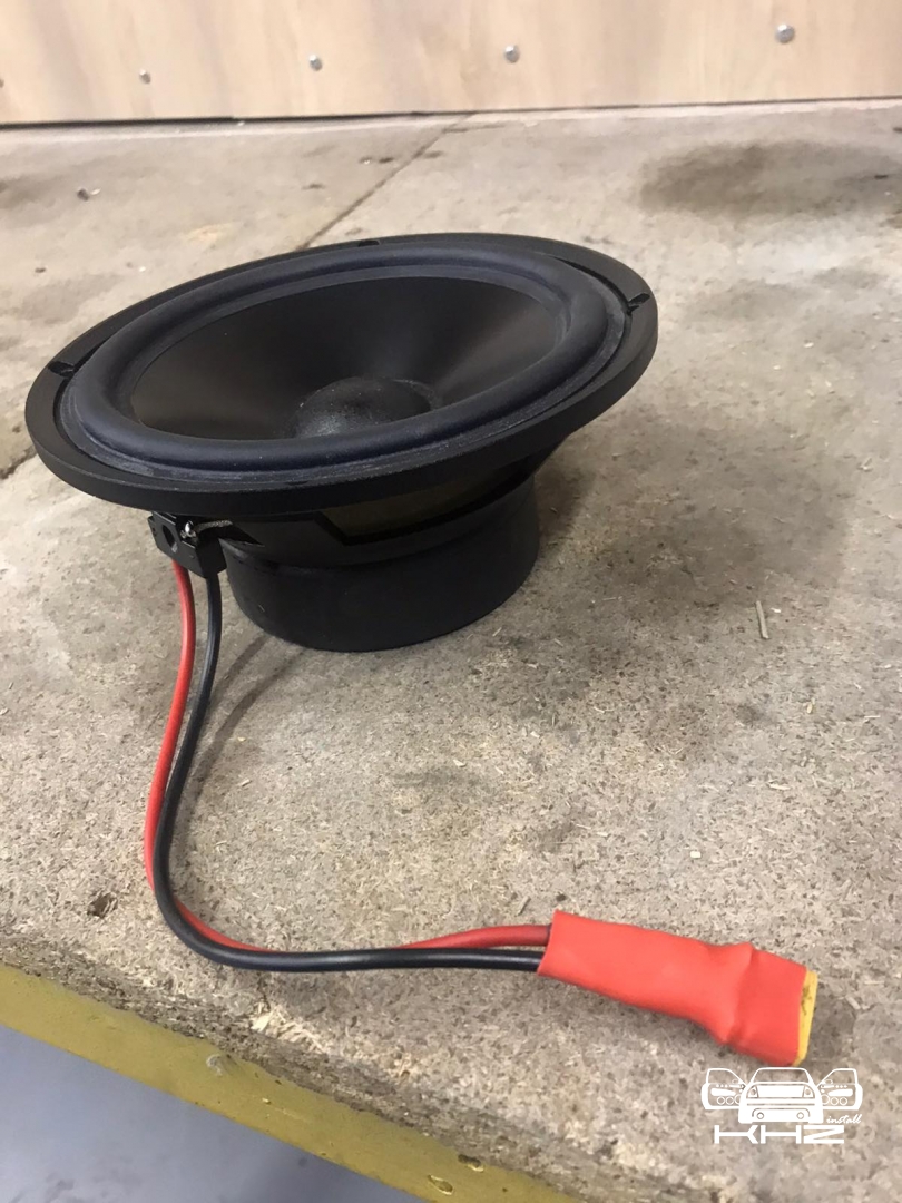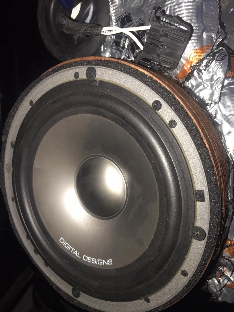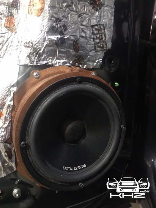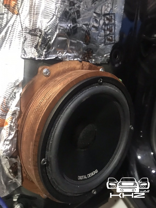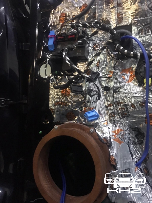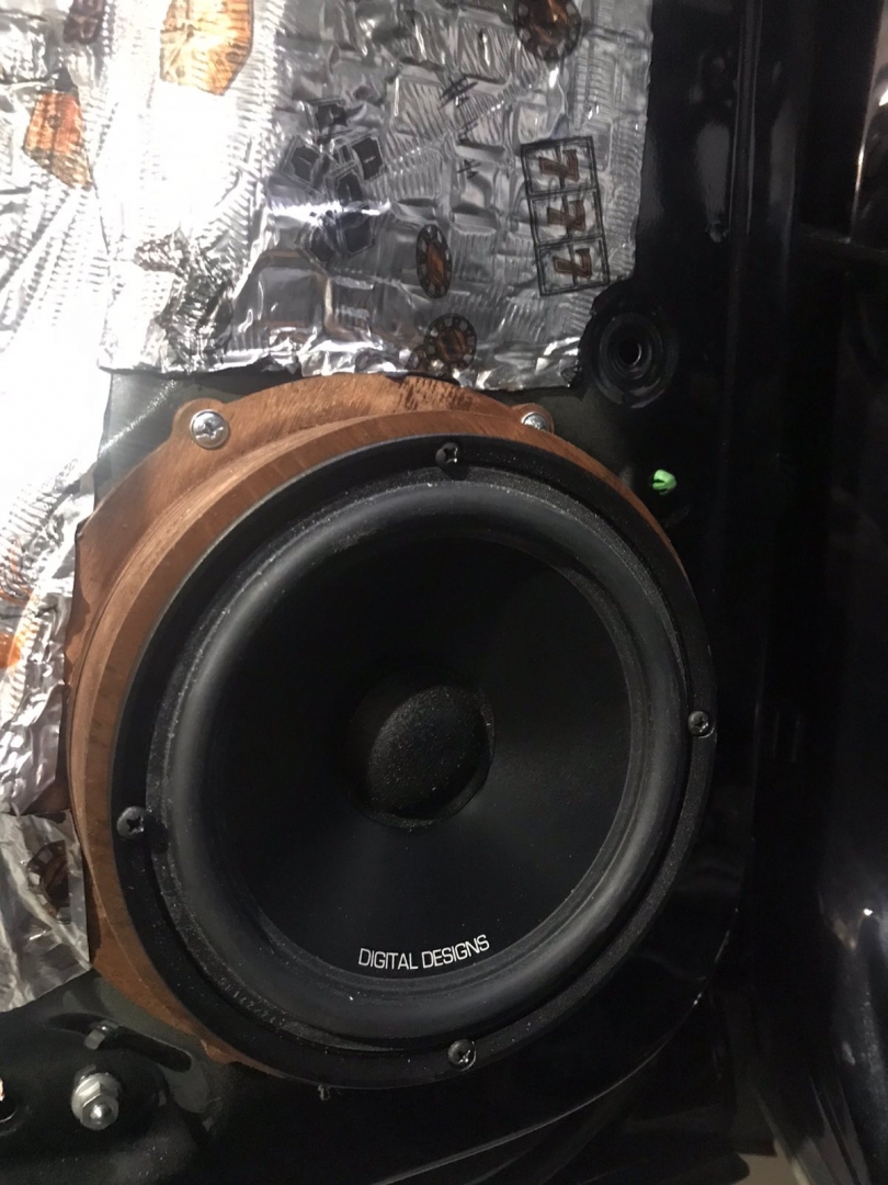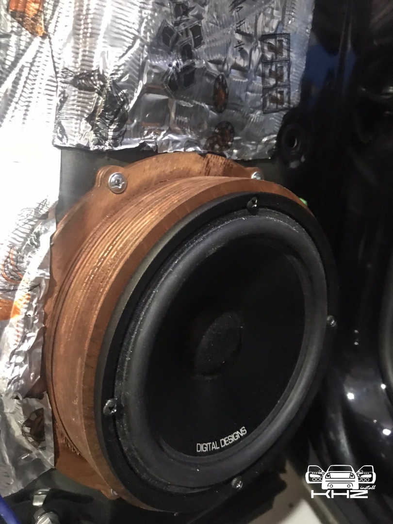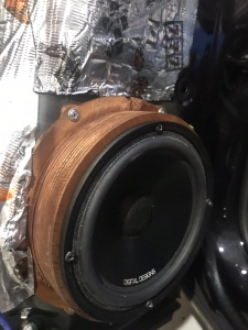 Насамперед нам потрібно розвести нову мідну проводку по всьому автомобілю, як акустичну так і силову. Акустичні дроти були хорошого перетину 2,5 мідь і 1,5 мідь на розводку задніх динаміків через кросовери. Під час побудови таких систем важливо замінити акустичну проводку, тож, щоб не втратити якість звуку і провідність, ми нову проводку заводимо в кожні двері - у VW TIGUAN це доволі нелегко, але у нас є навички. Дроти заведені і переходимо до встановлення проставочних кілець з фанери, оброблених просоченням для уникнення потрапляння вологи і набухання, закріплені проставочні кільця для акустики виглядають так: