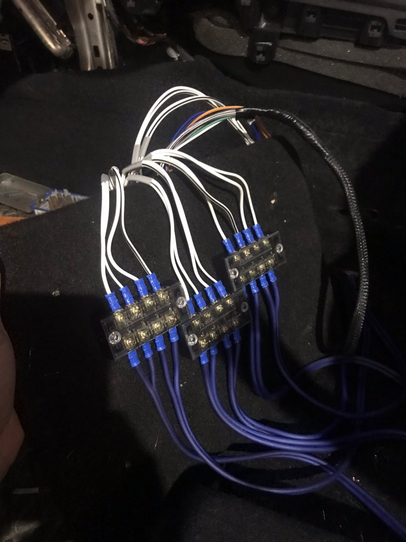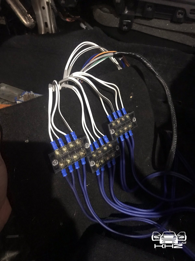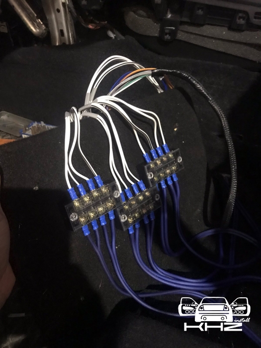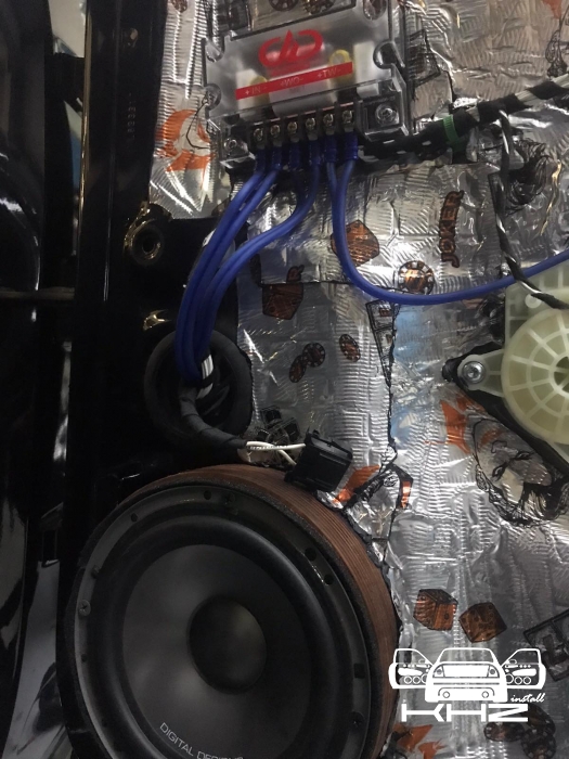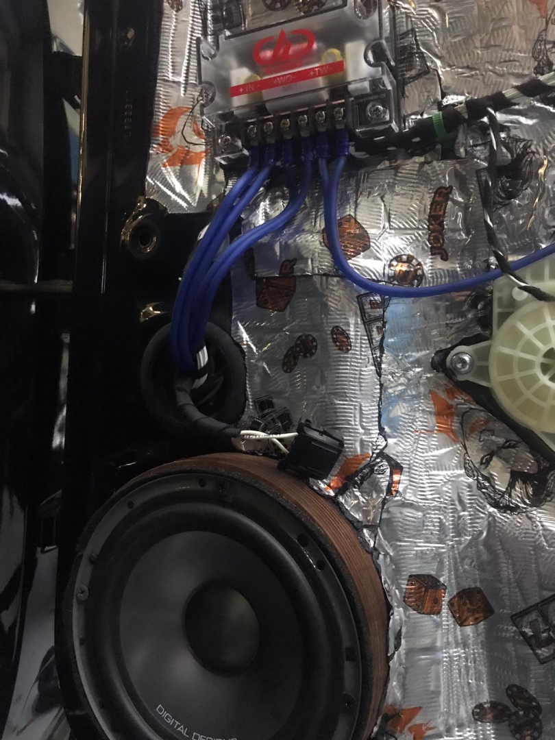 Тил комплект компонентний з кросовером у комплекті, і він буде під'єднаний не по-канальному, бо слугуватиме більше як підзвучка тилу і для об'єму звучання. Тил акустику ми встановили, кросовери закріпили і розвели проводку до твітера, виглядає це так: