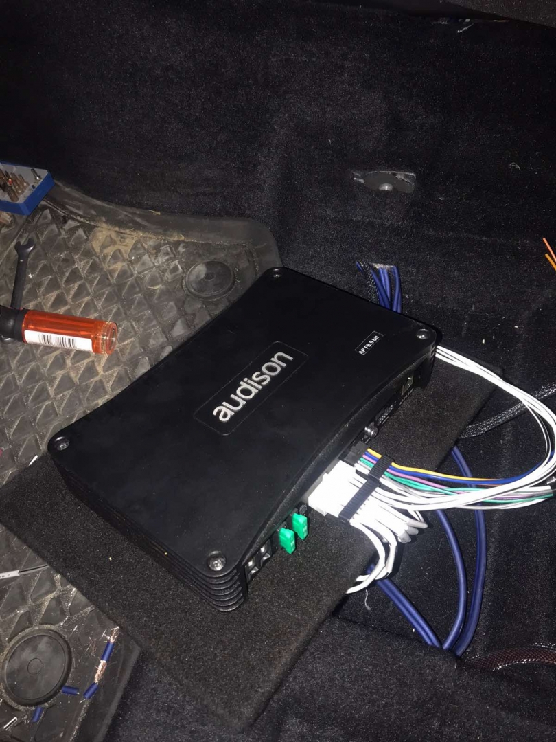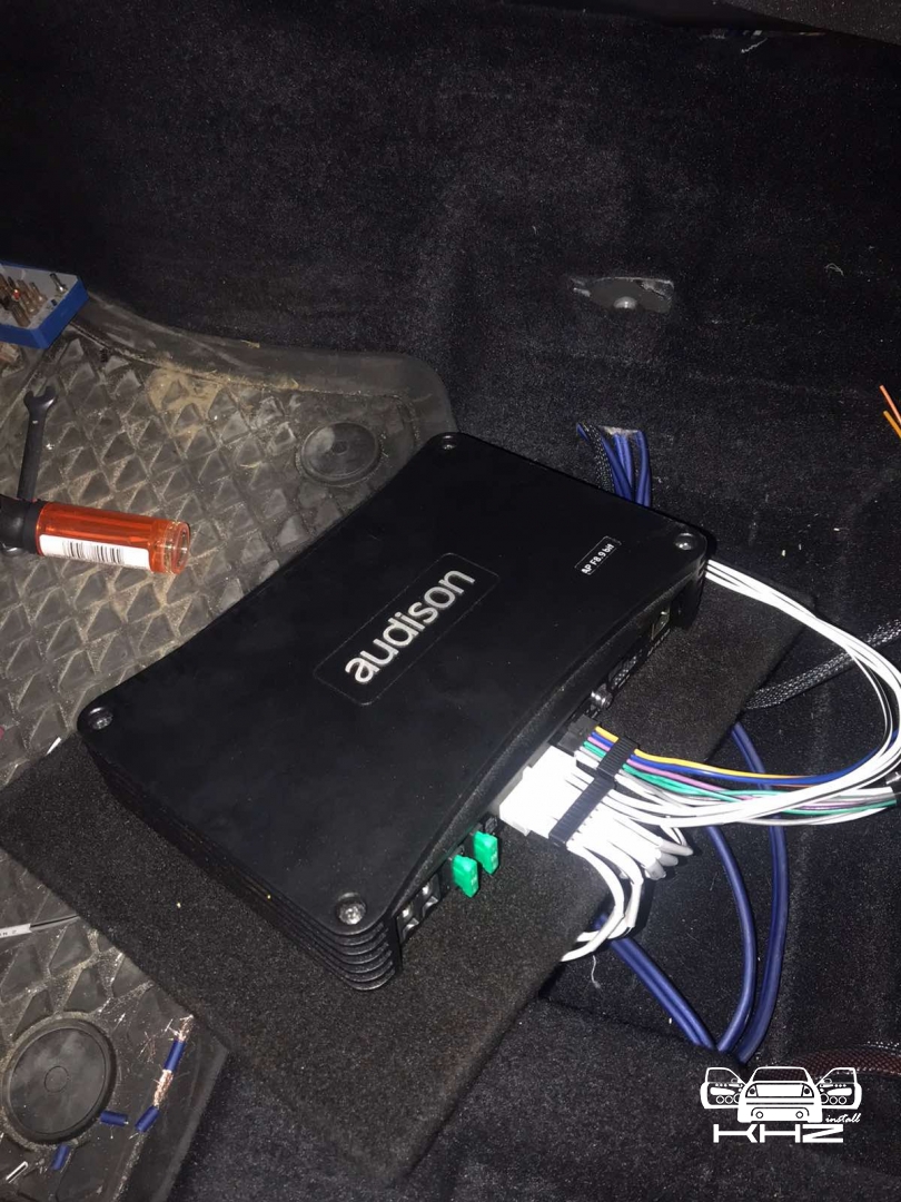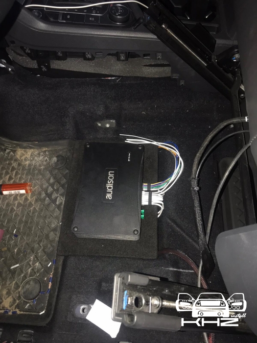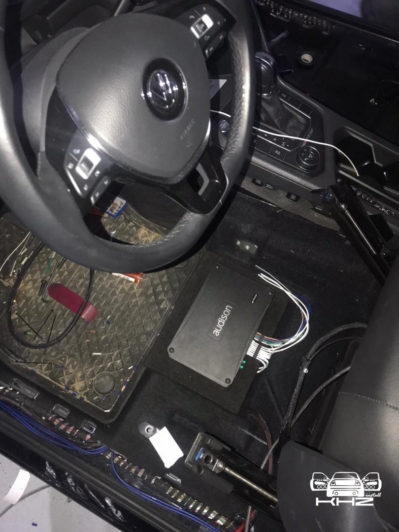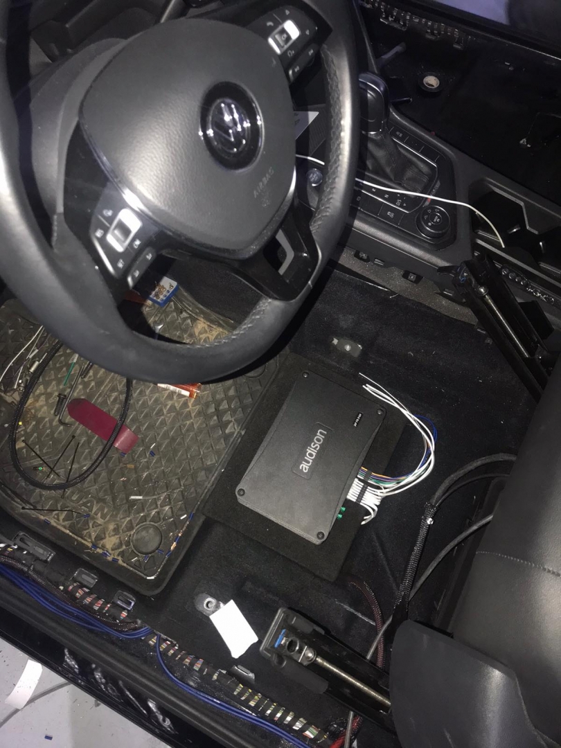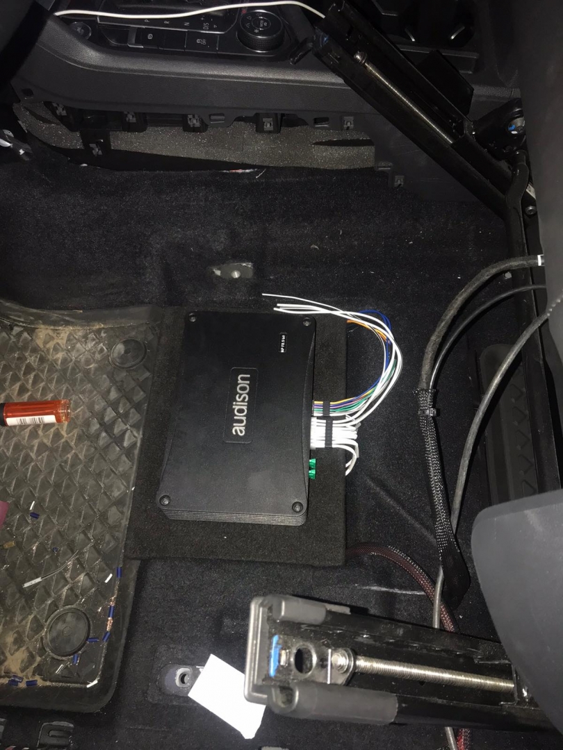 Наступний етап це встановлення процесорного підсилювача в VW TIGUAN, його ми розмістили під водійським сидінням на не великому подіумі і закріпленому до підлоги, так щоб на нього не потрапила волога в зимовий період, вимогою замовника була сувора відсутність скручувань кабелю та будь-яких з'єднань навіть з термоусадочними матеріалами, тому ми зробили все на таких з'єднувальних колодках, все вийшло дуже акуратно і на своїх місцях. Пару слів про сам підсилювач, це топовий мультипідсилювач бренду Audison Італія, Audison bit 8.9Forza, 8 каналів по 80 Вт, з вмонтованим 8 канальним процесором звуку, цей апарат дасть змогу налаштувати кожен фронтальний динамік в автомобілі окремо та посилити його, а ще - діеквалізіровать не якісний сигнал із магнітоли та перетворити його на чистий і готовий до обробки сигнал, а потім передати на вмонтований підсилювач. Дане обладнання має не великі габарити і два окремих пристрої в одному, ідеально підійде для автомобілів з обмеженим місцем для інсталяцій.