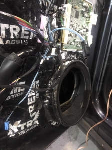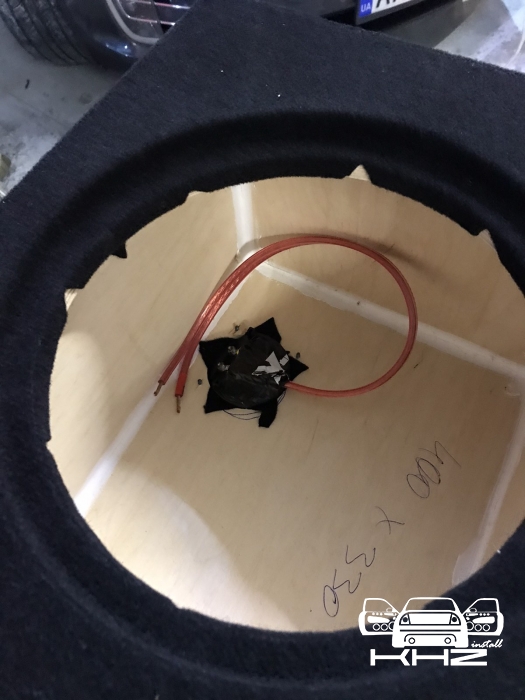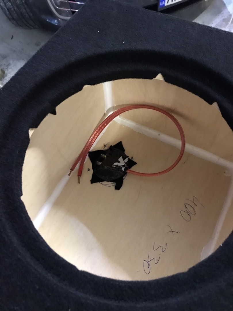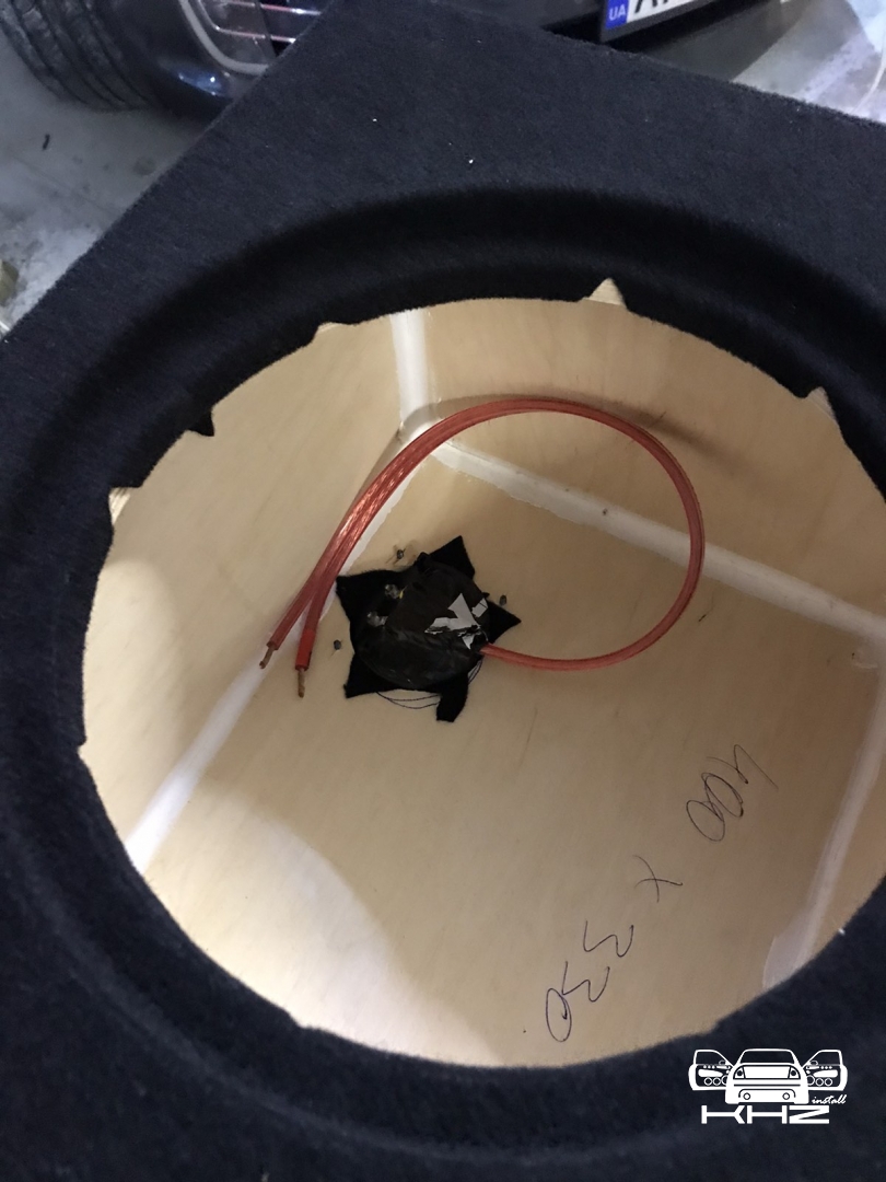 Тим часом відбувалася збірка короба для сабвуфера, в багажнику є ніша в підлозі, яка прикривається планкою, замовник захотів, щоб сабвуфер був там, ми зробили заміри та розпочали виготовлення короба, його ми робили під 25-см сабвуфер, з 15 фанери, з подвійною лицьовою стінкою з утопленням, так він має набагато естетичніший вигляд і менше варіантів пошкодити. Короб ми збираємо за допомогою клею і саморізів, наприкінці промазуємо герметиком на всіх стиках і врізаємо термінал для сабвуфера, щоб його можна було дістати і відключити за потреби.