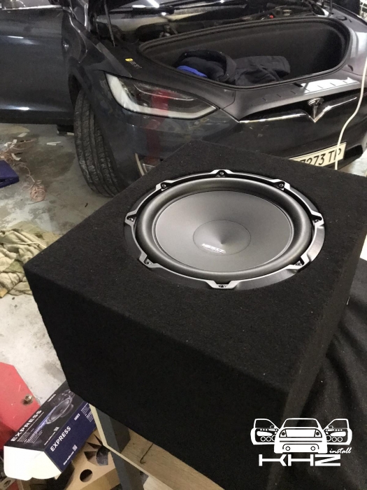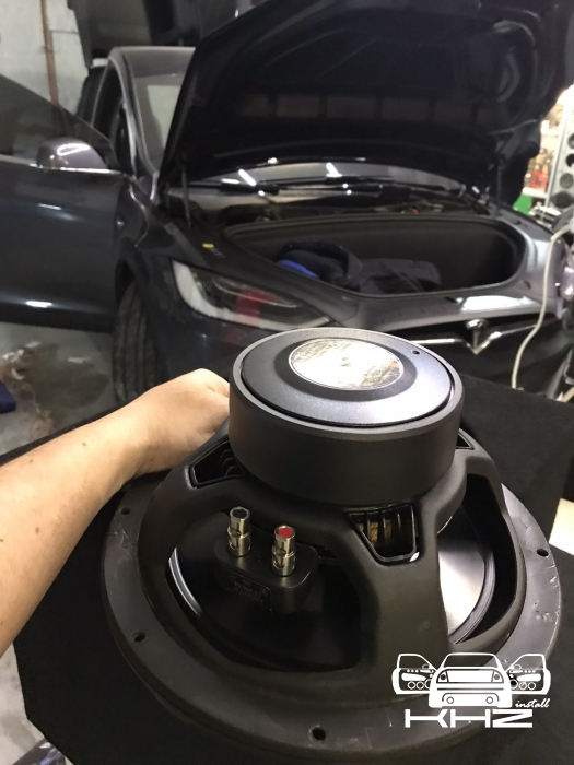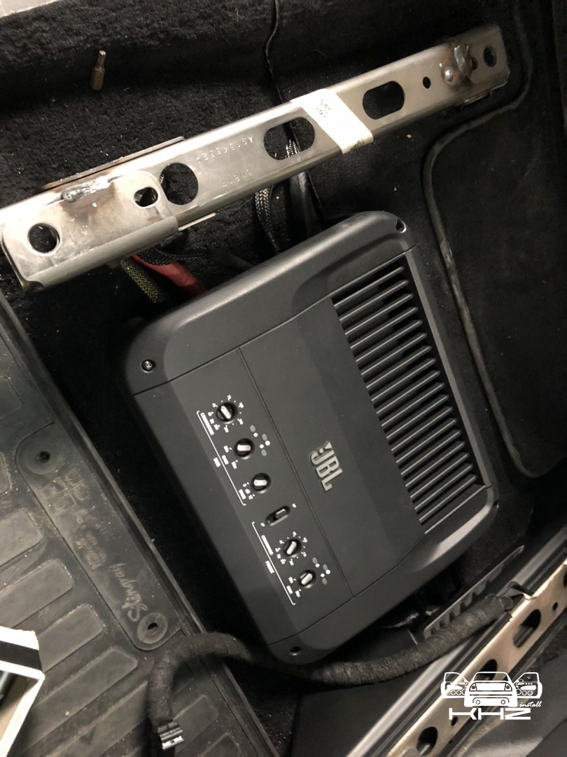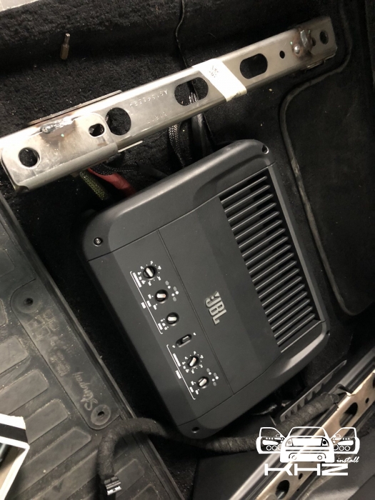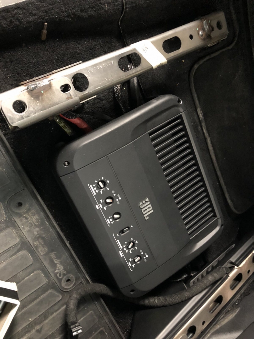 Акустика в Tesla model X встановлена і передні мідбаси чекають на підключення підсилювача звуку, оскільки в такому розмірі і за характеристиками вони потребують потужності, хоча б 50 Вт, щоб розкрити свій потенціал. Підсилювач звуку ми підібрали, так би мовити, старої школи, той, який ще з неурізаною начинкою і відповідає заявленій потужності, а ще в нього є режим автоматичного ввімкнення від подачі сигналу, це дуже зручно і не потребує додаткових адаптерів для активації підсилювача звуку в Тесла Х. А саме 3-канальний підсилювач звуку JBL GTO-3EZ, він дає нам два канали для підсилення акустики та один канал повний на сабвуфер із запасом потужності. Місце для встановлення підсилювача звуку вибрали під пасажирським сидінням, там місця багато, і хороше охолодження буде, і його не видно, підсилювач ми закріпили до килима на липучки та кріплення, проводку покладено всю мідну та із запасом провідності, на силову проводку ми під'єднали тримач запобіжника та запобіжник, щоб захистити проводку від замикання, а також усю проводку покладено в захисне обплетення, щоб уникнути ушкоджень та перетирань. Підсилювач звуку закріплений і під'єднаний, робимо налаштування і збираємо. Сигнал для підсилювача брали з фронтальної акустики.