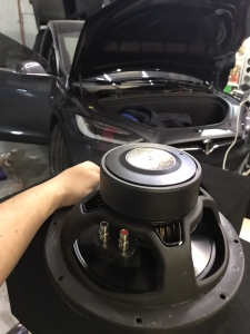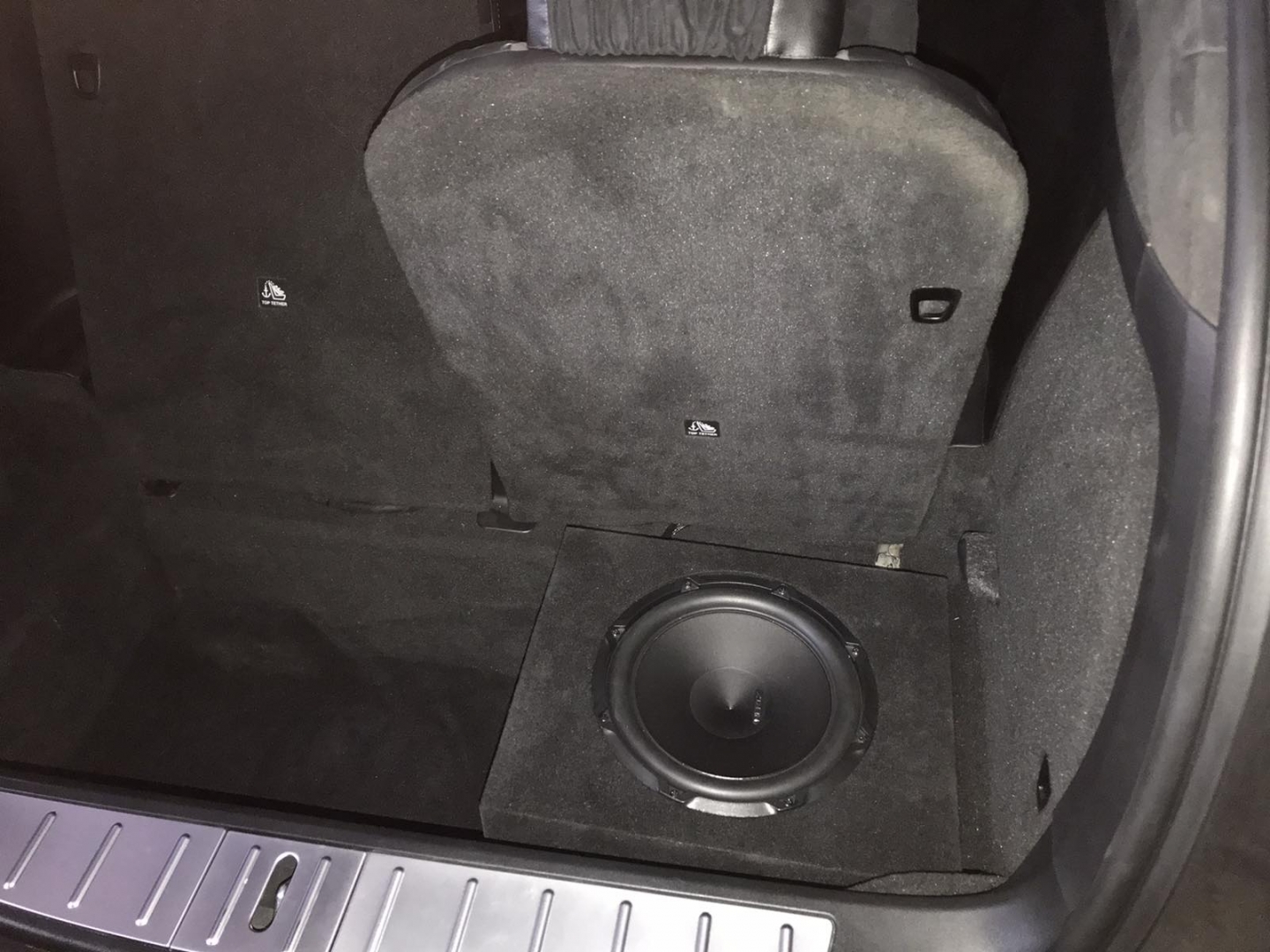 Короб перетягнули в чорний карпет, схожий на обшивку багажника, і настав час сказати кілька слів про сабвуфер, його ми взяли перевірений бренду Hertz з опором 2 Ом, для того щоб мати ще більший запас за потужністю, сабвуфер під'єднали до підсилювача гарним мідним кабелем високого перерізу і закріпили в коробі. Потім короб встановили в ніші багажника, і закріпили за допомогою розпірок і липучок, так щоб його можна було дістати без особливих зусиль. Виглядає це так: