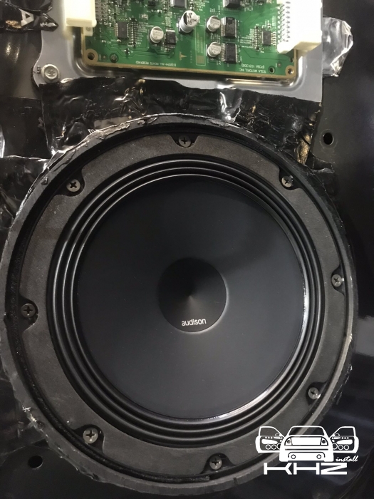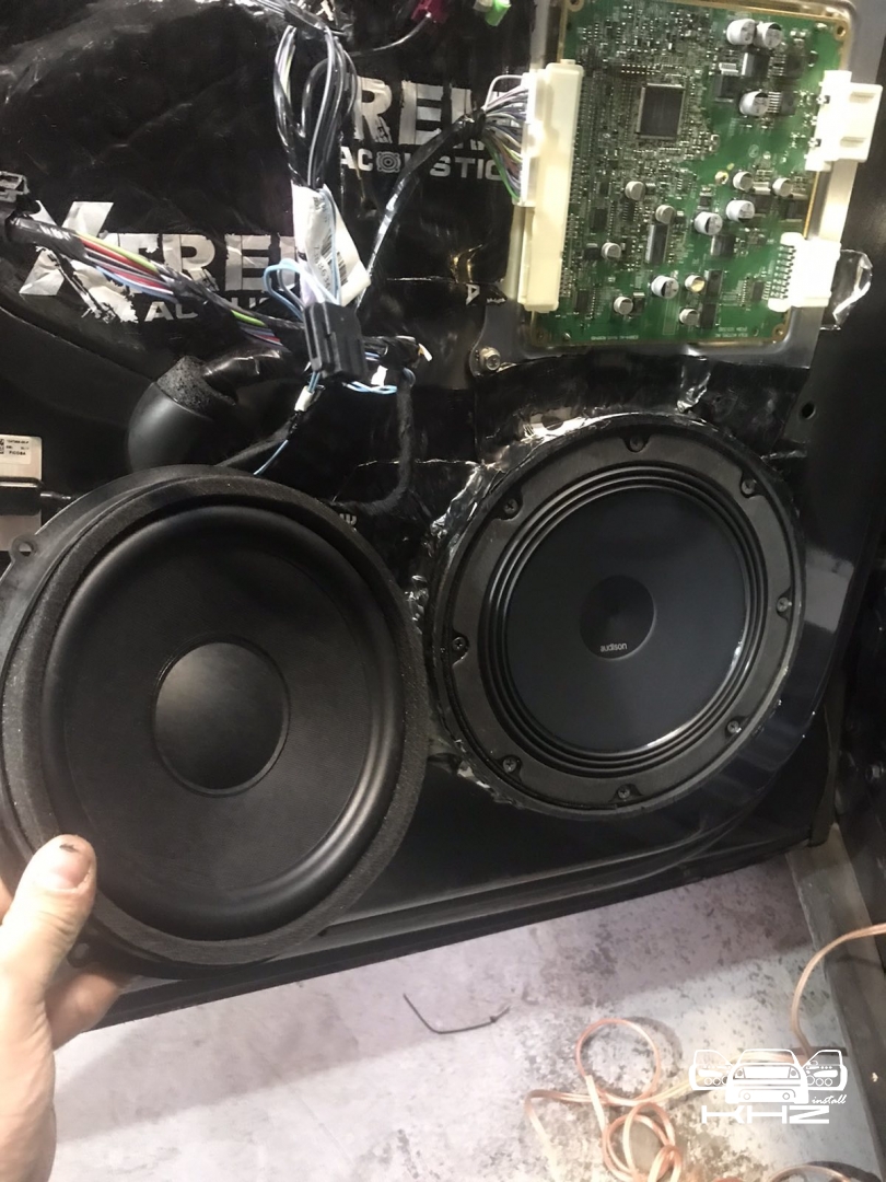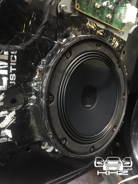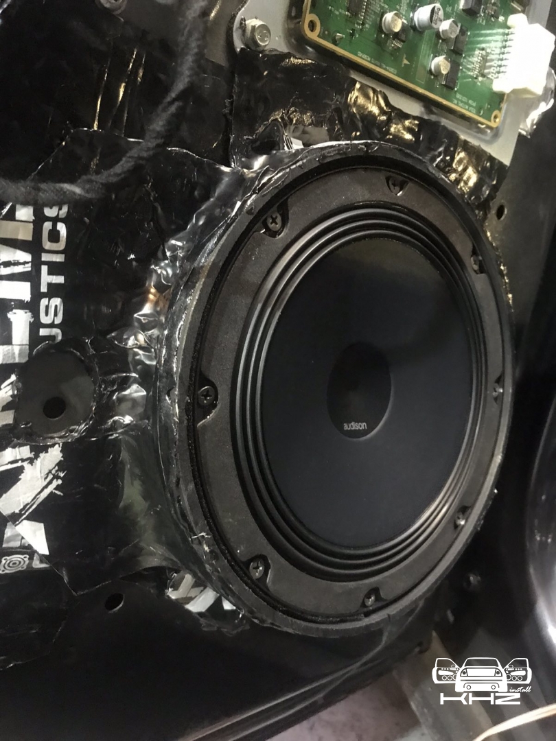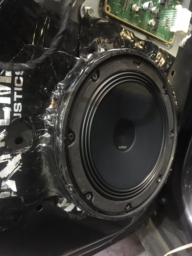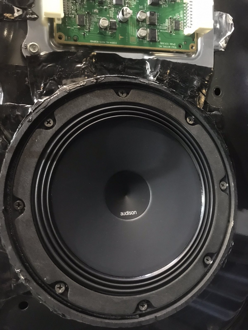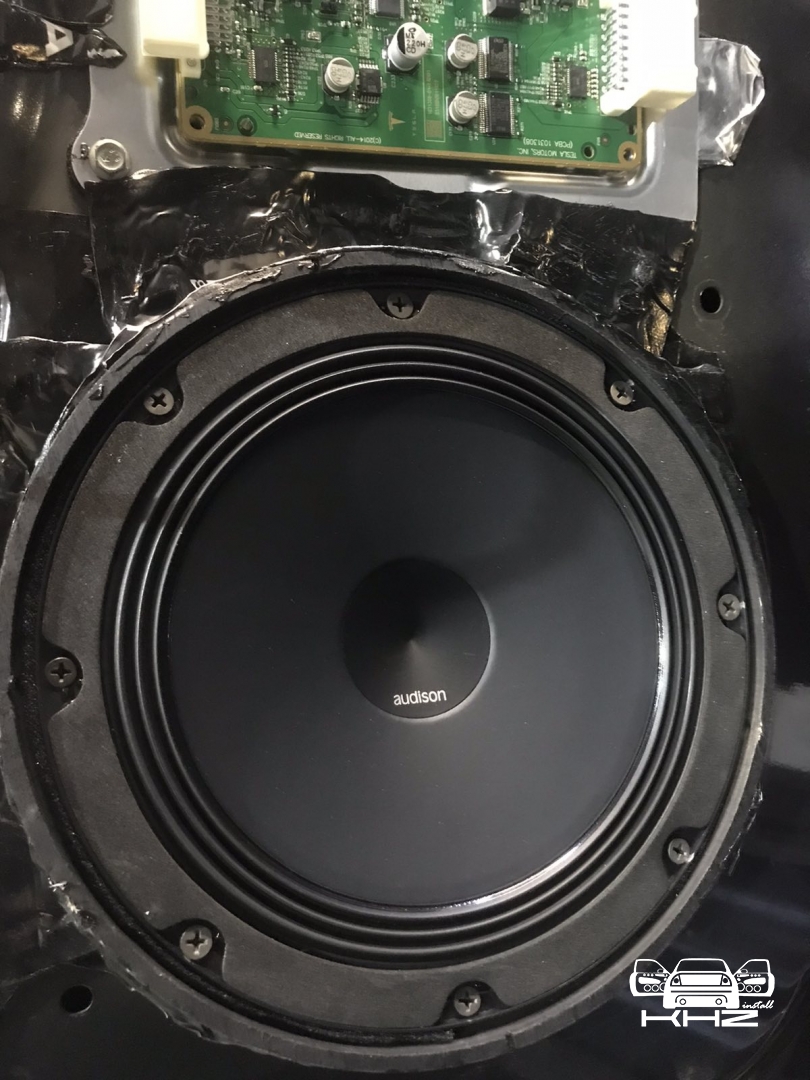 Переходимо до встановлення акустики в Tesla X, і так в передніх дверях з заводу стоять 17см мідбаси, ми вирішили встановити туди 20см мідбаси, щоб питання з низами по фронту вже не було. Ми вибрали перевірені динаміки бренду Audison Італія. Для їхнього встановлення потрібно було виготовити проставочні кільця, оскільки вони більші, ніж штатні, плюс динаміки мають стояти на дерев'яній проставці, так книжка пише. Оскільки у нас були обмежені терміни, ми зробили комбіновану проставку, ще питання в тому, що вони з напрямком вгору. За основу ми взяли штатну проставку, до неї зафіксували фанеру під новий динамік, закріпили в штатне місце і кріплення, потім дуже щільно прикатали віброізоляцією до металу, щоб зміцнити і зробити жорсткіше. Виглядає це так, так само в двері ми завели новий акустичний кабель мідний з гарним перетином, і підключили мідбас до нього, встановлений динамік Audison виглядає так: