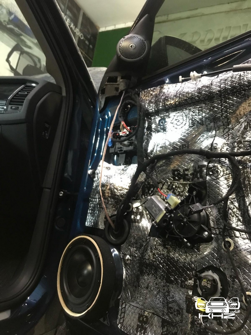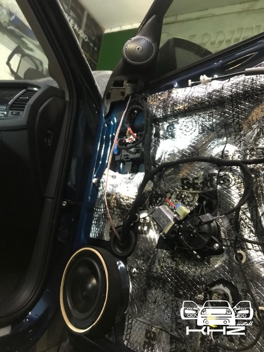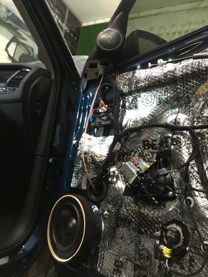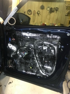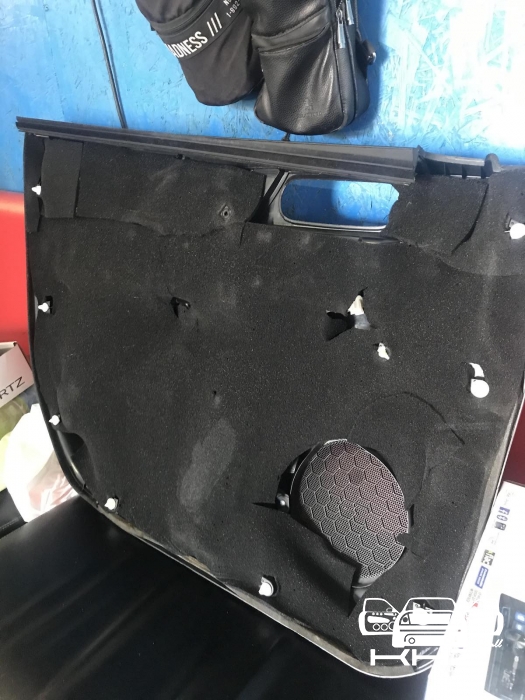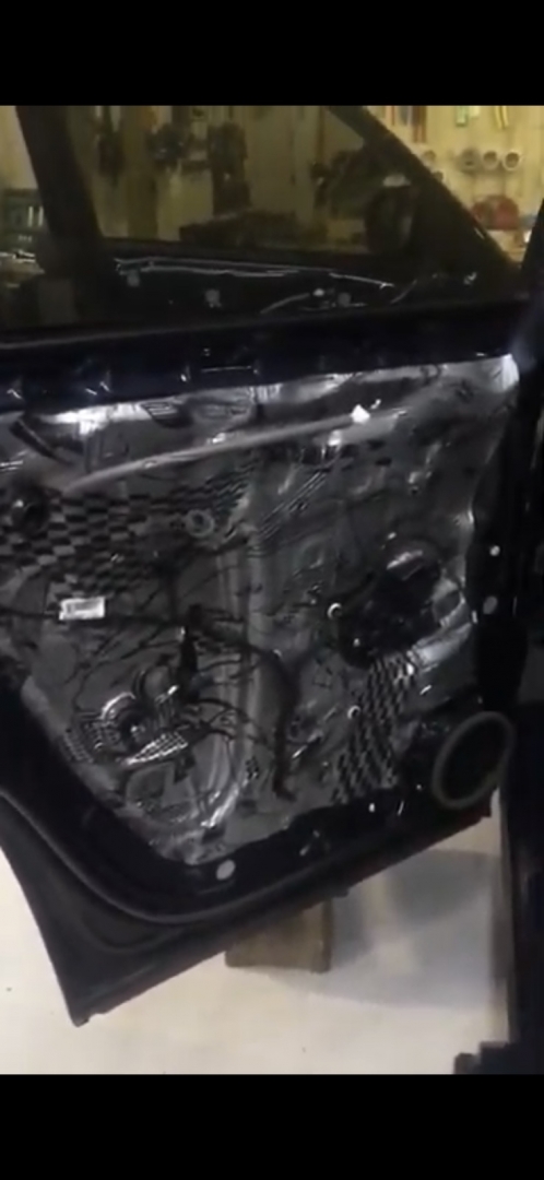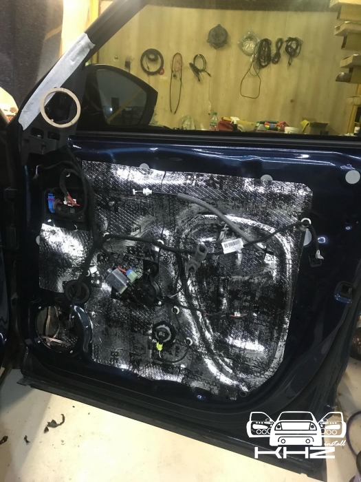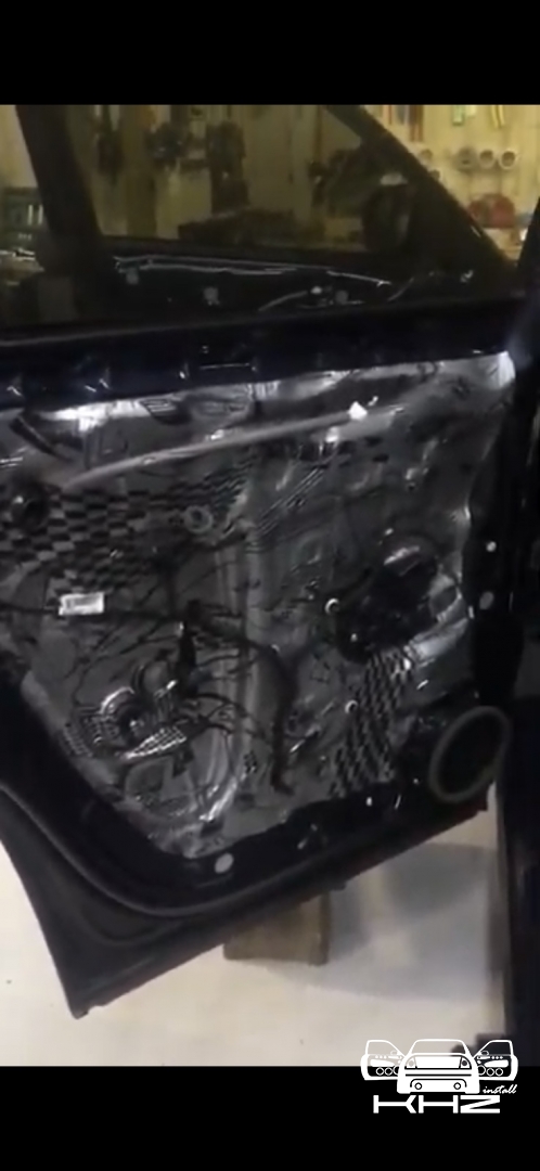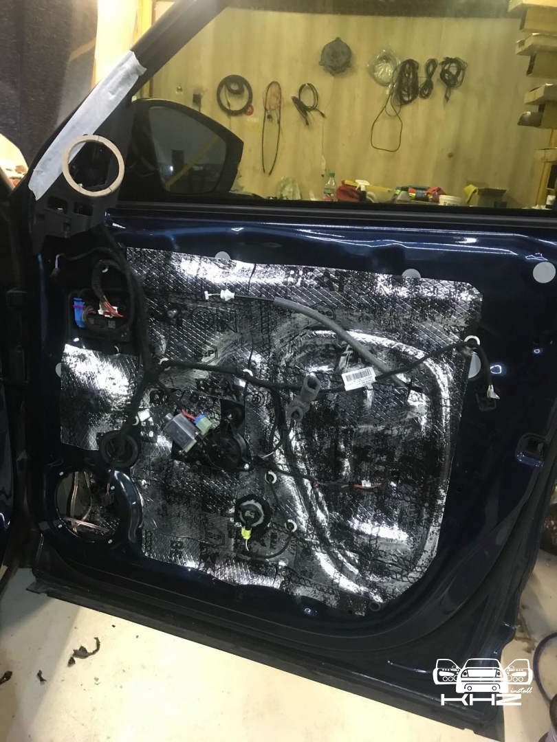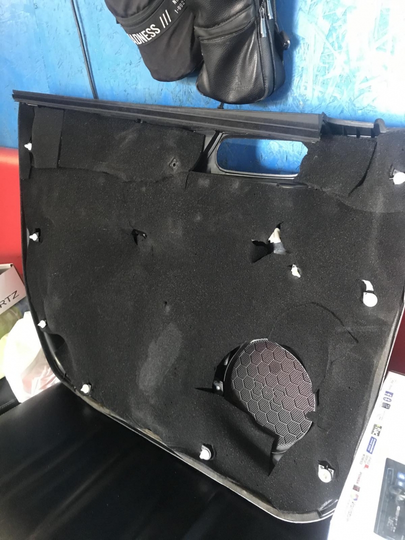 Стартуємо передні двері ми зробили матеріалом STP Beat-on - це жорсткий матеріал, який укладається за допомогою фена, і нагріву - але після застигання він перетворюється на камінь, таким чином ми зміцнимо двері - і зробимо жорсткість, також всередину дверей ми не клеїмо м'який матеріал - так більш краще, при отриманні низьких частот. Мідбас буде більш нижче грати - а м'який матеріал трохи його розпустить. Двері зробили в 3 шари - два шари віброізолятора - і шар на карту м'яких матеріалів, щоб прибрати скрипи і тертя карти об двері. Далі ми проводимо нову мідну акустичну проводку - з високим перетином, щоб не втратити сигнал на довжині кабелю, проводку використовували бренду GLADEN 2,5 мм мідь.