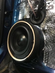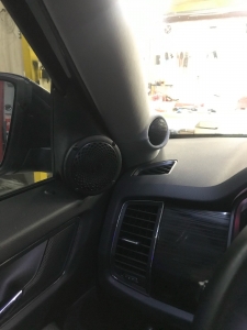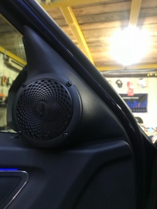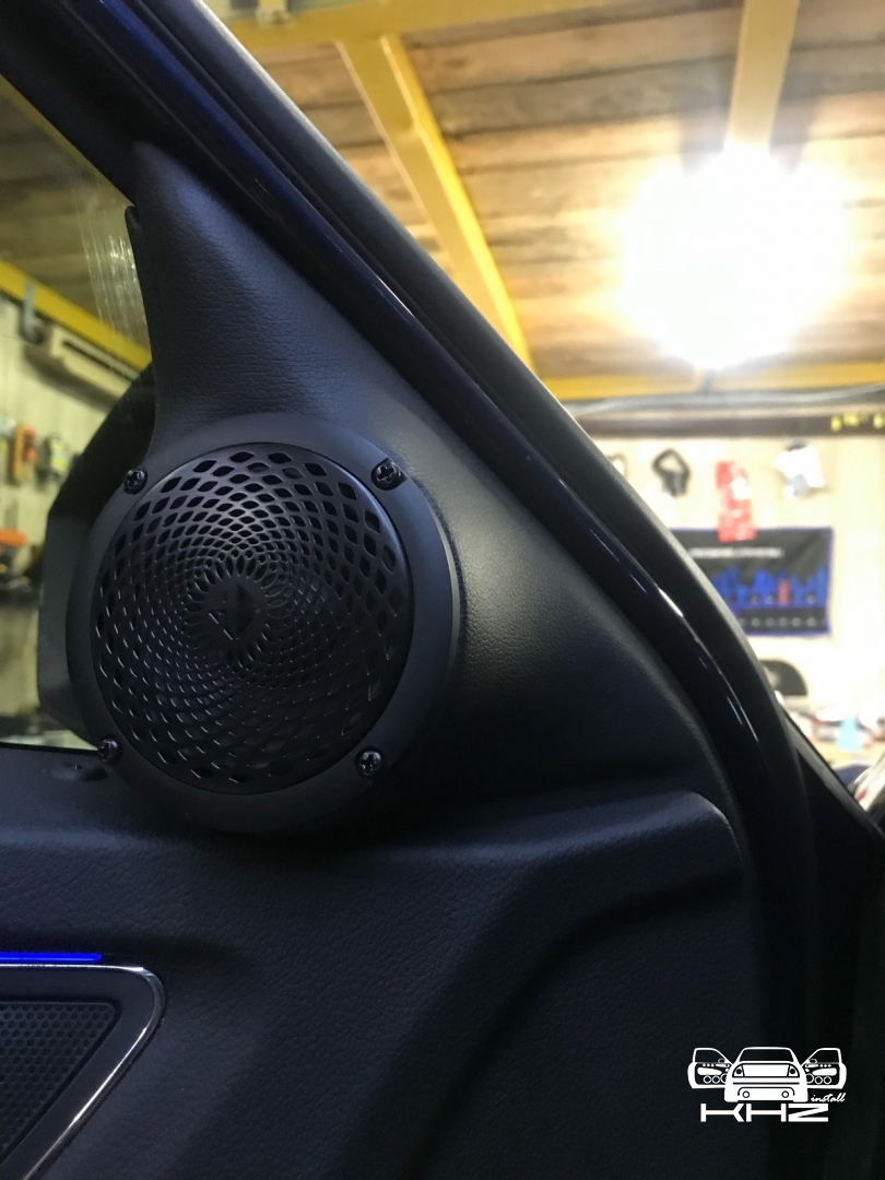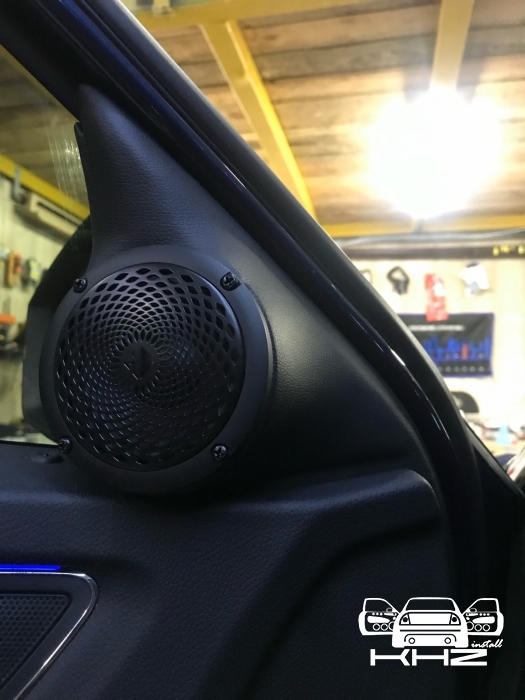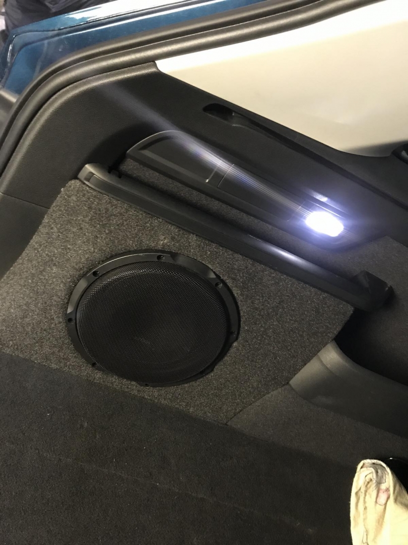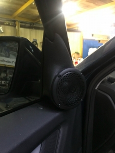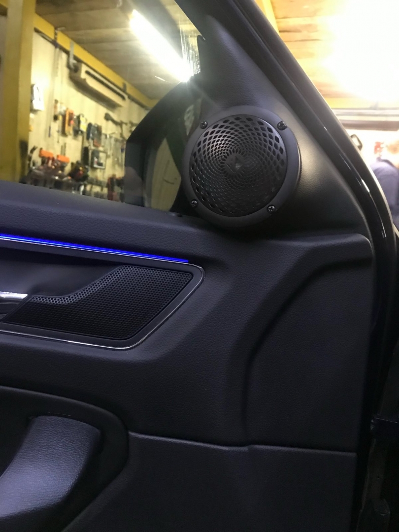 Третя смуга це НЧ динамік - для цієї ланки ми підібрали динамік бренду Helix, оскільки стояло завдання підібрати невеликий і правильний динамік, для реалізації повноцінного середнього діапазону. Для їх встановлення вирішили використовувати куточки в дверях, оскільки вони дуже маленькі - динамік підбирався так само, не габаритний, плюс щоб був непоганий захисний гриль. Для цих динаміків зійде і об'єм куточка, ми їх зняли і прикріпили з дерева проставочний куточок - виставили напрямок, куди вони гратимуть. І приступили до виготовлення, напнули спеціальну тканину і сформували вигляд виробу, далі за допомогою смоли і скломату зміцнили виріб, і перейшли до шліфування, щоб надати гладких форм, під перетяжку шкірзамом. Нагадаю, на кожен такий динамік було проведено нову проводку.