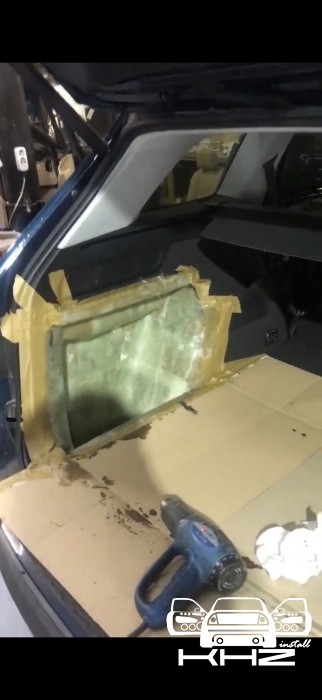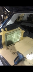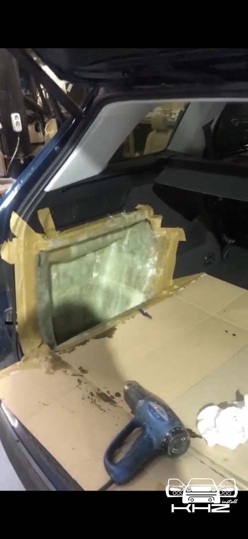 Далі у нас виготовлення сабвуфера в крилі, за типом стелс - оскільки зараз люди цінують вільне місце в автомобілі, дуже часто ми працюємо зі скловолокном і смолою, ми маємо великий досвід у виготовленні анатомічних виробів в крила, і тут це не виняток, ми підготували крило за допомогою скотчів, і нанесли щільний шар смоли і волокна, щоб сформувати так звану матрицю, і чекаємо, поки все висохне. За роки роботи ми настільки автоматизували процес, що робимо такі сабвуфери за 3 повних дні без шкоди якості! У нас завдання зробити короб об'ємом 20 літрів - наше крило дозволяє і ми рухаємося далі.