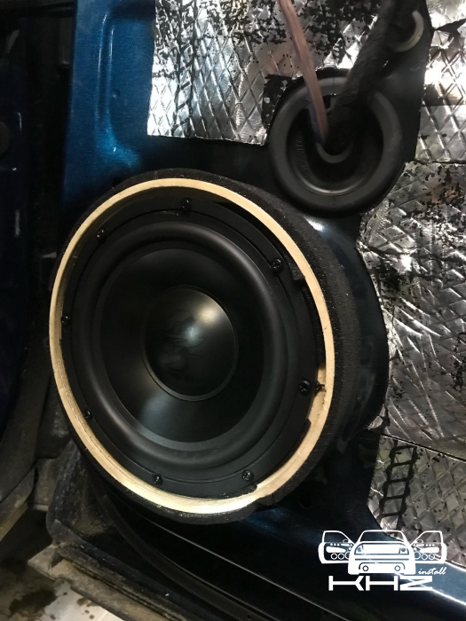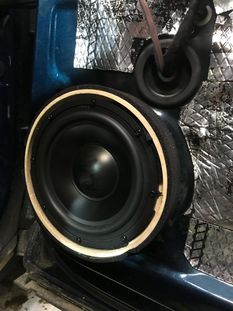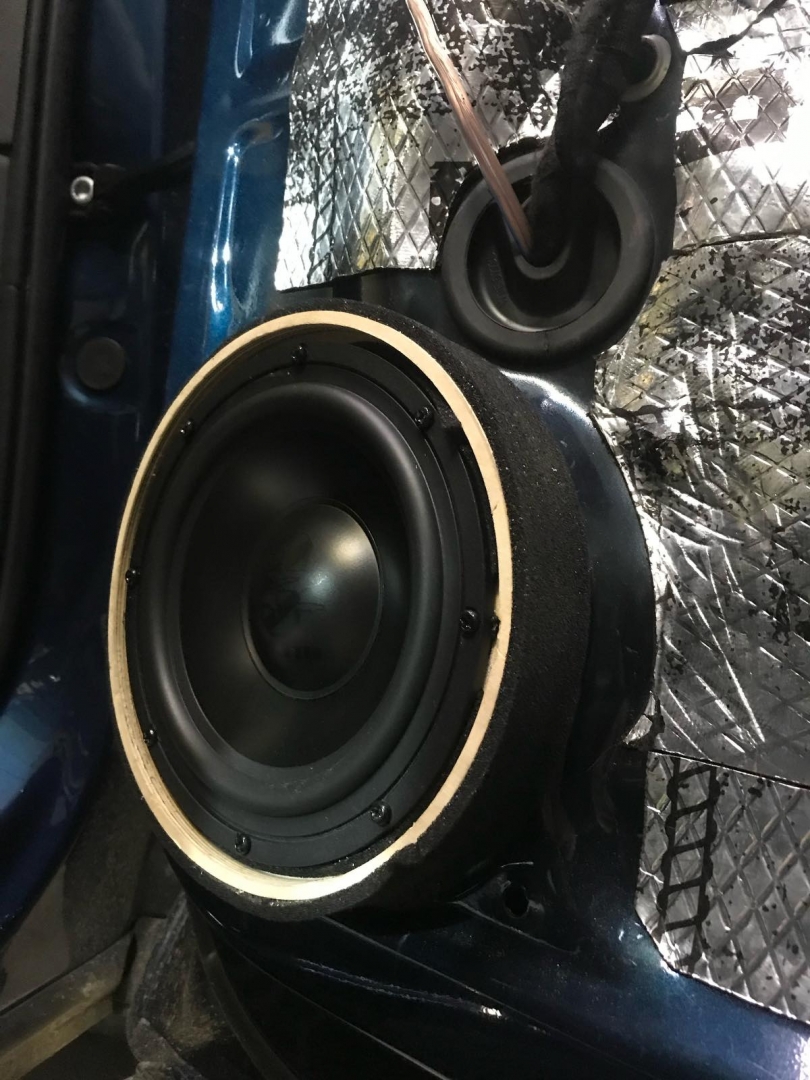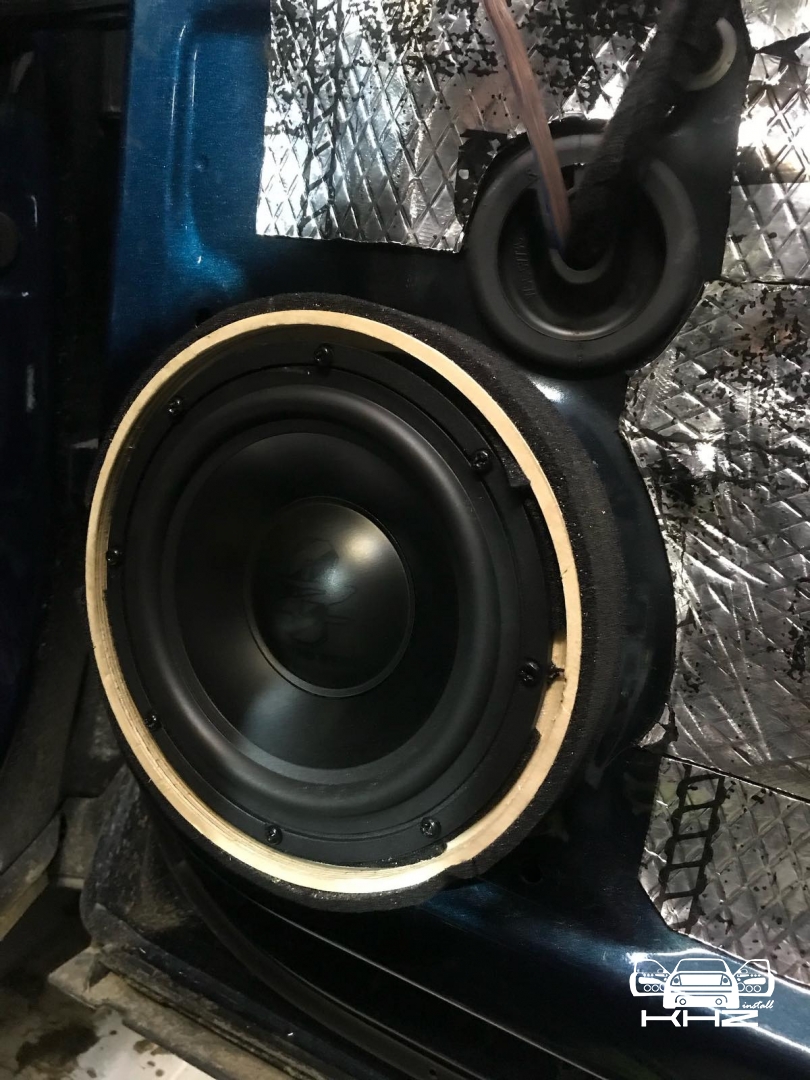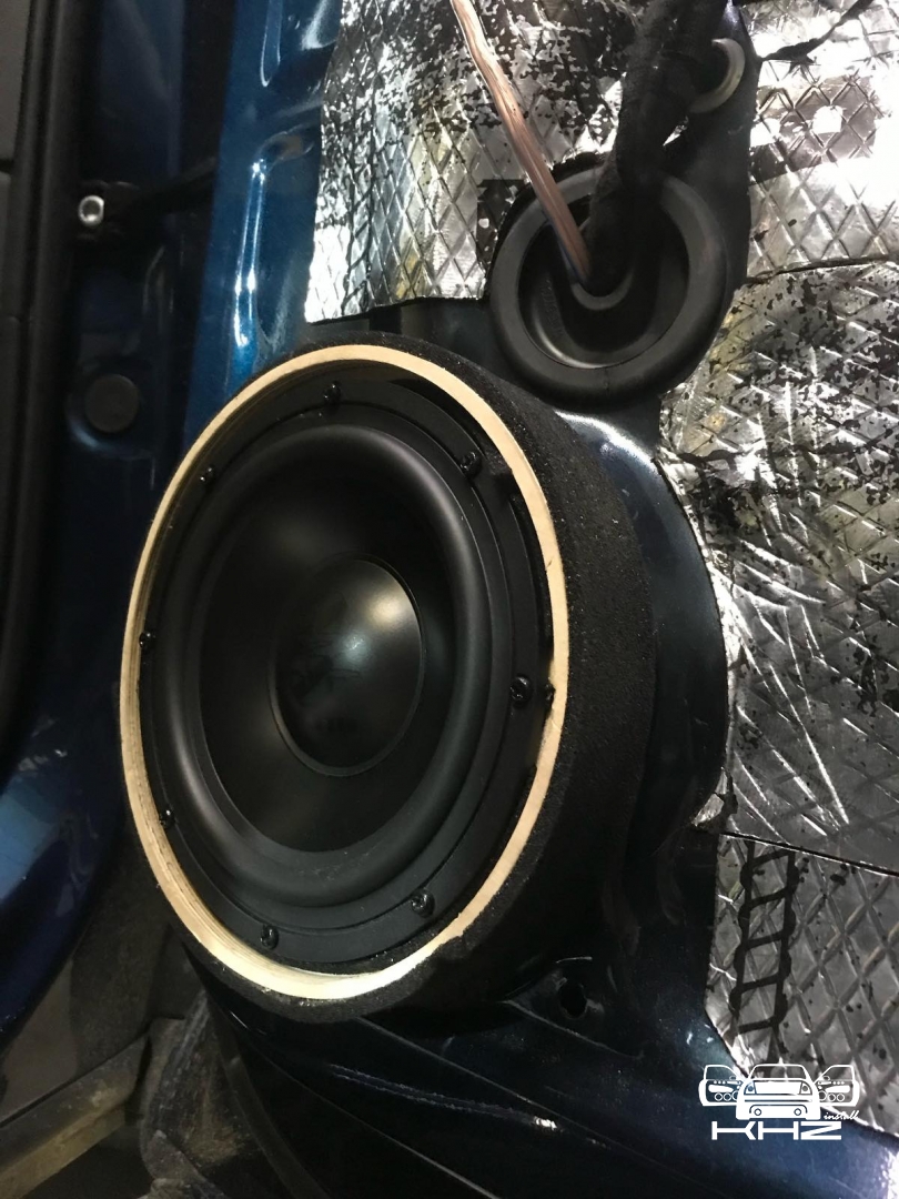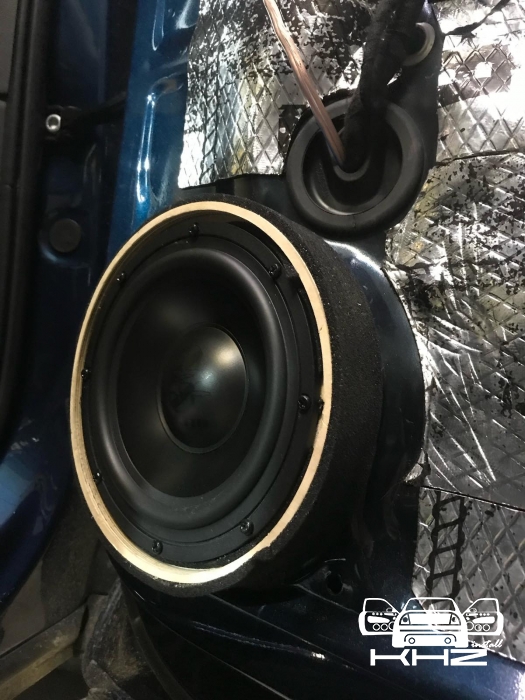 Завели її в двері через фішки, так само встановили проставочні кільця з фанери, зроблені під штатні кріплення, і пофарбовані у фарбу. Проставні кільця з якісної фанери - в них ми встановили підібрані нами мідбаси - це найкращі мідбаси за версією EISA 2021 рік, це GZUK 165SQ, ці динаміки - чудовий варіант для побудови SQ систем. Мідбаси закріпили і підключили, тепер вони стоять на своїх місцях.