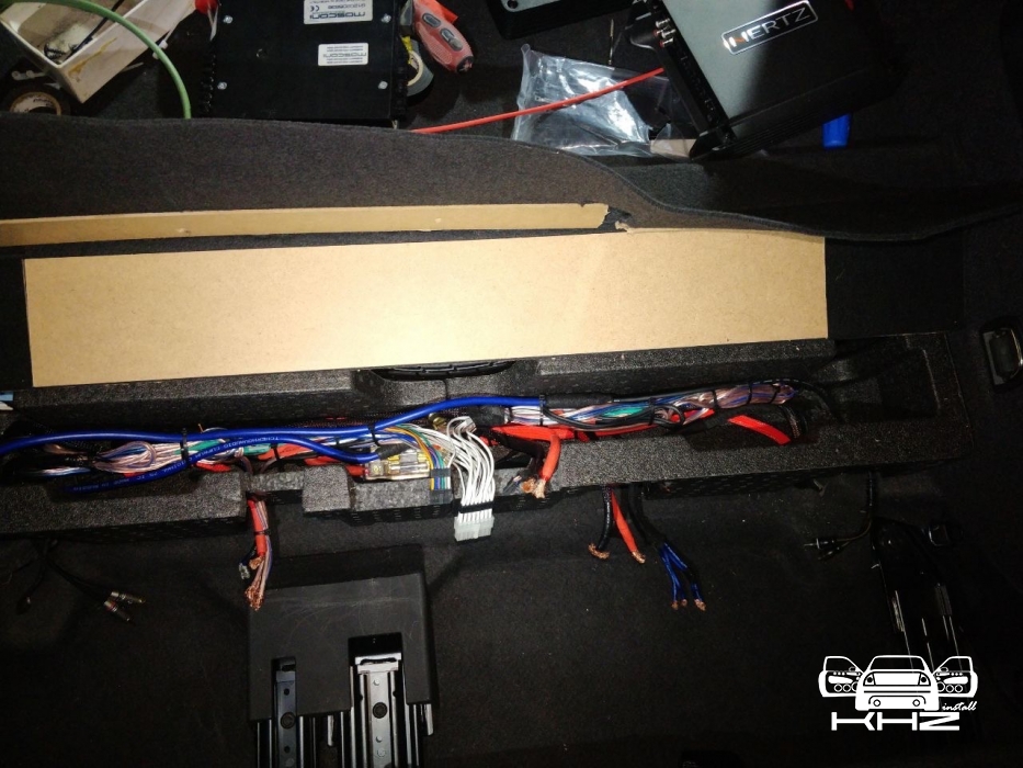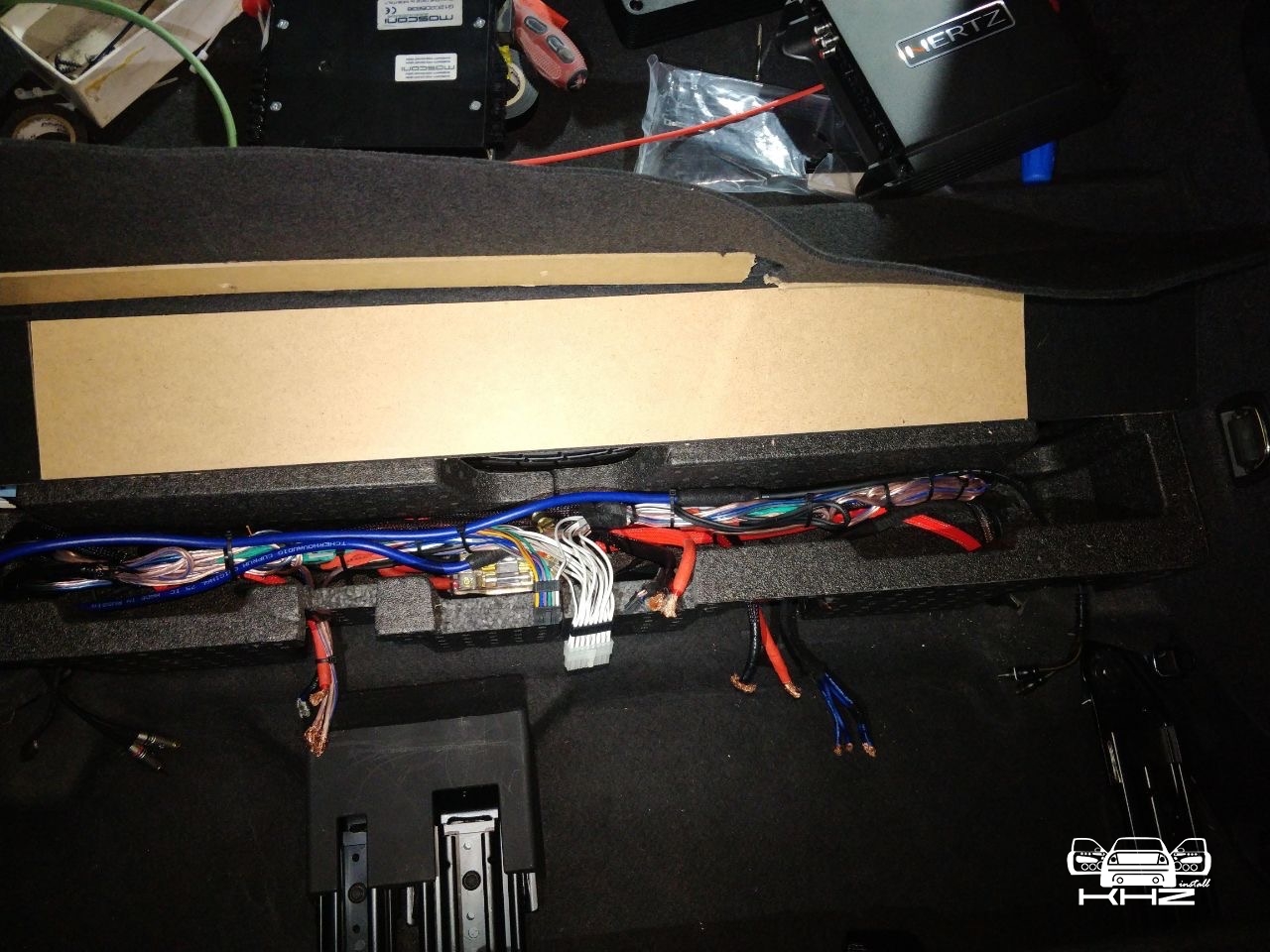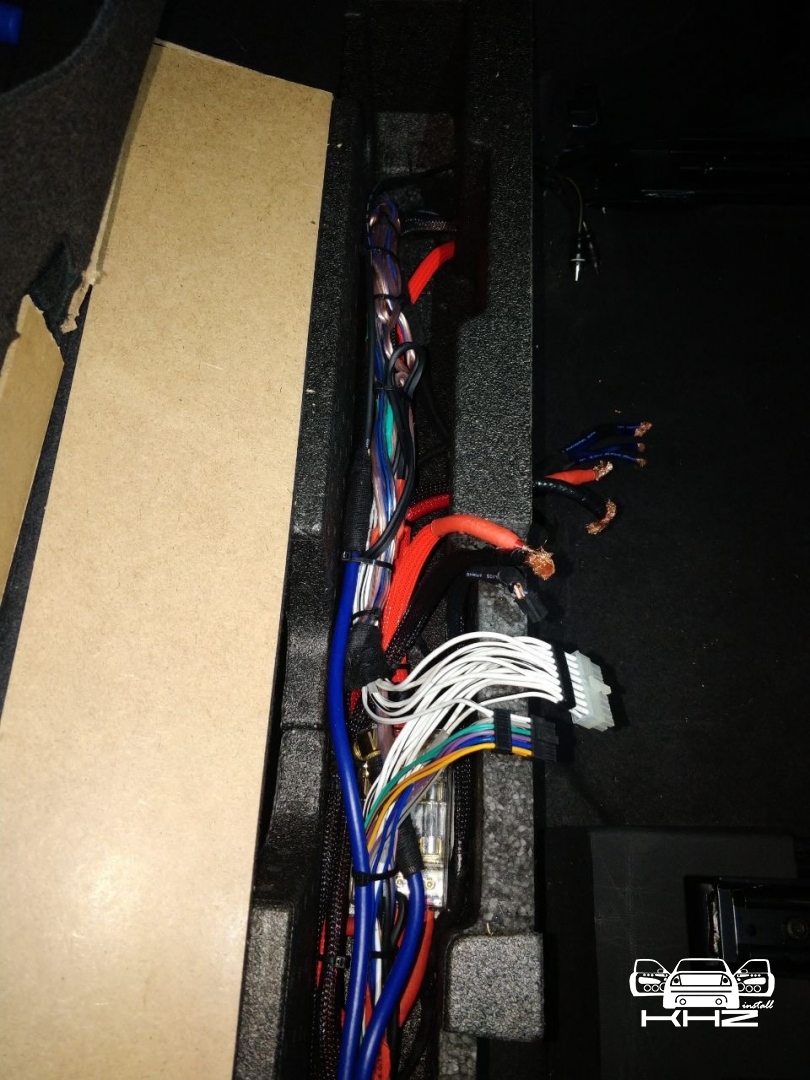 З установкою акустики вSkoda Kodiaq закінчили, переходимо до підсилювачів звуку, спочатку концепція була дуже мізерна, оскільки не було моноблока для сабвуфера, а був 8-ми канальний процесорний підсилювач Audison, і 2-х канальний Mosconi на сабвуфер - але тут було багато компромісів, процесорний підсилювач повноцінно не міг розгойдати мідбаси і для них потрібен був окремий підсилювач, а 3-х канальки було замало для сабвуфера - без третього підсилювача не обійтися, і було ухвалене рішення про доустановлення моноблока для сабвуфера - це реально розв'язало нам руки в плані реалізації по правильній кожній ланці. Підсилювач для сабвуфера Skoda Kodiaq вибрали Hertz HCP 1D - це гарний і потужний підсилювач Д класу, в компактному виконанні, так само доустановили на нього регулятор сабвуфера. Всі три підсилювача ми розмістили за задніми сидіннями, там є ніша між багажником і сидіннями, там у ряд у нас стало три підсилювачі звуку в Skoda Kodiaq і розподільник живлення для розводки проводки між ними - від акумулятора, не всі фото збереглися, але, гадаю, вам буде зрозуміло, де вони розмістилися.