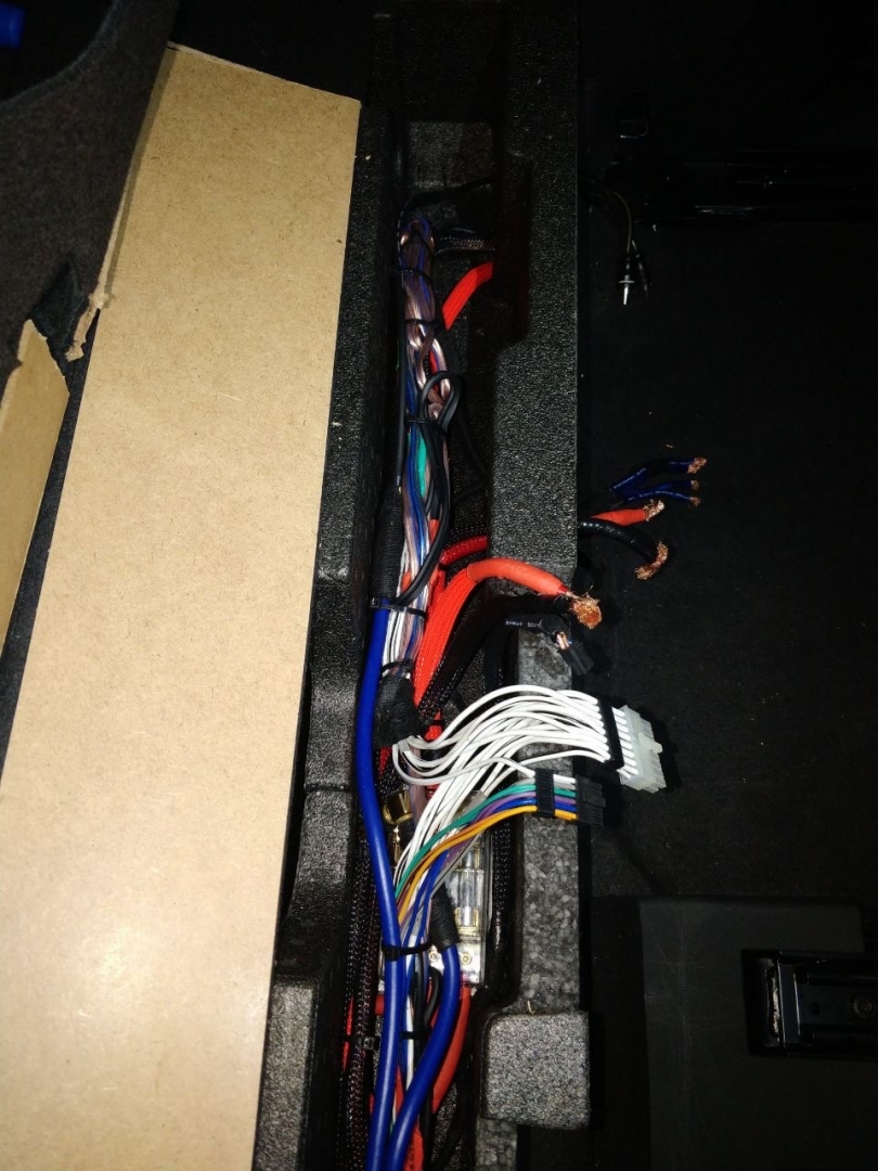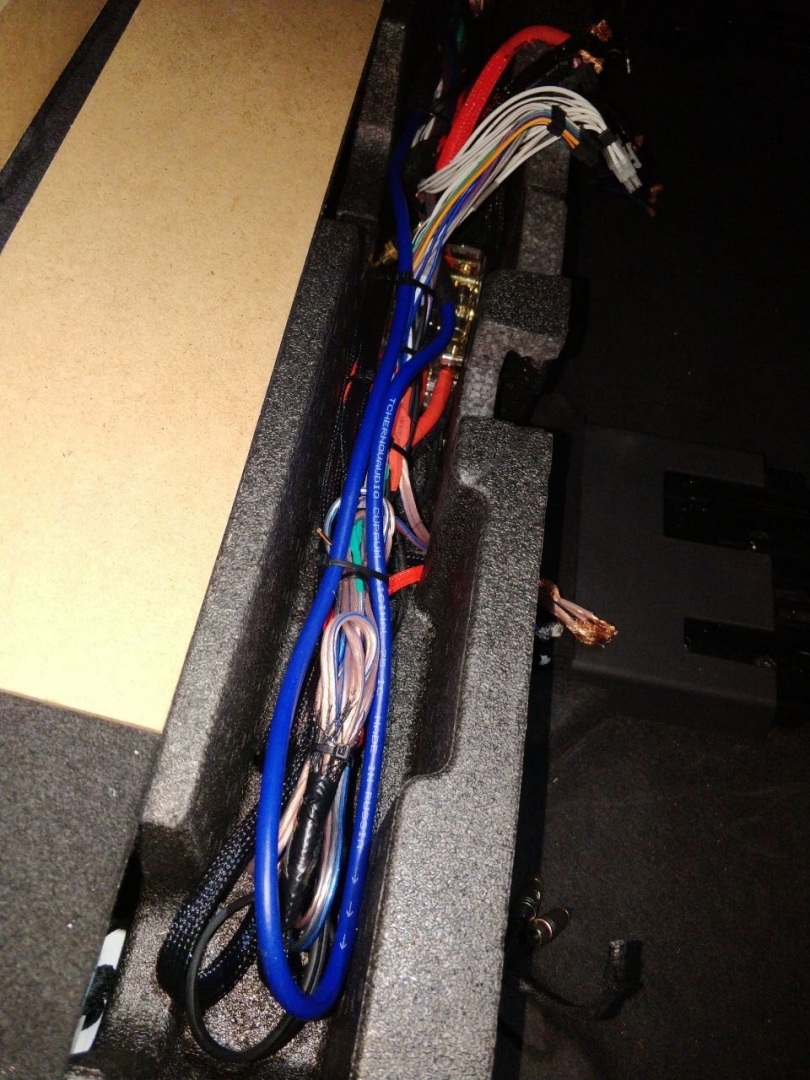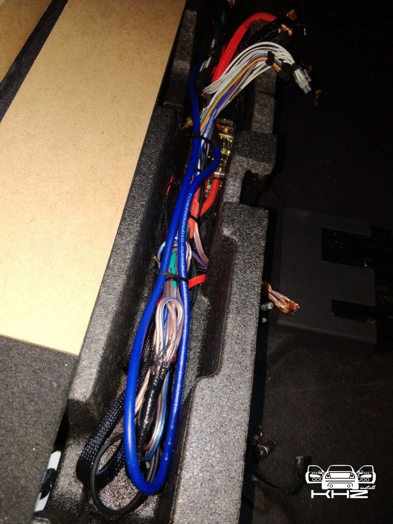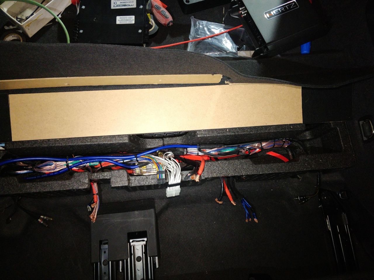З установкою акустики вSkoda Kodiaq закінчили, переходимо до підсилювачів звуку, спочатку концепція була дуже мізерна, оскільки не було моноблока для сабвуфера, а був 8-ми канальний процесорний підсилювач Audison, і 2-х канальний Mosconi на сабвуфер - але тут було багато компромісів, процесорний підсилювач повноцінно не міг розгойдати мідбаси і для них потрібен був окремий підсилювач, а 3-х канальки було замало для сабвуфера - без третього підсилювача не обійтися, і було ухвалене рішення про доустановлення моноблока для сабвуфера - це реально розв'язало нам руки в плані реалізації по правильній кожній ланці. Підсилювач для сабвуфера Skoda Kodiaq вибрали Hertz HCP 1D - це гарний і потужний підсилювач Д класу, в компактному виконанні, так само доустановили на нього регулятор сабвуфера. Всі три підсилювача ми розмістили за задніми сидіннями, там є ніша між багажником і сидіннями, там у ряд у нас стало три підсилювачі звуку в Skoda Kodiaq і розподільник живлення для розводки проводки між ними - від акумулятора, не всі фото збереглися, але, гадаю, вам буде зрозуміло, де вони розмістилися.