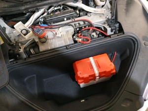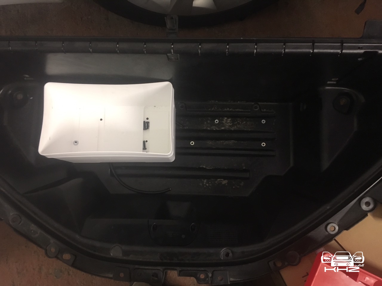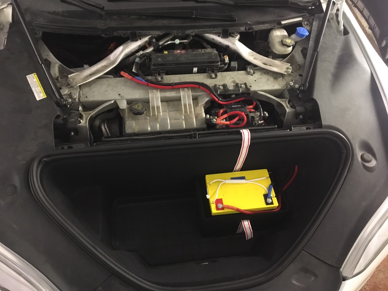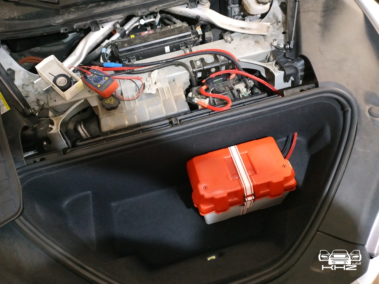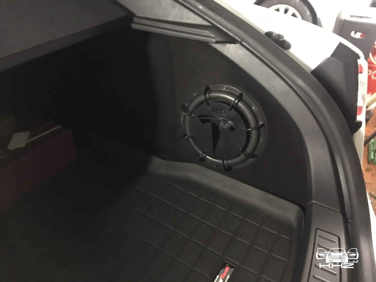 Друзі ми встановили підсилювачі та акустику, задню акустику ми не чіпали, так як вона буде чисто для підзвучки, так як система цілеспрямована на водія! Так само після встановлення цієї системи споживання енергії зросло в рази, тому, щоб не перевантажувати маленький акумулятор автомобіля Tesla Model S, було ухвалено рішення додати ще один якісний тяговий AGM акумулятор, щоб уникнути просадок і постійному навантаженні пускового акумулятора, ми провели мідні дроти від заводського підсилювача і запаралелили їх, а ще встановили спеціальний кейс для акумулятора Tesla S, і закріпили його в ніші під капотом. Спочатку бокс був біло-червоного кольору, але замовник попросив зробити його чорним, зробили)) Закріпили кейс добре за допомогою спеціальних кріплень.
