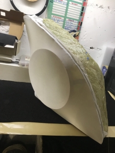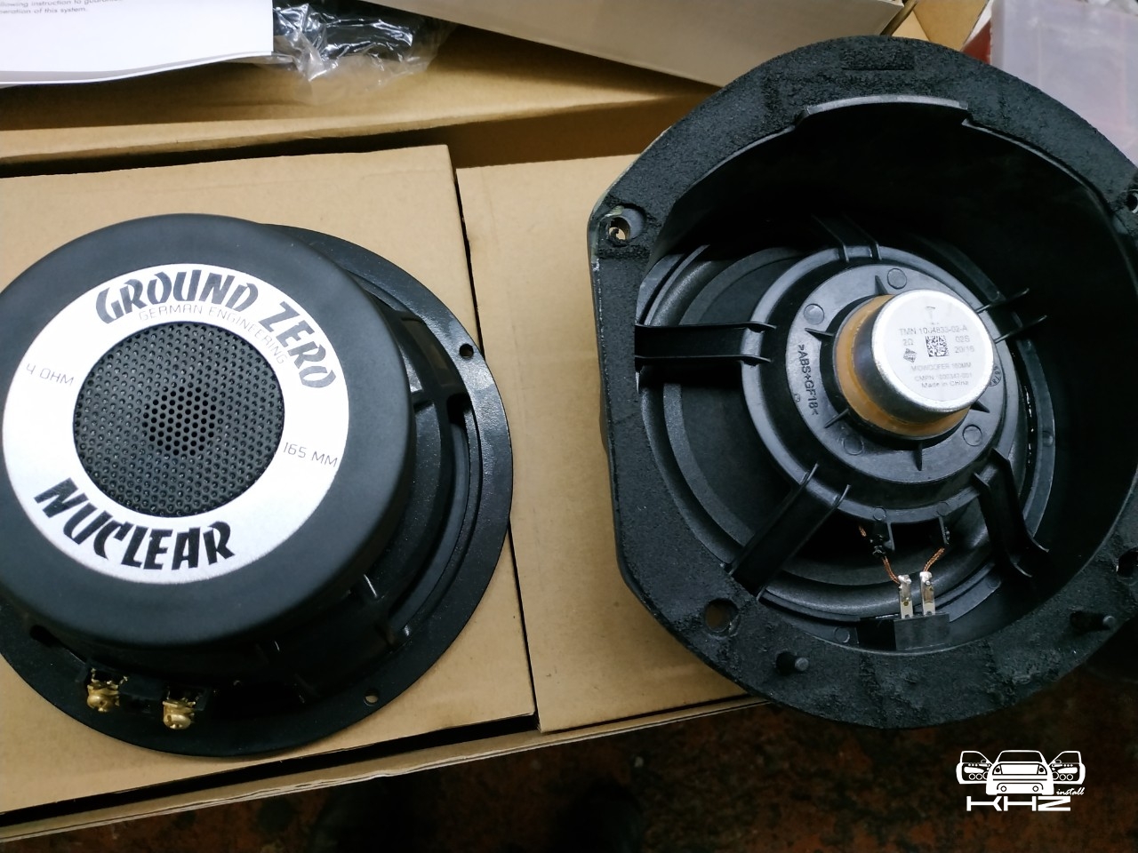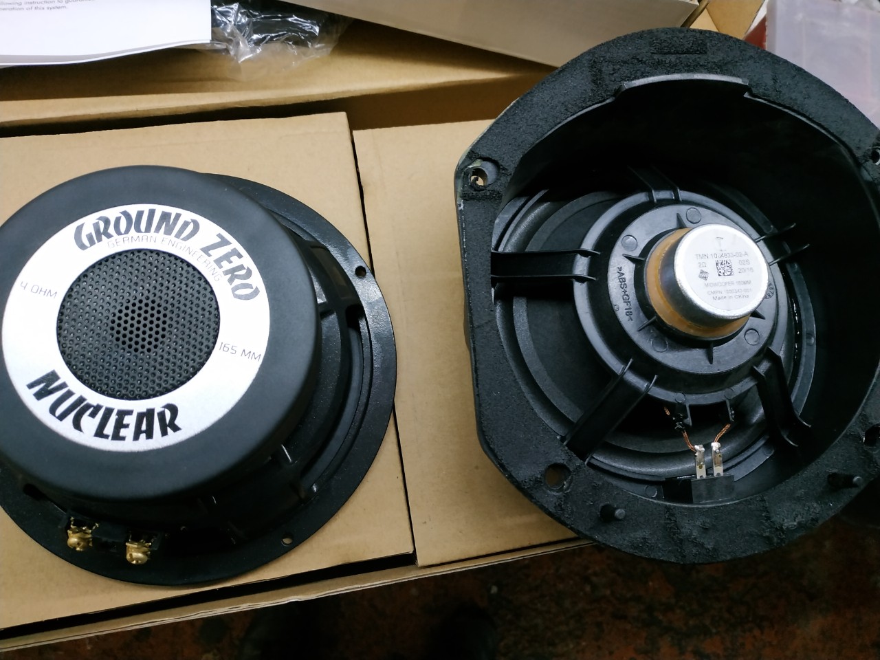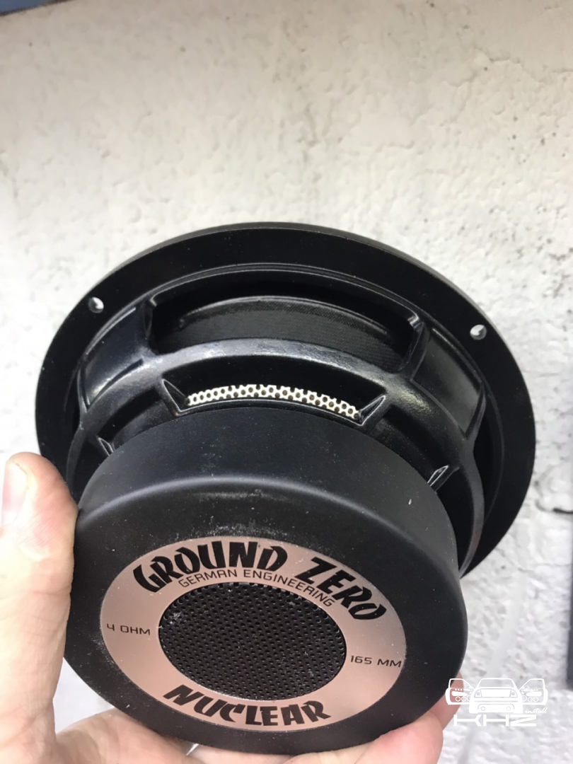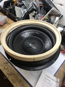 Це одні з найкращих мідбасів, які ми чули, це преміальна лінійка акустики від Ground Zero, а саме Ground Zero GZNK 165SQ, ще великий плюс даних мідбасів - це дуже низька резонансна частота, це означає, що вони будуть дуже добре відтворювати низькі частоти. Дані динаміки ми ретельно підбирали до нашої системи, так само хочемо сказати що система побудована на по-канальному підключенні, через процесорний підсилювач звуку. Фронтальна акустика буде встановлюватися 3-х компонентна, що складається з мідбасів, СЧ динаміків в торпедо і твітерами в стійках. Далі ми виготовили спеціальні проставочні кільця з фанери і скловолокна, так щоб максимально спрямувати мідбас догори, виглядають вони ось так:
