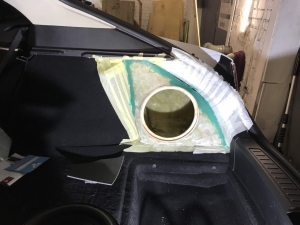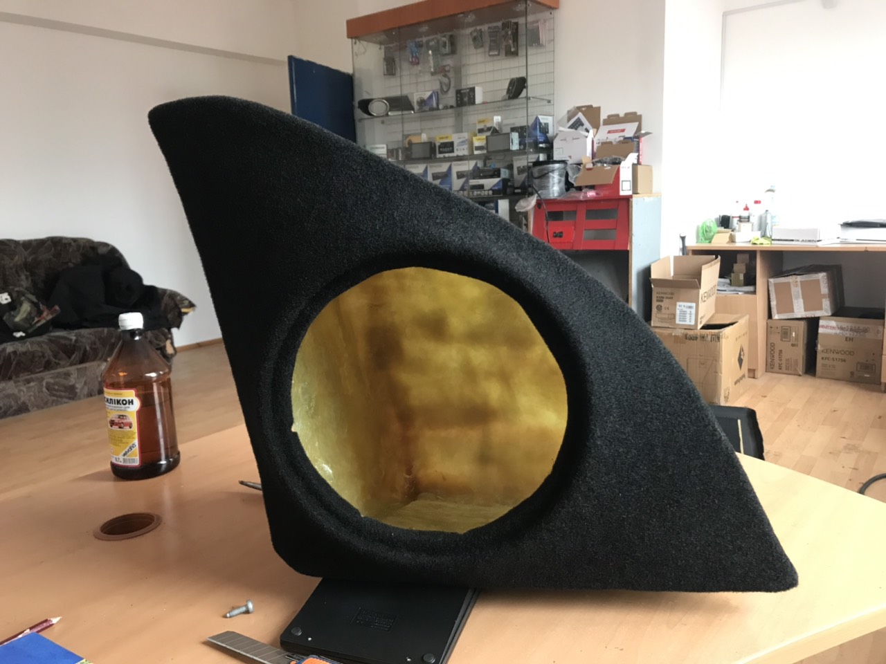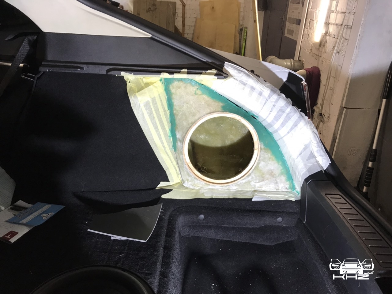 Як бачите він там дуже гарно розташувався, нам він вже подобається) Коли ми вже набили потрібну товщину та вивели в ідеал лицьову стінку та зазори, переходимо до перетяжки дорогим карпетом, який максимально схожий на штатну обшивку багажника.