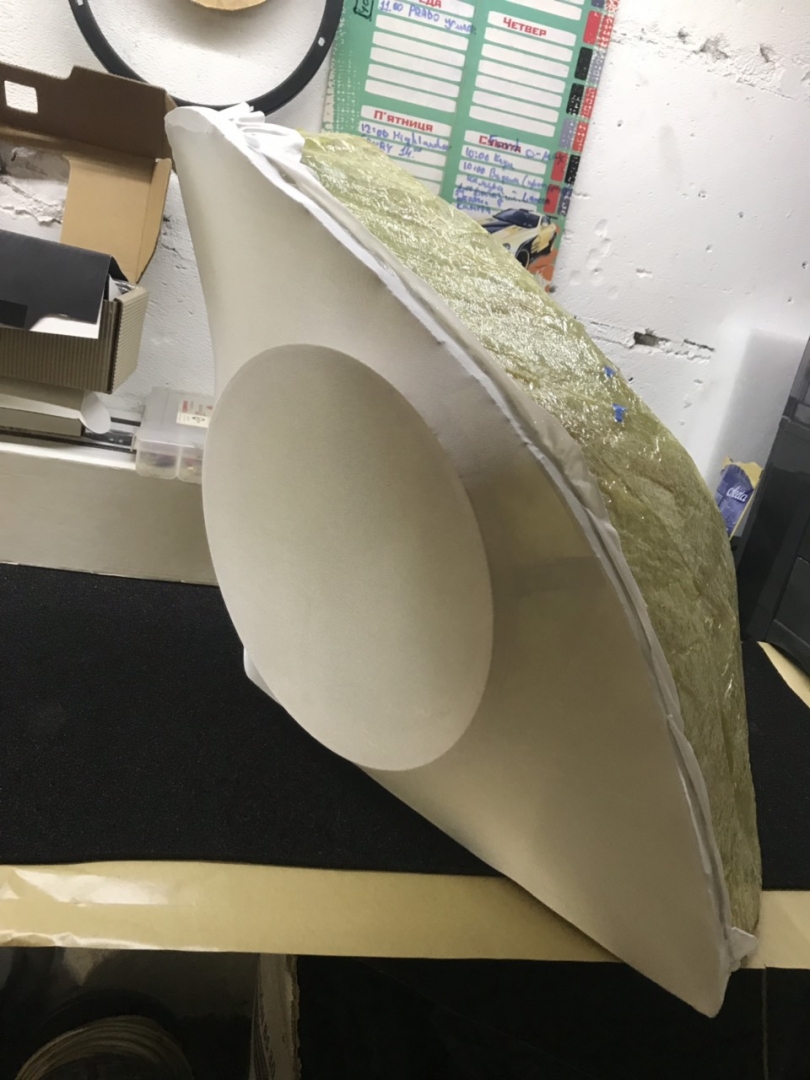 Рухаємося далі по сабвуферу стелс в Tesla S, обрізаємо зайве, встановлюємо посадкове кільце і натягуємо лицьову стінку, ось такий вигляд має новий етап виготовлення анатомічного корпусу. Сформувавши і зміцнивши лицьову стінку зсередини, переходимо до наведення зазорів і шпаклювання лицьової стінки.