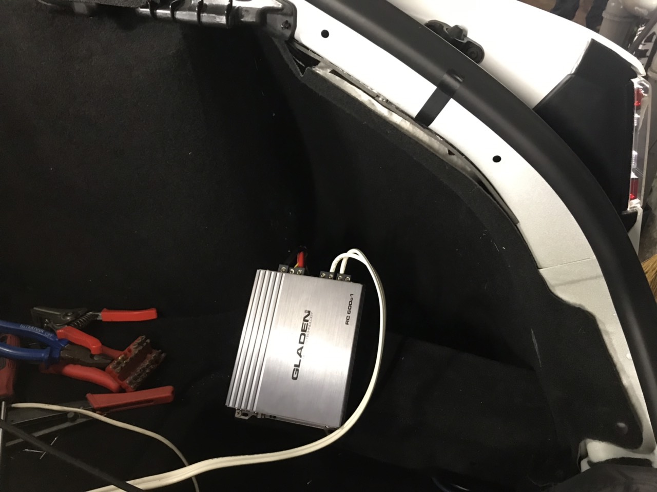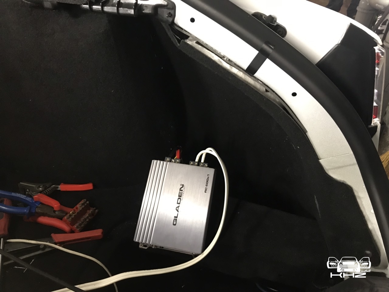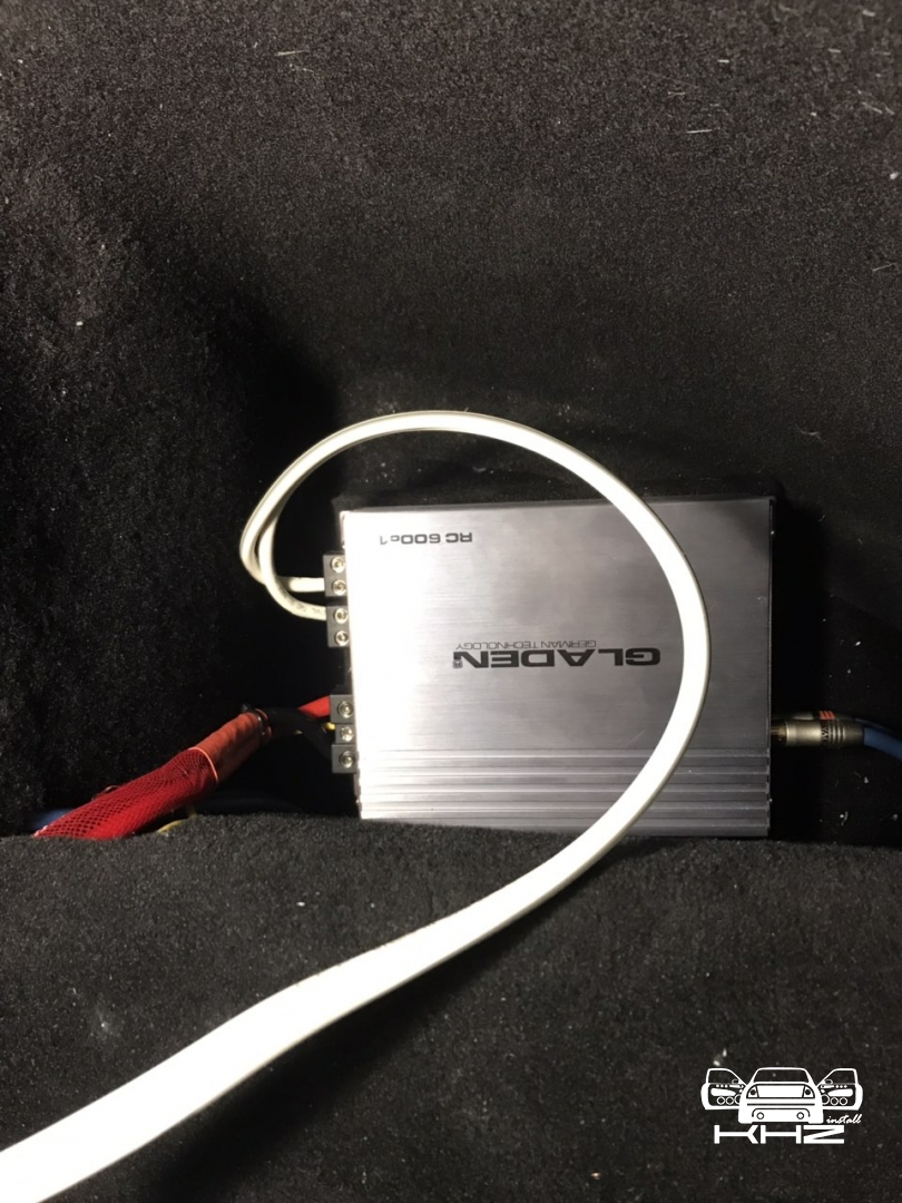 Міжкюлочні дроти ми виготовили самі, з якісного кабелю і хорошими конекторами, а також високоякісною пайкою всього цього. Для під'єднання другого підсилювача звуку, ми провели проводку в багажник, як силову, так і керуючу, другий підсилювач ми розмістили в правій ніші в глибині на подіумі, який закріпили на якісних липучках, даний підсилювач звуку буде розміщено під майбутнім сабвуфером стелс, підсилювач звуку був іменитої фірми Gladen RC600C1 і мав потужність 360 Вт в 4 Ом і 560 Вт в 2 Ом.