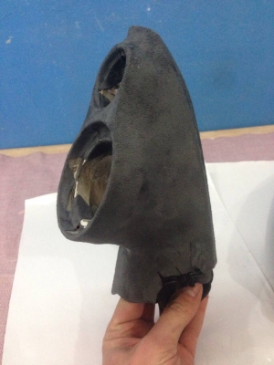 Розповімо вам про дуже тонку і красиву роботу з виготовлення стійок під середньочастотники і пищалки. Наш подіум буде розміщено на куточках, там де у замовника стоять штатні твітера. Зі спеціального матеріалу вирізаємо форму у вигляді вісімки, все вирізається акуратно і педантично, далі ми виставляємо наш виріб на куточок, за допомогою дерев'яної проставки, і зміцнюємо її шпаклівкою, для міцності конструкції, і натягаємо панчоху, граніці відокремлюємо гумками. Виглядає виріб так: